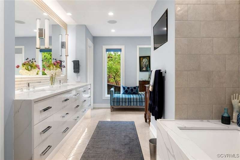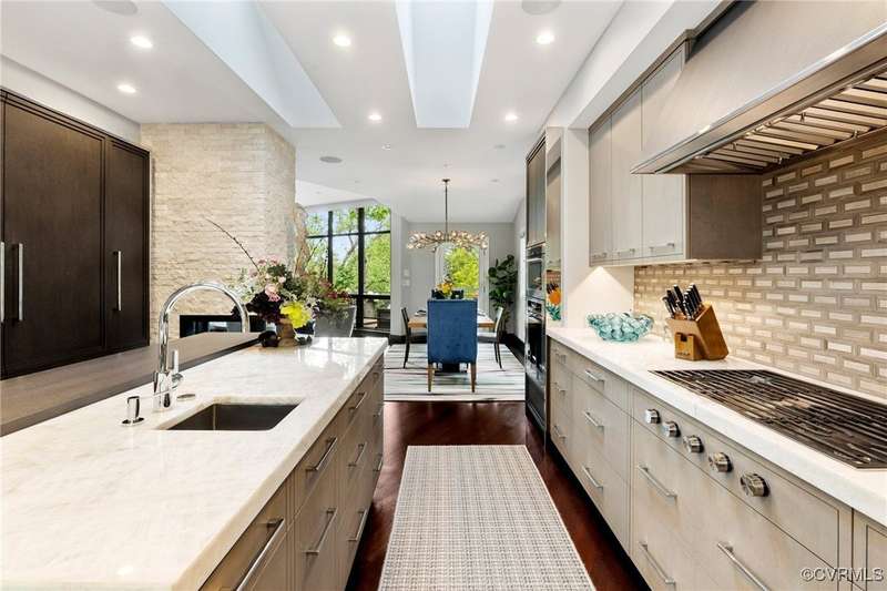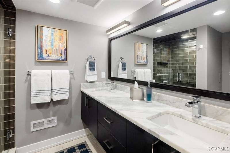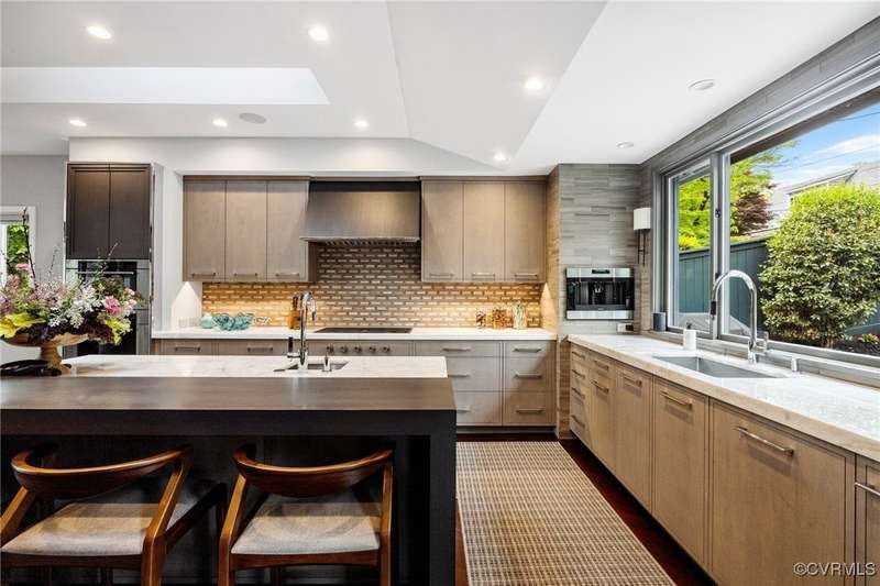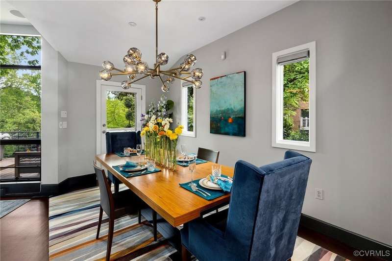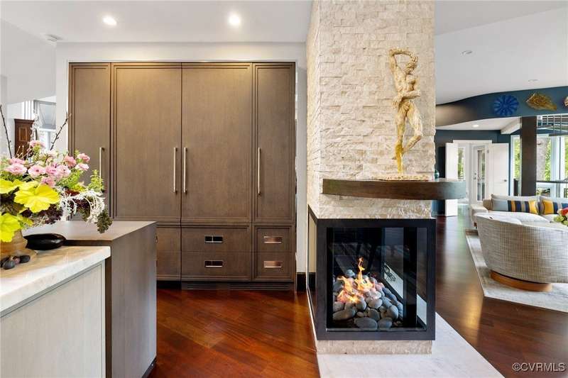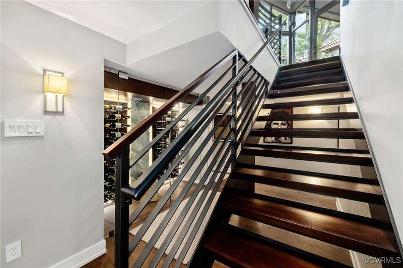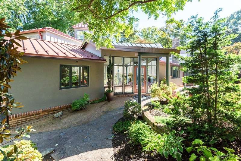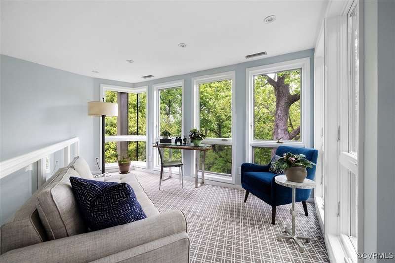 Perched high above Riverside Drive, the Tower House is a striking glass and steel home designed by Richmond architect David Johannas, with interiors reimagined by custom builder Mark Franko. This four-story modern residence offers sweeping views, magazine-worthy design, and a rare connection to nature in the heart of the city. Floor-to-ceiling windows flood the home with natural light, illuminating three bedrooms, two full and two half baths, and elegant living spaces with gas fireplaces. The main-level primary suite is a true retreat with a spa-inspired bath, soaking tub, and built-in TV. A chef's dream kitchen features Wolf and Sub-Zero appliances, quartzite counters, and gorgeous views over a serene rear patio. The lower-level hosts two bedrooms, granite bar with seating, beverage center and wine locker, and a walk-out family room with private access to the hillside gardens. Several outdoor entertaining areas include a dramatic wrap-around deck from the living and dining room, and a graceful stairway of Pennsylvania Bluestone that leads you down to the Buttermilk Trails. The tower's upper floors offer a commanding view of the Carillon, and seasonal views of the James River and downtown skyline. A rear carport and off street parking, complete with multiple attached and detached areas for outdoor storage. A celebrated property, featured in several publications and a stop on the 2024 Historic Garden Tour. This is a rare opportunity to own one of Richmond's architectural treasures. Owner Agent.