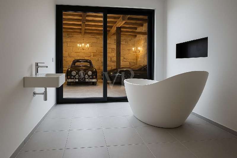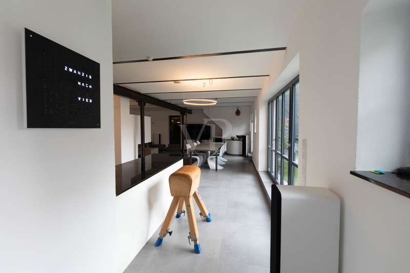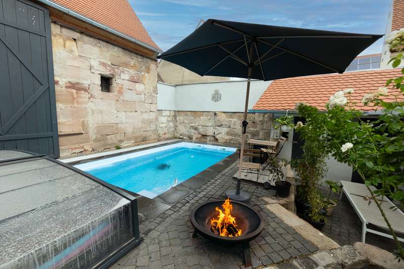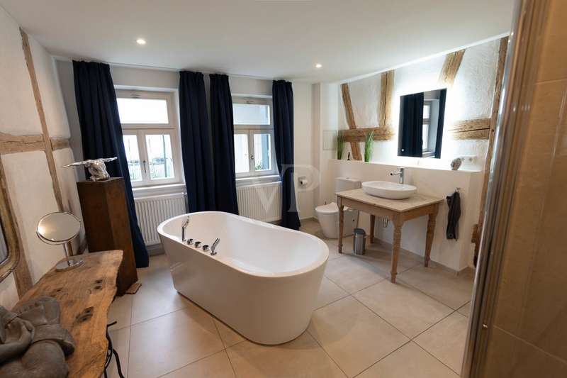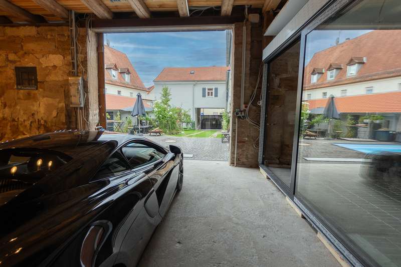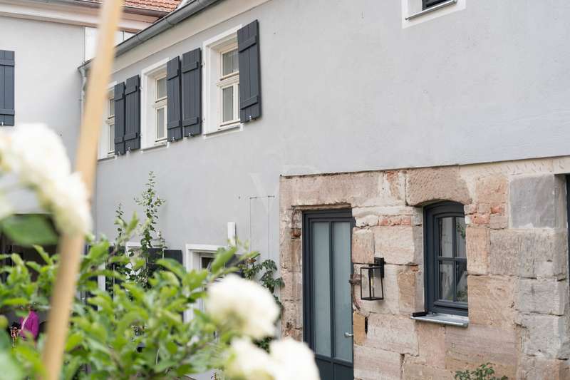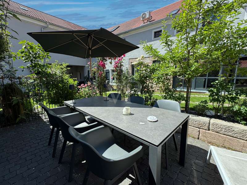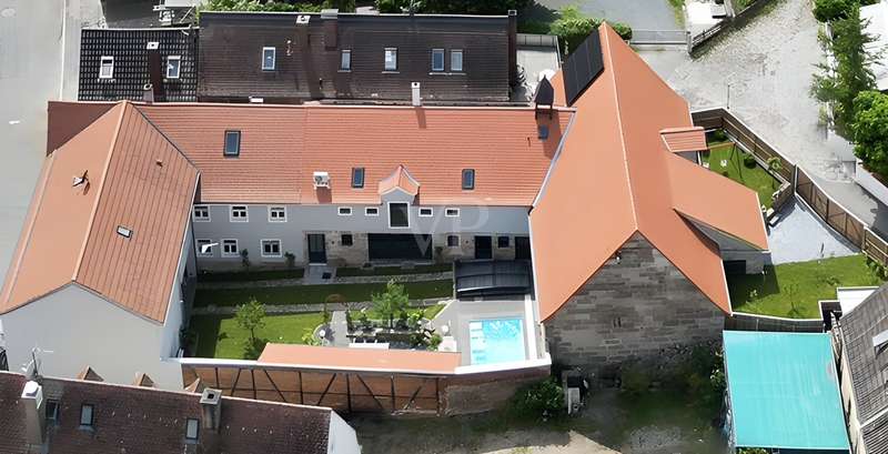 Welcome to a listed property that breathes history and at the same time meets the highest living standards. Completely and extensively modernized over the last eight years, this four-sided courtyard combines listed architecture with contemporary, luxurious living comfort. It is situated in a quiet but central location on the outskirts of Fürth. As soon as you enter, it is clear that great care, expertise and attention to detail have been applied here. Each component tells its own story and yet blends harmoniously into the modern living concept. Below you will find a brief overview of the individual parts of the building and their highlights. Residence: A spacious, modern living and dining area with an open kitchen was created in the former cowshed on the first floor. The centerpiece is an open fireplace around which the entire living area is grouped. A special highlight is the stylishly staged fountain with glass cover in the living room. This room also forms the central connecting element on the first floor and provides direct access to the adjoining barn and the guest wing currently in use on the adjacent courtyard side. The guest area has a guest WC, a spacious bathroom with a free-standing bath and walk-in shower as well as a further room with a second kitchen, which is also ideal for use as a preparation kitchen. The private living area is located on the upper floor and is divided into a parents' wing and a children's wing. There is also another spacious room with a fireplace, which can be used flexibly as a study, guest room or bedroom. The former ballroom in the front wing of the building was divided into several spacious rooms. A playroom, a dressing room and a children's room were created. The rear area is reserved for the parents and offers a bedroom, a bathroom and several dressing areas. Adjacent to this is the wellness area with a large sauna, infrared cabin and open shower. A further room with access to the outside is ideal as a fitness or relaxation room. In the converted attic there are two lovingly designed guest rooms, each equipped with air conditioning. Barn: An architectural highlight awaits you here, which will delight classic car enthusiasts in particular. The sandstone barn is currently being renovated to a high standard and is scheduled for completion at the beginning of August. A spacious sleeping area with bathroom and dressing room is being created, which is directly accessible from the house. A floor-to-ceiling glass front separates the sleeping area from the original barn room, which is currently used as a garage, and allows a view into it. So you can enjoy the view of your vehicles - whether from the free-standing bathtub or directly from the bed. In addition, the former hayloft offers around 130 m² of storage space. Inner courtyard & garden: The historic patio at the entrance to the courtyard is particularly impressive. The lovingly redesigned courtyard offers a small workshop, a heated outdoor pool with a roof and two inviting terraces, making it perfect for relaxing hours outdoors with family and friends. An automatic garden irrigation system is of course available. A small outbuilding serves as a garden shed and wood store. At the rear of the property - behind the barn - there is space for a playground and an orchard. Modernizations: Between 2018 and August 2025, the entire property was and will be extensively modernized to a high standard. All roofs were re-tiled. Modern heating systems, the complete renewal of the electricity and water pipes as well as almost all windows and all floors and wall surfaces underline the exceptionally high standard. Particularly elaborate insulation of the walls and roofs completes the well thought-out overall energy concept and makes the ensemble not only high-quality and modern, but also sustainably efficient. Technical information/energy consumption: Despite a living space of over 500 m², the property boasts an excellently thought-out energy concept that combines maximum comfort with exceptional efficiency. A central heating system and several air conditioning units ensure a pleasant indoor climate all year round. Particularly noteworthy is the high-performance photovoltaic system with battery storage, which not only contributes to the property's own electricity supply, but also significantly reduces operating costs and raises the property to a future-proof level in terms of energy. The monthly operating costs for electricity, heating and water are only around €300 and are therefore exceptionally low in this order of magnitude. The informative energy performance certificate shows a final energy consumption of only 38.13 kWh/(m² a), which corresponds to the excellent energy efficiency class A. The property thus combines historic building fabric with modern technology and sustainable efficiency - a combination that is rarely found on the market. Conclusion: Whether as a spacious family home, a stylish multi-generational home or a combination of living and working - this property is a real rarity. The successful combination of history, comfort, features and energy efficiency makes it a home with character, soul and a high quality of life that clearly stands out from the ordinary.