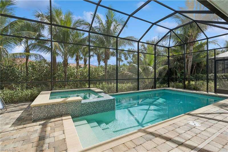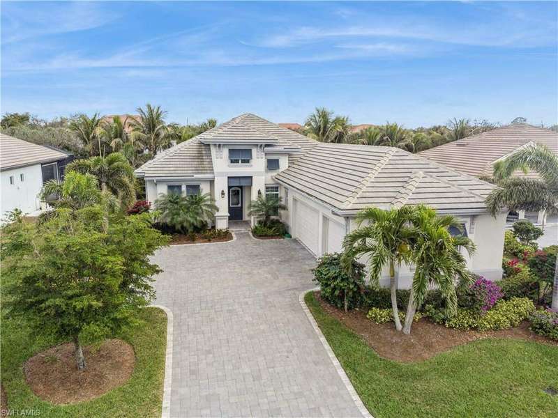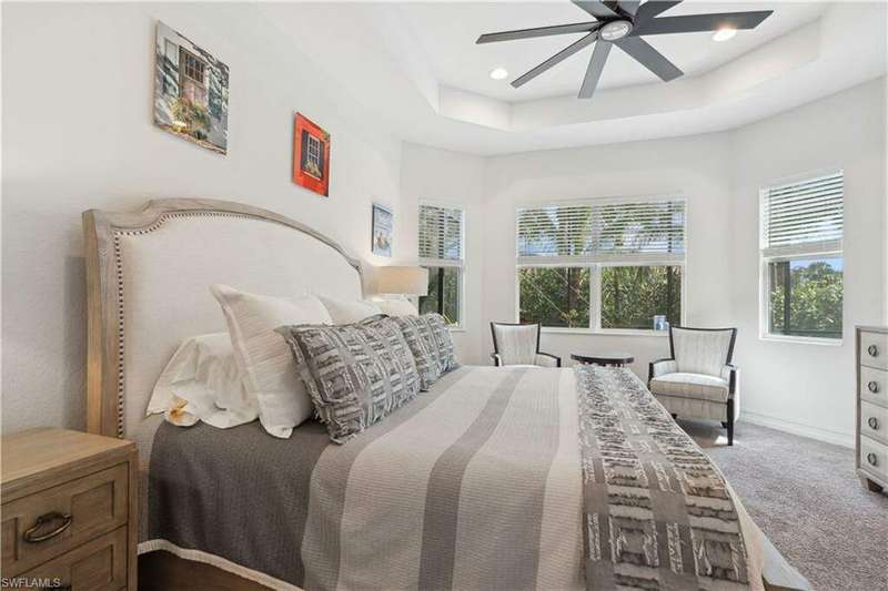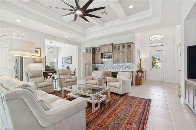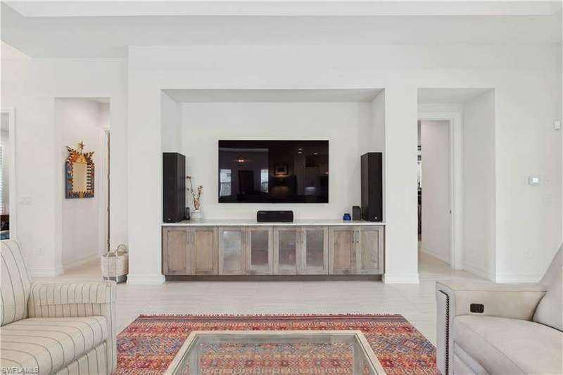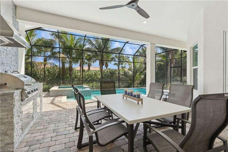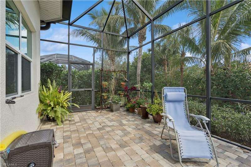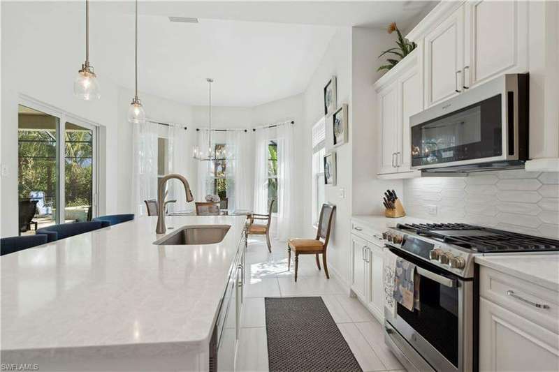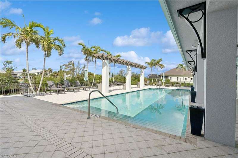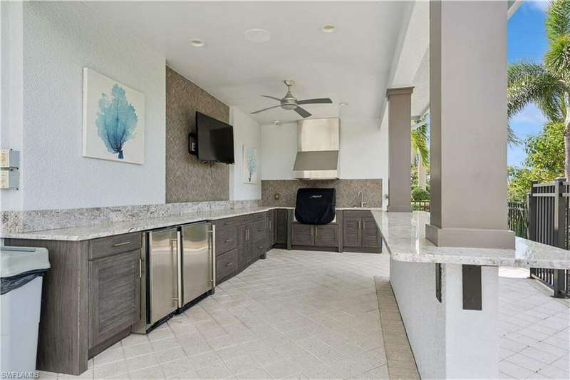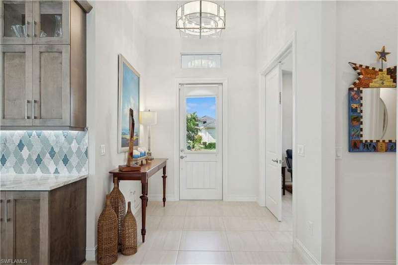 Impeccable details are showcased in this 4 bedroom, 2.5 bath, climate controlled 3 car garage estate. This home is a true hidden gem in the most amazing community located within minutes to Gulf Coast Hospital with easy access to area islands; beaches; RSW airport and shopping. This exquisite luxury home is situated amongst a very well maintained gated community that boasts one of the best kayaking excursions in Lee County, community kayaks are available or bring your own - and paddle through the mangrove covered shorelines; or enjoy fishing in the back bay or end up at Lover's Key to enjoy a picnic on the beach. The kitchen boasts gas cooking with an upgraded brand new GE Profile stove installed in January 2025. Upgraded built-in beverage center with wine cooler and beverage fridge with luxury cabinets match the upgraded luxury built-in TV center, cable is provided by the community with the HOA. The ceiling treatments were recently added in the living room and entry as well as some upgraded light fixtures, a new recirculating water heater pump for quick hot water was recently installed; new landscaping front and back; new pool heater 2025; new pool lights in pool/spa. New pool equipment. Upgraded CA closet systems. The HOA maintains the landscaping as well as exterior pest control; hedging; street maintenance; & community facilities. The elegant and tropical lanai and pool area are very private and boast an outdoor kitchen with a built-in grill with a nice covered area. The very large 3 car garage is climate controlled and includes a nice workbench area. This home is well equipped with wind rated windows and has never flooded. Community amenities include a fitness room; firepit area; gorgeous pool area overlooking a waterway out to the Gulf of Mexico/America; small library area; and a gorgeous large event room with bar/kitchen area; outdoor grilling and kitchen area at community pool; community docks and kayaks. Built by Stock this home is almost like new construction. Schedule your private showing to really see the level of upgrades and finishes this estate boasts.