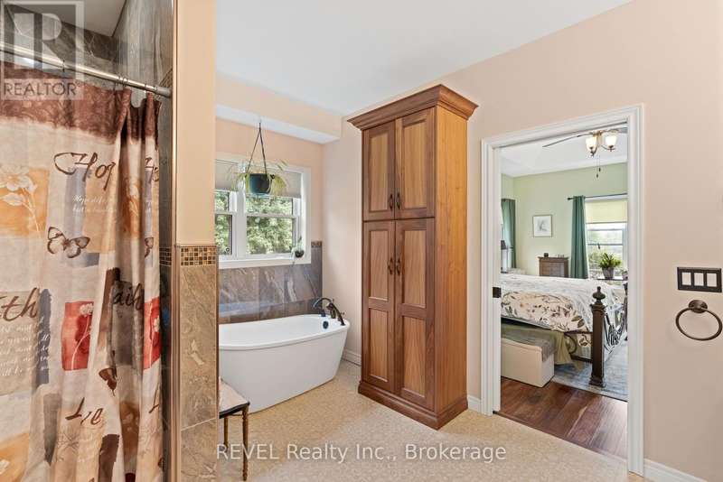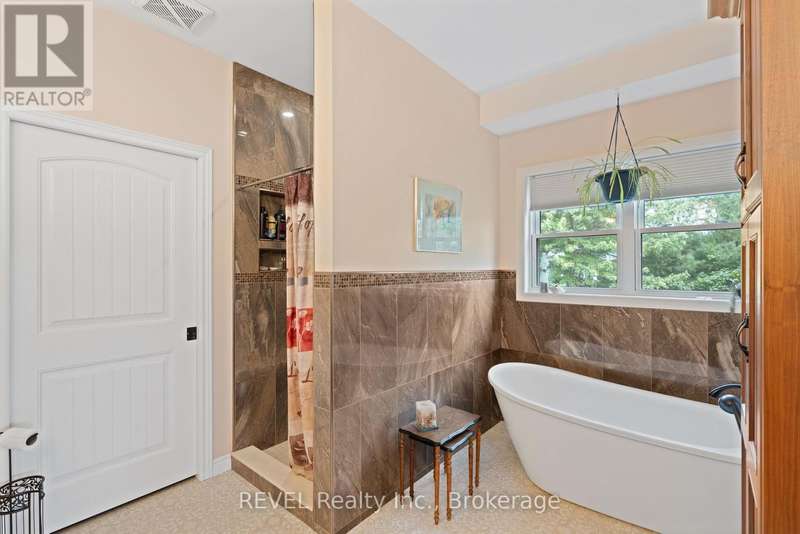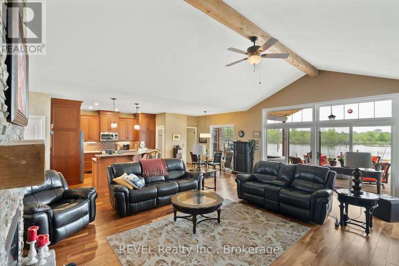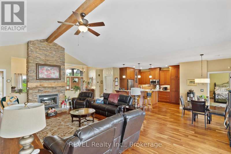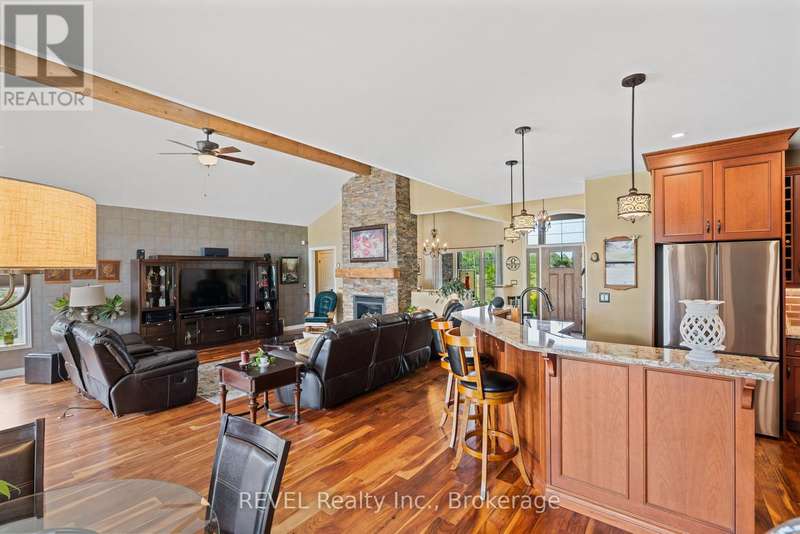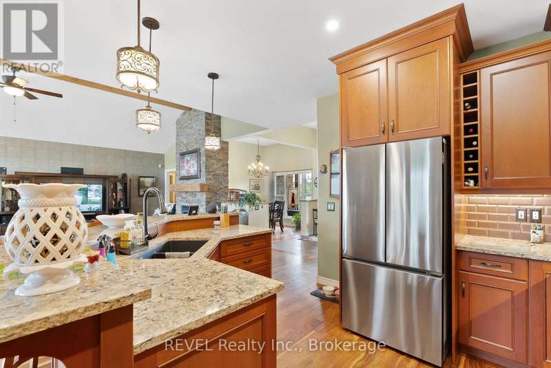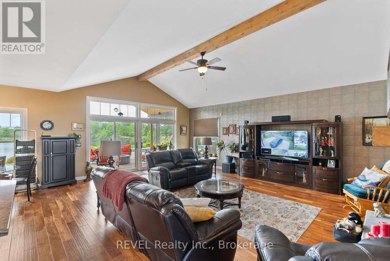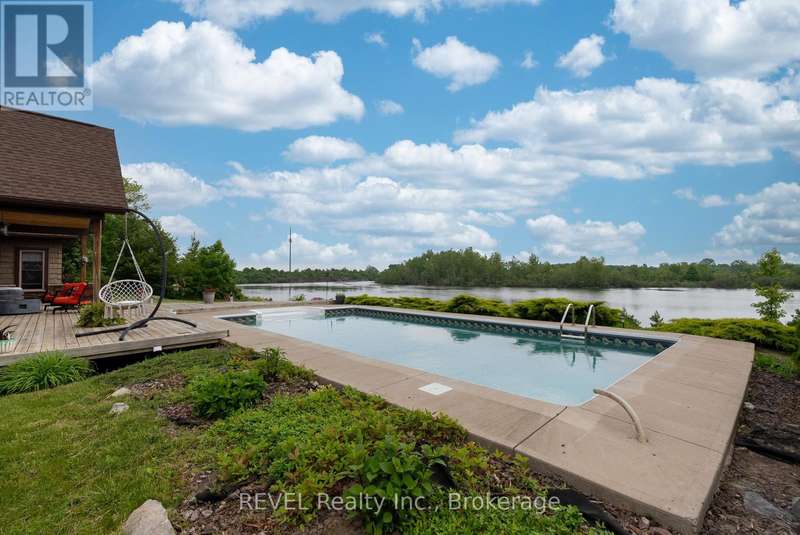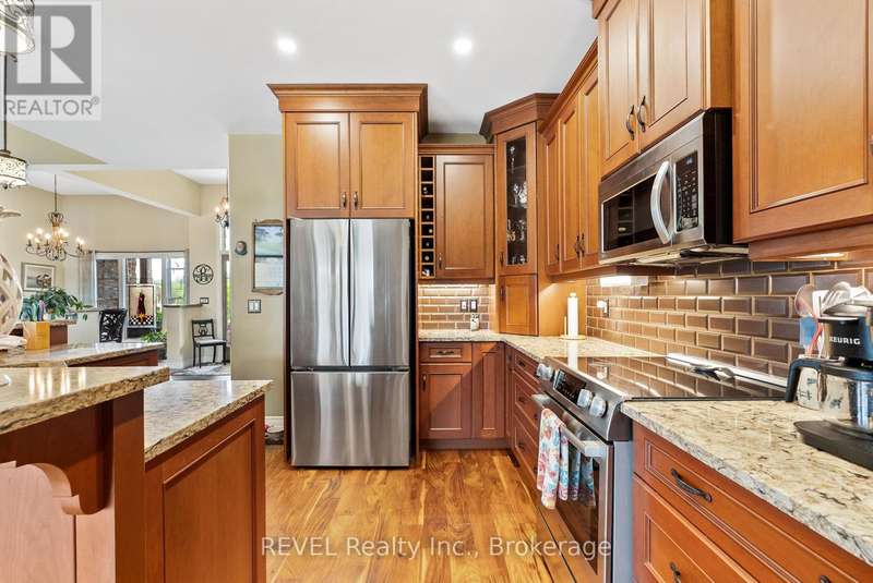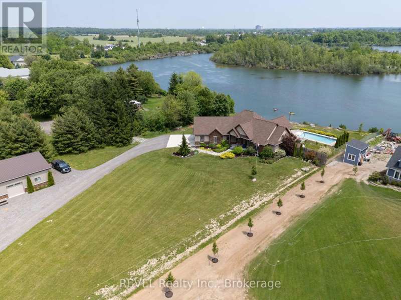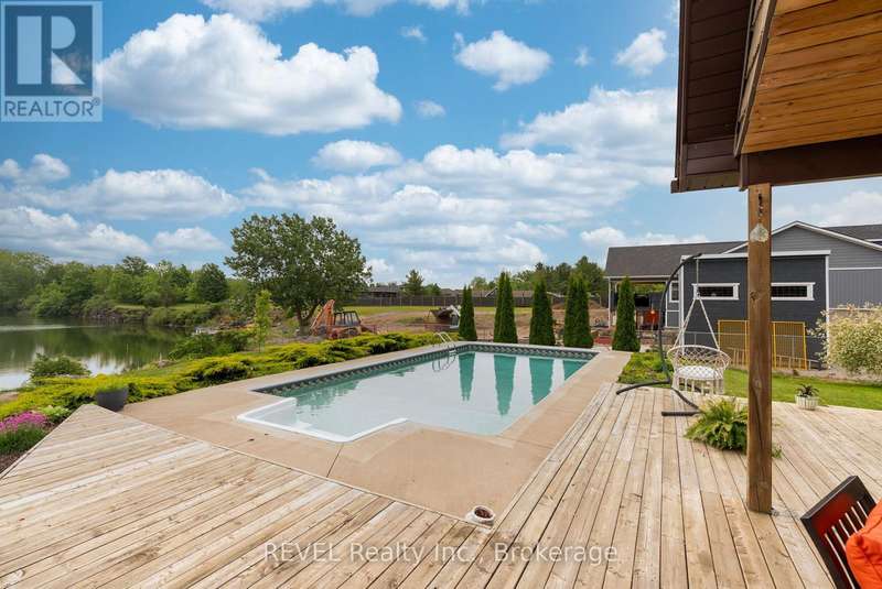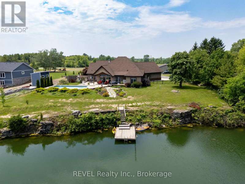 Located just outside the City of Port Colborne with sweeping Wainfleet views, this beautifully appointed bungalow backs onto the serene Port Colborne Quarry Pond and includes .5 acres of owned underwater land, offering an unmatched setting for water recreation and peaceful living. The home blends cottage charm with modern comfort, featuring 4 bedrooms and 2 bathrooms, including a private primary suite overlooking the pond with a luxurious 5-piece ensuite boasting a tile walk-in shower, soaker tub, and walk-in closet. The open-concept main floor is designed for both relaxation and entertaining, with vaulted ceilings in the living room, a striking stone gas fireplace, and large windows that frame the stunning quarry views. The kitchen is well-equipped with quartz countertops, a large island with bartop seating, stainless steel appliances, and a generous pantry, flowing seamlessly into the living and dining areas with rich hardwood flooring and real wood doors throughout. Two additional main-floor bedrooms, a full 4-piece bathroom, and an office that can serve as a fourth bedroom provide ample space for family or guests. A large covered rear deck with a vaulted roof extends your living space outdoors, overlooking an 8-year-old inground pool with a new pump and filter ideal for summer enjoyment. Additional highlights include a main-floor laundry room, an extra-large attached 2-car garage, a 35x40 ft detached shop with full vehicle lift and air compressor, and a 5-ft height unfinished basement for storage. With a cistern water supply and a location that offers a true Muskoka-like experience just minutes from all local amenities, this home delivers the ultimate blend of lifestyle, privacy, and practicality. (id:7434)