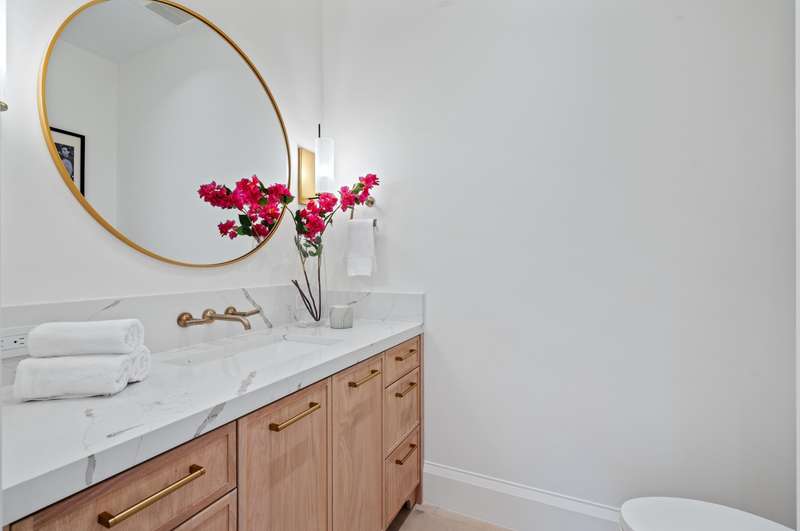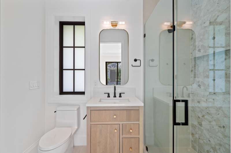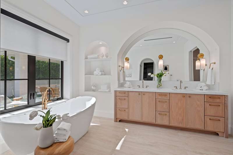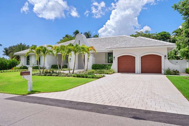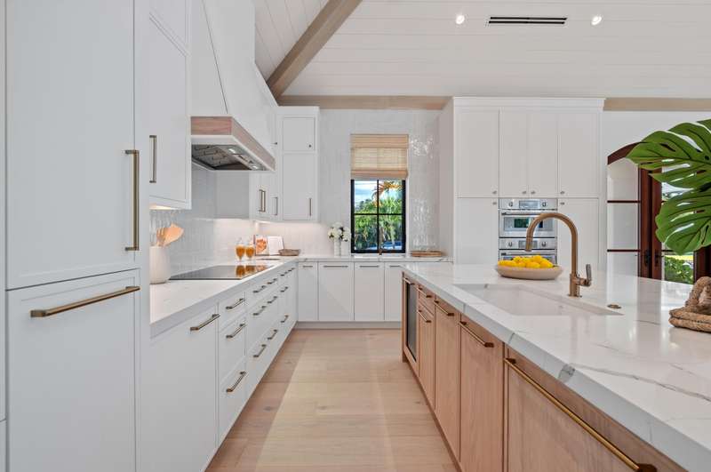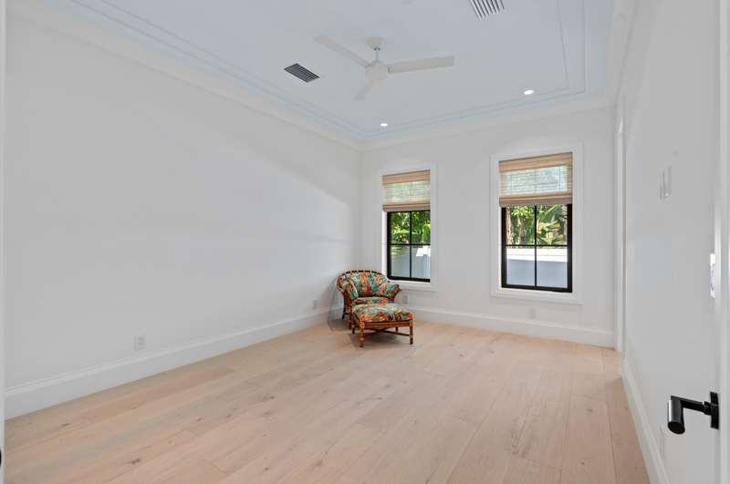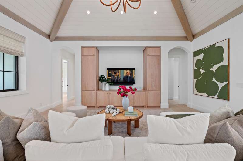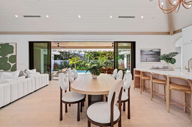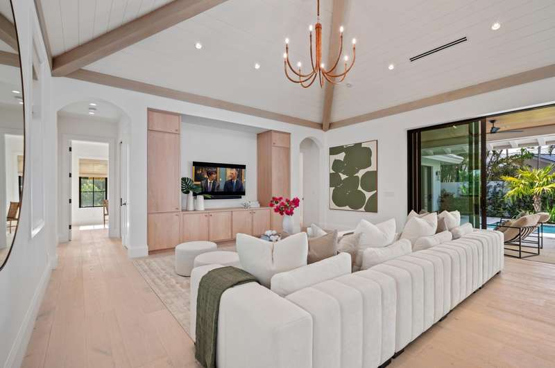 On a prime corner lot in Delray Beach's coveted Lake Ida enclave, this chic 2025-built contemporary residence, designed by Darius Zubrowski, AIA, NCARBArchitect, offers an open floorplan great room, topped by a beamed vaulted ceiling, accessing the pool loggia and summer kitchen; four bedrooms with the primary bedroom opening to a private covered patio, a pocket office; and a cook-island kitchen with two-tone cabinetry, quartz counters and Thermador appliances