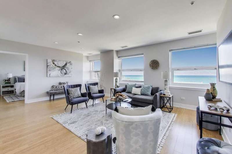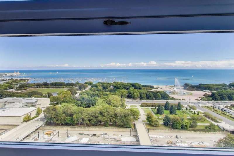 Forever views overlooking Buckingham Fountain, Grant Park & the Lakefront from every room! 6 picturesque windows capture the views of Grant park, and lake. Spacious entry with elegant gallery hall opens up to the living rooms and TV ares. Updated kitchen cabinets, tons of cabinets room, and counter space for prepping. Preferred split floor with generous primary bedroom, both bedrooms offer large windows with tons of natural light. Both bedrooms provide an en-suite bathroom and with a .5 in the common area. Large walk-in W.D room with an very new W.D 24 hour door staff, fitness center, and additional LARGE storage on the same floor. (6/3/3). 1 heated garage space available for $35k addl. (#14)
