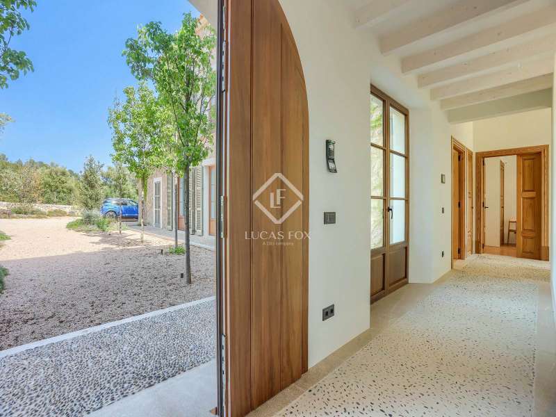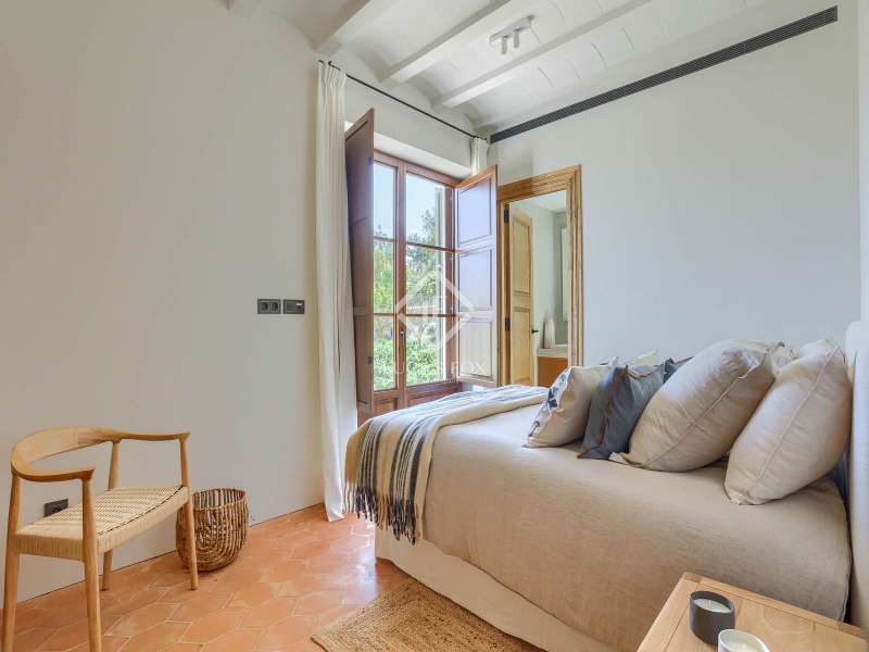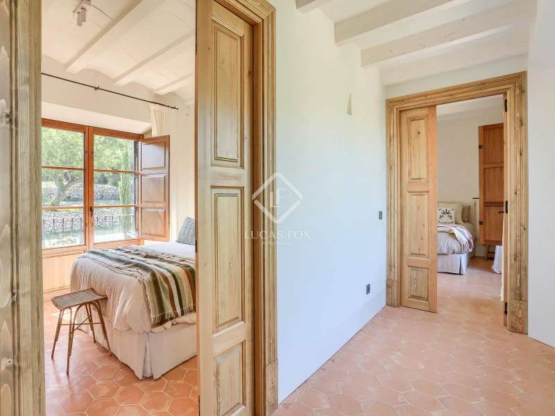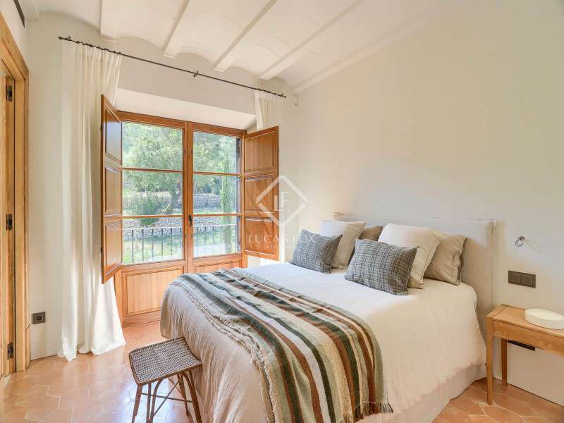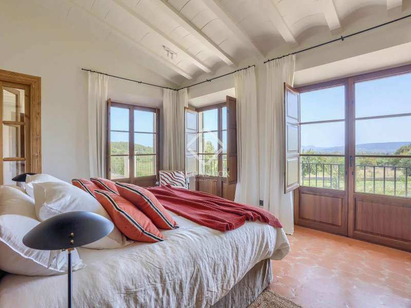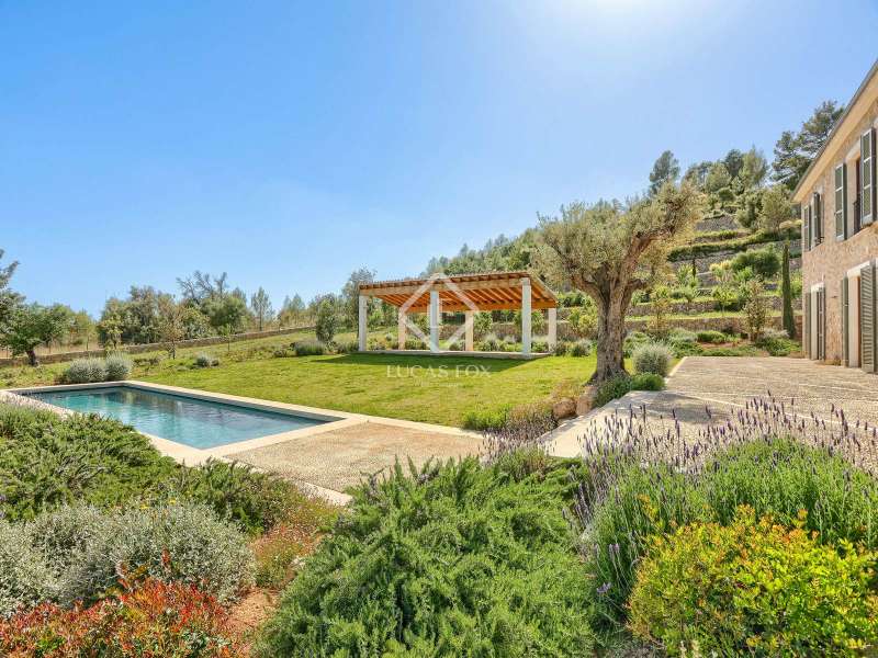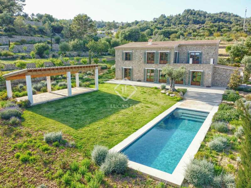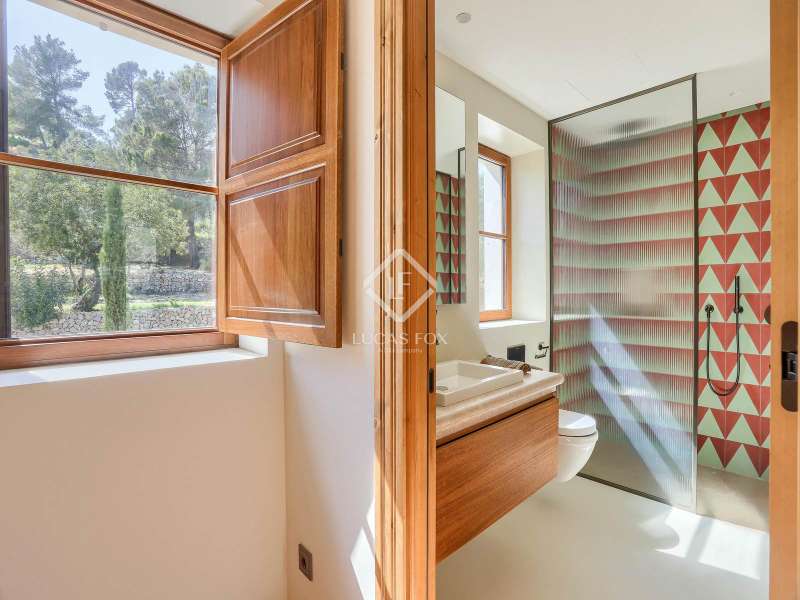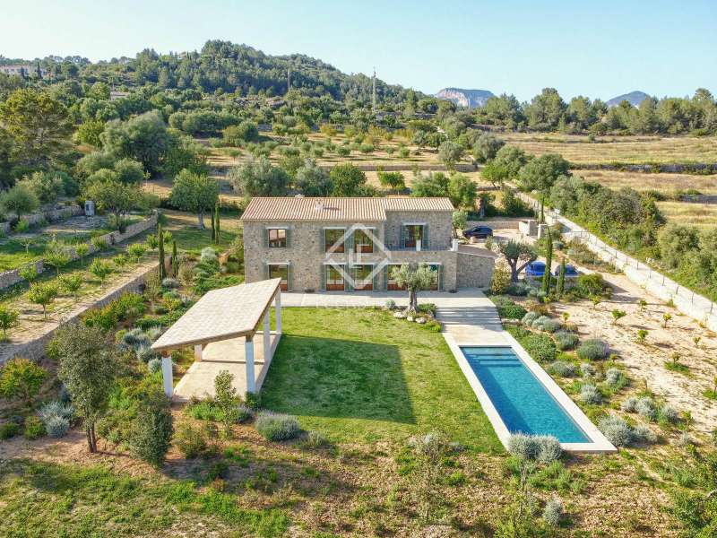 This impeccable rustic property, built in natural stone, is located in Alaró, in the Sierra de Tramuntana region, on a 14,800 m² plot. Here you will not only enjoy unparalleled tranquility and privacy, but also beautiful views. The property is spread over two floors. On the ground floor, there is a spacious, light-filled living room that blends seamlessly with the elegant, modern kitchen, which is fully equipped with high-quality materials. There are also three bedrooms, each with its own bathroom, a guest toilet, and a laundry room. The master bedroom is located on the upper floor, featuring ample light. It has its own bathroom, dressing room, terrace, and an additional space that can be used as an office. There are also two more spacious bedrooms with en-suite bathrooms. The exterior offers a splendid 50 m² covered terrace and a beautiful saltwater pool, ideal for rest and relaxation. Traditional stone walls and rock terraces shelter fruit and olive trees, creating a welcoming atmosphere. During the construction of the house, the use of local, quality materials was prioritized. Additional features include air conditioning, underfloor heating, a private well, a water tank, solar panels for both hot water and electricity, a home automation system, GESA power supply, and a security system.