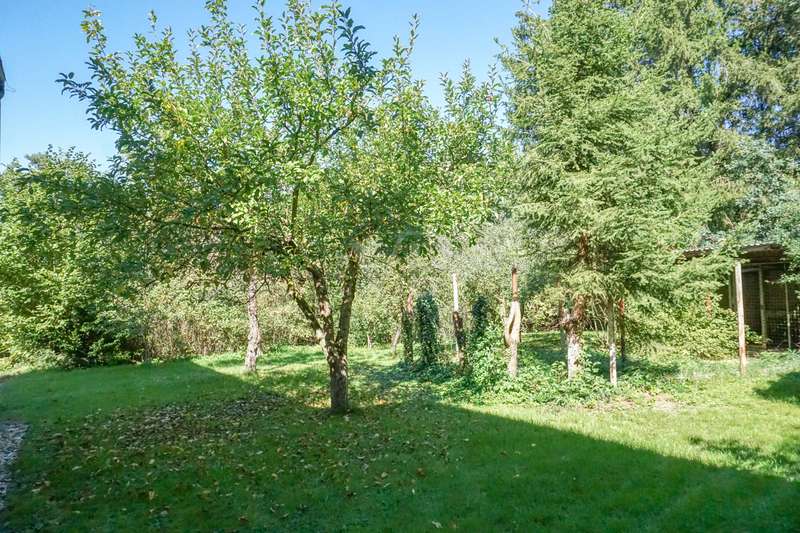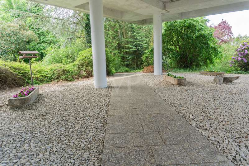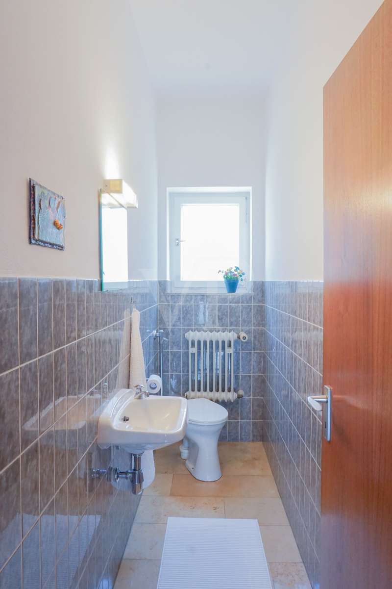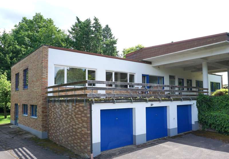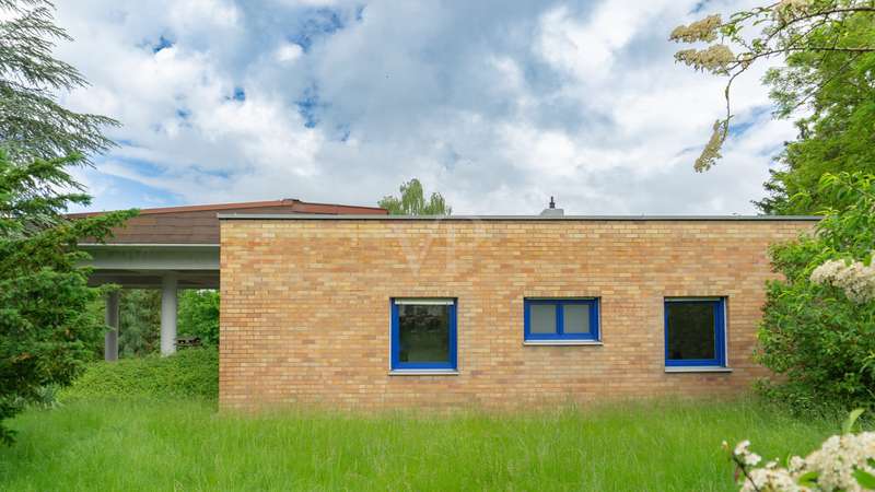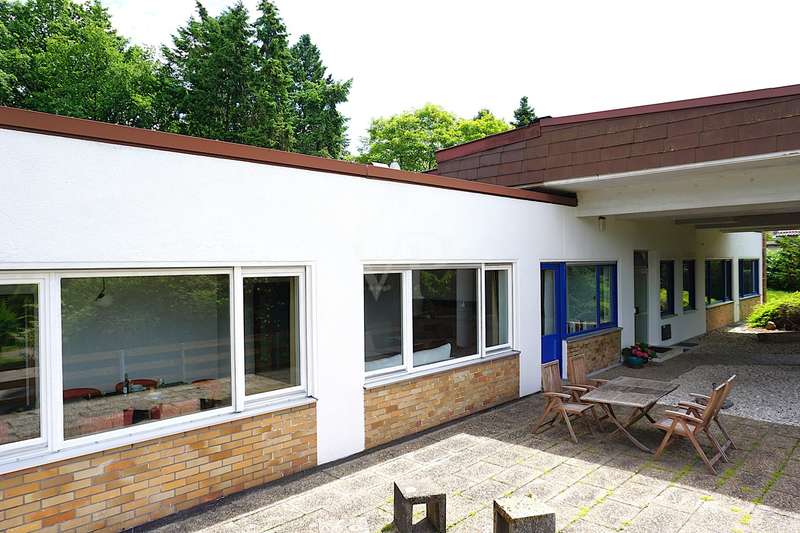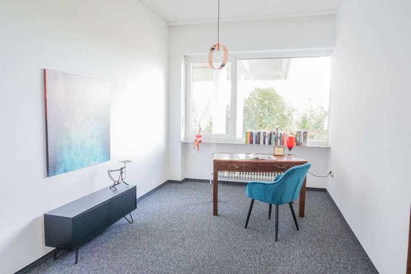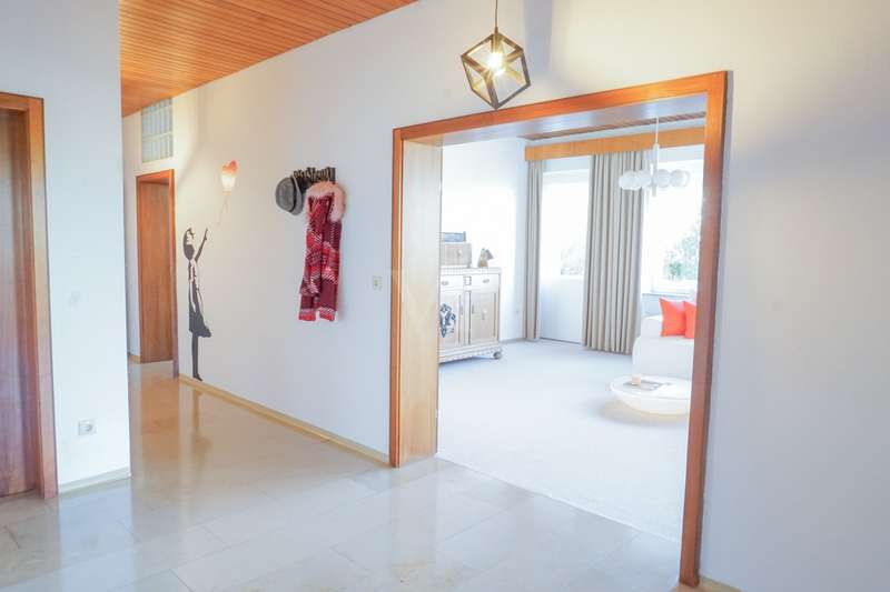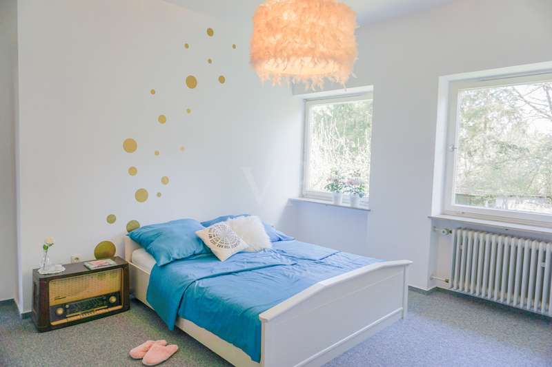 Welcome to your personal paradise! Peace, seclusion and wonderful nature wherever you look. These are the qualities that make this unique property in an unobstructed and secluded location so captivating. This two-family house in elegant Bauhaus style offers a wide range of possible uses on approx. 243 m2 of living space. You can remove walls and design the house as a spacious family home. Alternatively, the house can be used as a comfortable multi-generational home, or you can rent out part of the space to create an attractive source of income. You will be enchanted by the impressive architecture as soon as you enter the sheltered front garden. You enter your new home through the imposing canopy, past four majestic pillars and the spacious terrace. The spacious hallway divides the house into a west and east wing. The west wing houses the living area, while the east wing has been converted into modern offices. With a few simple steps, this could be transformed back into a comfortable living area. A staircase leads straight down to the basement and the workshop. In the living area, the inviting guest room awaits you first on the left, followed by the spacious living room. The almost 3-metre-high ceilings and the Bauhaus-style ceiling elements give the rooms a special touch and underline the exclusive architecture. From the living room, you can access the large terrace and enjoy the breathtaking view of the expanse. From the dining area you reach the kitchen, where there is space for a solid wood kitchen unit and a breakfast table. Two spacious bedrooms, a practical storage room, a bathroom with shower and bath and a separate WC round off the living area perfectly. The offices of this property offer four versatile office spaces, but this area can also be used as a separate apartment. Three offices are accessible from the hallway and one office from the corridor. A modern, as-new kitchen and a cozy relaxation room offer additional comfort for employees. The offices offer versatile working options and space for individual work requirements and teamwork. Thanks to the fiber optic connection, you are also technologically up to date in this idyllic setting. There is also a WC and a bathroom here. The workshop, heating and storage rooms are located in the basement. The entrance hall leads to a WC and directly to the outside. The wide doors and the ground-level entrance allow pallets and other large objects to be driven directly into the area. The area can therefore continue to be used for operational purposes. The central heating system from 2003 provides cozy warmth in all rooms. The heat exchanger was only replaced in 2022. Some of the windows have already been replaced and an Abus alarm system provides additional security. The plot offers a generous 2,315 m2 of space for garden enthusiasts and nature lovers. Behind the house there are fruit trees and several mixed tree species. Here you can enjoy the idyllic oasis of peace in the midst of nature and spend relaxing hours outdoors. This house is ideal for people who are looking for something special and want a spacious layout. The secluded location with wonderful views and the high-quality furnishings make this property a very special one. Experience your new home - a place where dreams come true. Arrange a viewing appointment today. Would you like to get an impression in advance? Then ask for our 360 degree tour! We will be happy to negotiate a price within the framework of a realistic offer.
