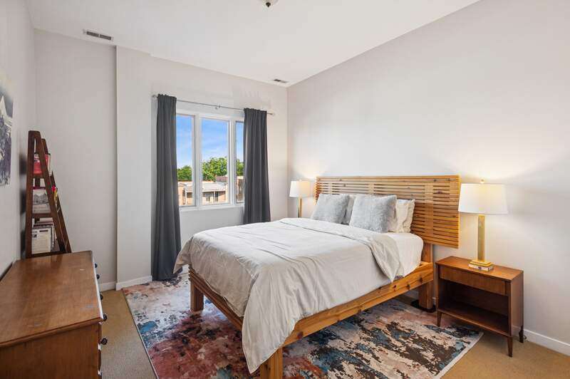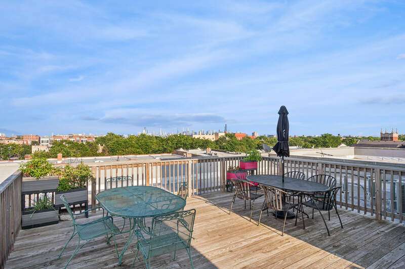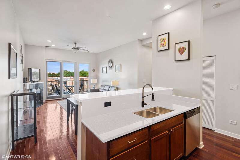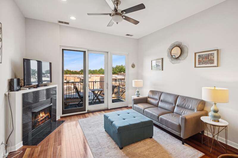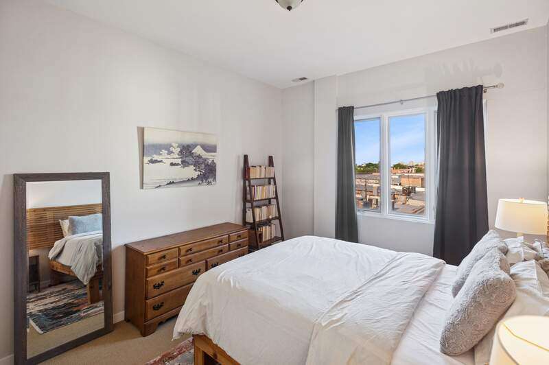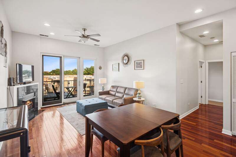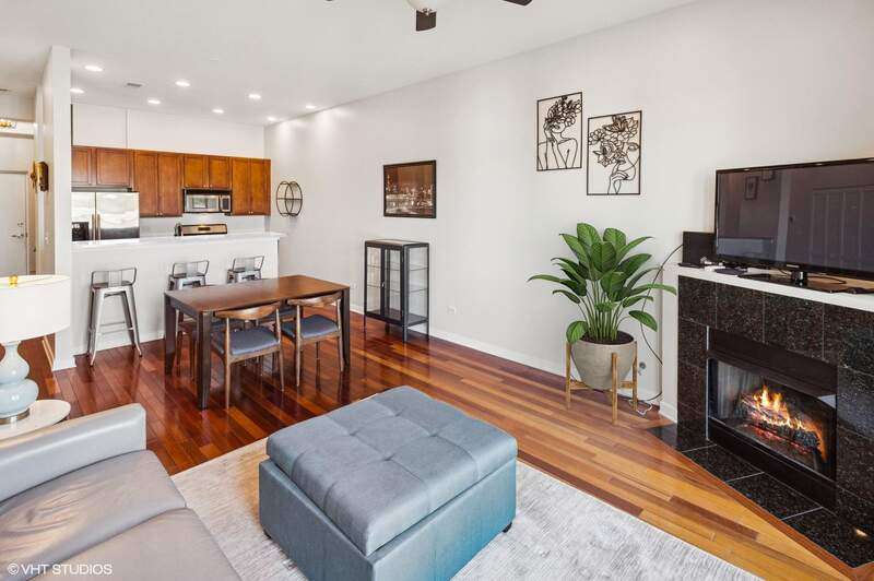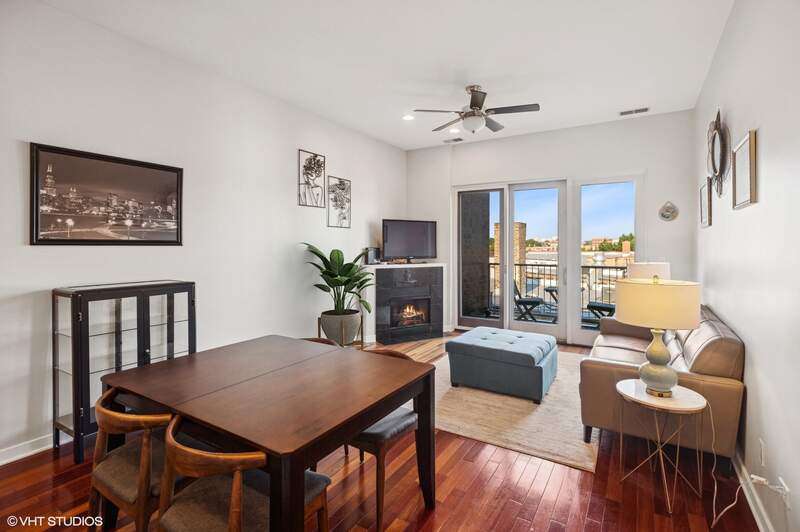 Top floor beautifully appointed 2 bed/2 bath in boutique, and rare to find, elevator building in the most sought-after Logan Square neighborhood. Open concept floorplan offering a spacious living room with a gas fireplace for chilly nights or step out on your balcony during those beautiful summer days. The space is rounded out with a defined dining area & turn-key kitchen with option for white quartz counters to be installed. The thoughtfully designed floor plan maximizes space and natural light throughout, creating an inviting atmosphere for both daily living and entertaining. A generous primary suite offers an organized walk-in-closet and bathroom with a walk-in-shower and separate tub. Your guests will be comfortable in the sunny bedroom, or you can turn it into a dual office/guest suite. Attached heated garage parking and storage included. Bike room too. Common rooftop deck has stunning city views. The neighborhood is a vibrant mix of trendy restaurants/bars (Middle Brow, Parsons, Bang Bang Pie & Biscuits, Scofflaw, Giant, Dos Urban Cantina, Osteria Langhe, and Spice Room), cozy cafes, and unique boutiques, all within easy walking distance. Only 2 blocks to the 606 trail, Palmer Square, Logan Square/Farmer's Market and less than a mile to Humboldt Park with tons of outdoor activities.
