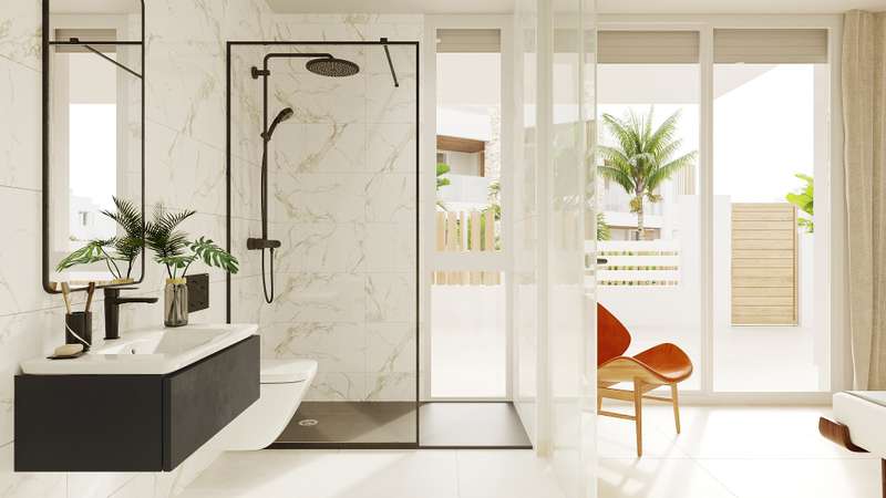 Inside these modern houses for sale in Mar de Pulpi, Almería, on the ground floor, you have a spacious double bedroom with a fitted wardrobe and an en-suite bathroom with a walk-in shower, another ground-floor bathroom, an equipped open-plan kitchen and dining area, and a sizable living area with large French-style windows that lead out to the sun terrace. Upstairs you have two large double bedrooms both with fitted wardrobes, private balconies, and en-suite bathrooms with walk-in showers.