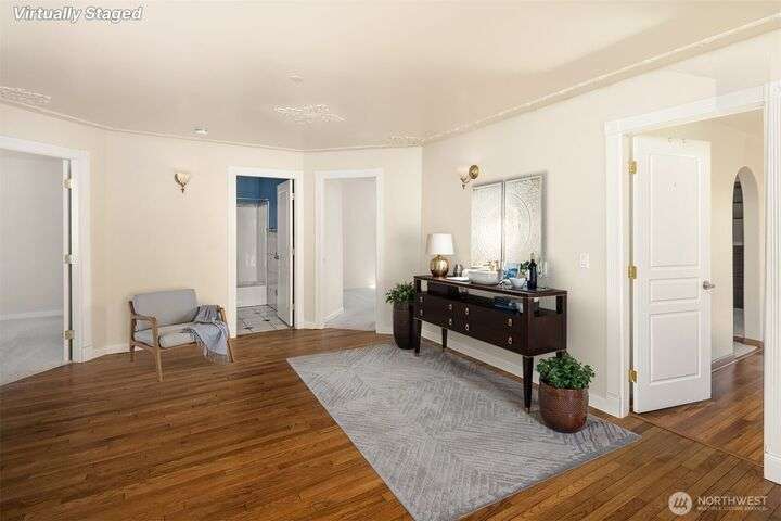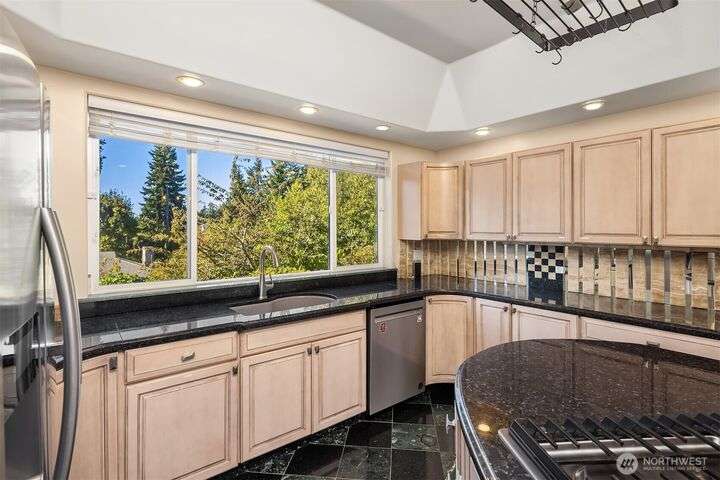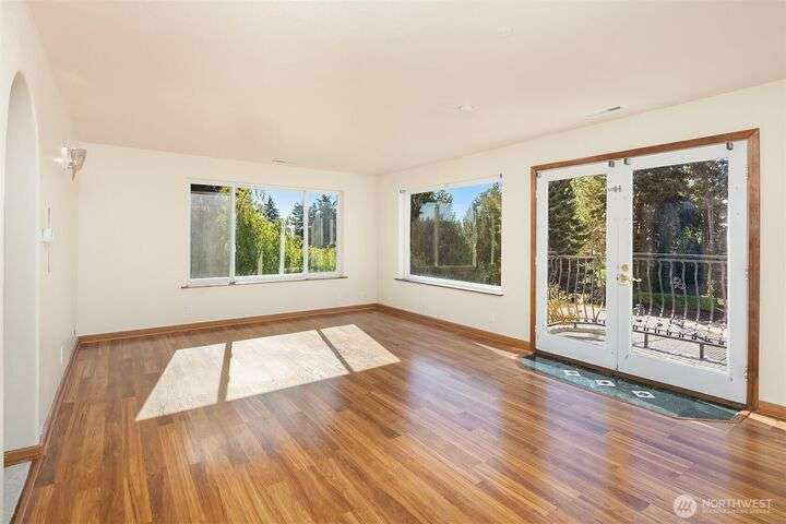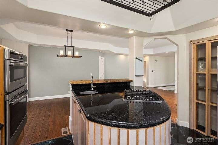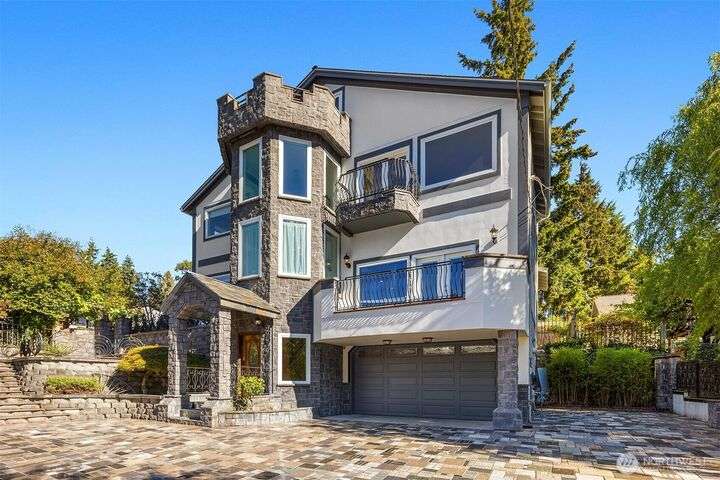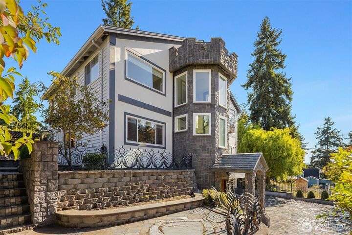 Incredible value in desirable Shorewood on the Sound, featuring unique, high-end materials and nearly 3800 sqft on 3 floors- ideal for multigenerational living. At the center, a curved 3-story stairwell graced by a 20-foot chandelier. West-facing wall of windows fills the spacious living room with natural light. Also on main, kitchen & formal dining opening to stone patio w/gazebo, media room w/110” projector screen, den/office, & powder room. Upstairs, 4 large bedrooms & laundry. Primary suite boasts a balcony, water & mountain views, & 5-piece marble bath w/heated floor. On top floor, recreational/hobby space and another view balcony! Beautifully maintained with $100K of recent upgrades, incl. energy-efficient heat pump & AC. A rare find.