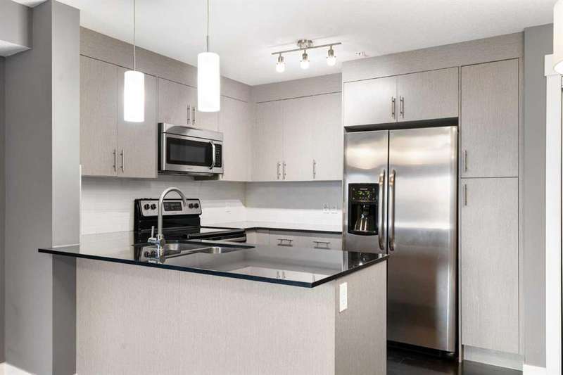 Check out this amazing two-bedroom, two-bathroom condo located on the ground floor. The unit is spacious, with an open-concept design. The kitchen has sleek black granite countertops, stainless steel appliances, and a large central island that is perfect for both cooking and entertaining. The large open living space has warm cork flooring that leads you to a patio with beautiful landscaping and a gas BBQ hook up. The massive primary bedroom has his and her closets and a four-piece bathroom. The second bedroom is a good size and close to the main bathroom. Every room is wired with fiber internet for shaw or telus. This unit also has a titled above-ground parking stall that is super convenient. Located across from the complex are Catholic and Public schools. There are also shops, bus stops, and playgrounds within walking distance. Come and view this amazing home in the beautiful community of Skyview Ranch.