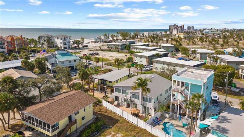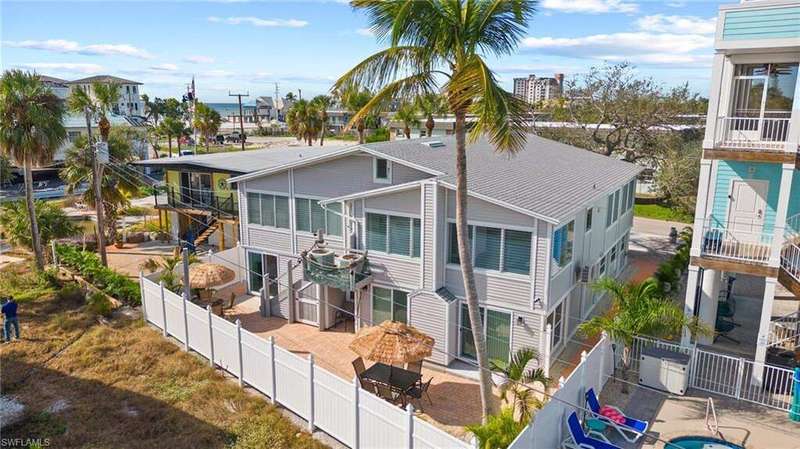 Ever hear the old Saying? "You can't have your cake & eat it too" Oh!! Yes you can!! This beautiful Duplex sits just 277 steps away from the gorgeous, sugary white sands of Fort Myers Beach & a natural Saltwater pool named the Gulf Of Mexico. Each unit offers 2 beds and 1 bath, TURN KEY FURNISHED, large screened rear lanai's,2 BRAND NEW 2024 A/C units,open porch front balcony with partial Gulf View's. Through your huge 2 car garage on either side, there is entry to the upstairs unit, entry to your BONUS MAN/WOMEN CAVE WORKSHOP/ART STUDIO on one side with a full bathroom, and a BONUS SUITE/3RD BEDROOM ON THE OTHER. The property is adorned with tropical landscaping, a back patio offering plenty of room to throw a BBQ, lay in the Sun, or kick off your shoes, relax with a good book & let island time take over. Being in a Mid-Island location allows for peace and quiet, a short ride to grocery stores and restaurants, if you want get into the party mode, well, MargaritaVille & numerous other establishments are just a mile or 2 down the road. In the future the new SEAGATE DEVELOPMENT will be within walking distance with shopping , restaurants , beautiful parks and much more to enjoy for your tenants or family. At this time, Airport, shopping malls, hospitals, golfing, spring training baseball are just a short 20 -30 minute car ride away. WEEKLY RENTAL ZONE provides endless opportunity here! This property had a small amount of flooding on the lower floor. The owners are some of the first on Fort Myers Beach to use PVC board and Trex for the drywall on the lower apt. 3rd bedroom walls and garage walls. This is a SUPER RESILIENT WAY TO REMEDIATE FLOODING. THIS MEANS, IF YOU HAPPEN TO GET ANY MORE WATER IN THE LOWER AREAS, YOU JUST UNSCREW THE BOARDS, WASH THEM OFF, DRY THEM AND PUT THEM BACK. THE FORT MYERS BEACH INSPECTOR HAS PASSED ALL AND THEY WERE COMMENDED ON THIS DECISION FOR RESILIENCY. DON'T MISS OUT ON THIS GEM!!
