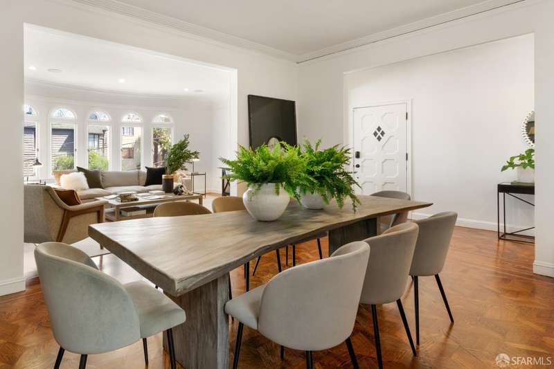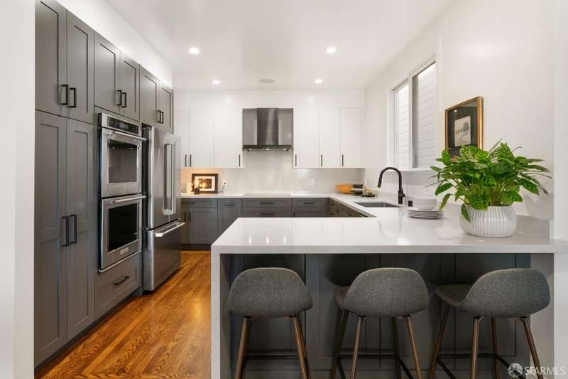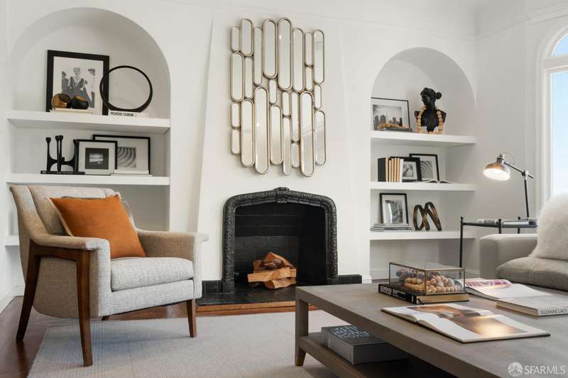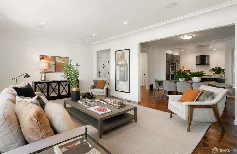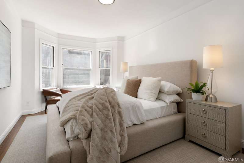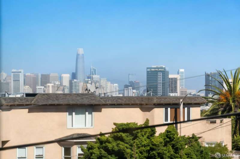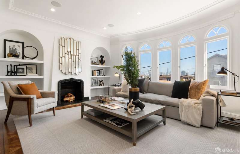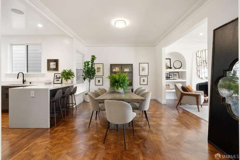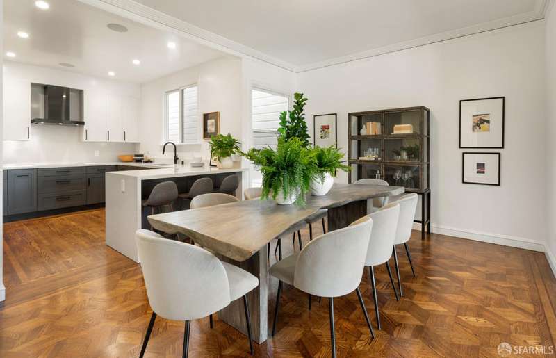 Experience sophisticated San Francisco living at its finest. This beautifully remodeled residence offers approximately 1,580 sq. ft. of refined interiors, including two spacious bedrooms, an office alcove, and two luxurious bathrooms. Period details such as parquet floors and elegant ceiling and wall moldings have been thoughtfully preserved, blending timeless charm with modern comfort. The living room captures sweeping views of Downtown San Francisco and features a decorative fireplace with custom built-ins. The chef's kitchen delights with two-tone cabinetry, quartz countertops, double ovens, an induction cooktop, and a bar-top peninsula that flows seamlessly into the expansive dining room. The primary suite exudes a resort-like ambiance with a custom closet, dual vanities, and a glass-enclosed walk-in shower. An informal two-unit HOA shares expenses equally, and the home includes one-car parking and an exclusive-use garden for private outdoor enjoyment.
