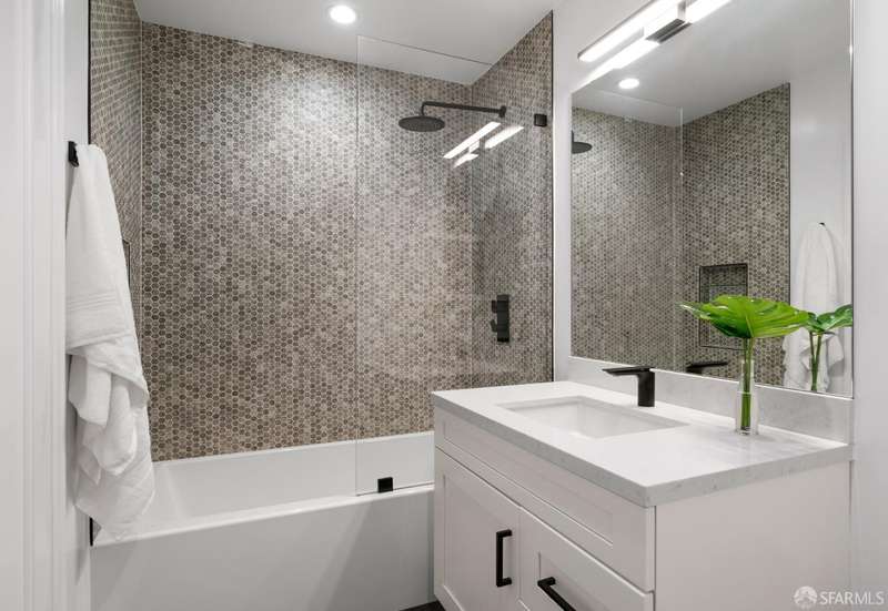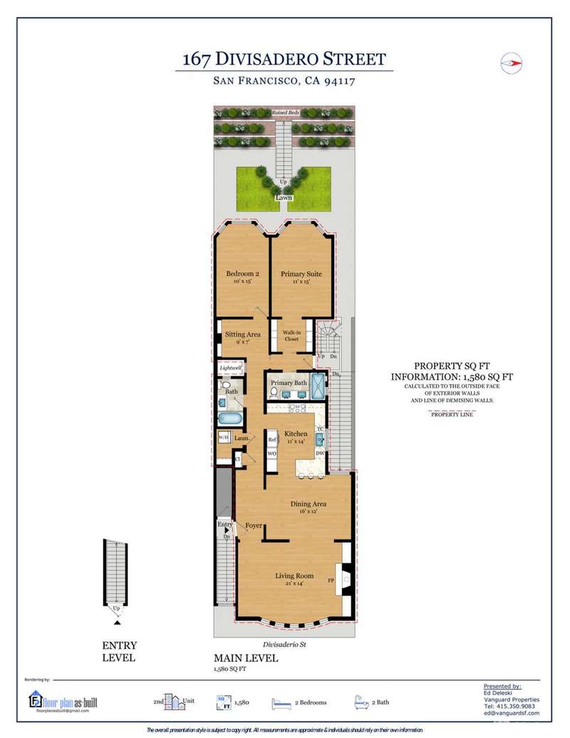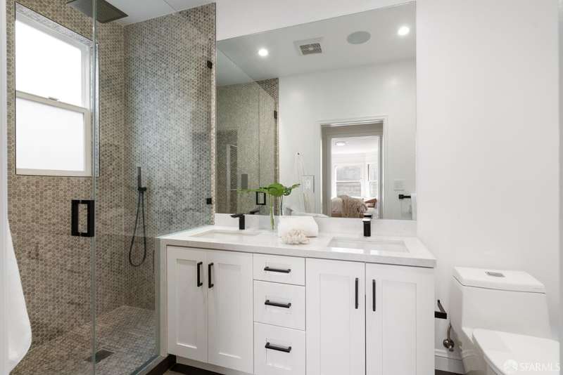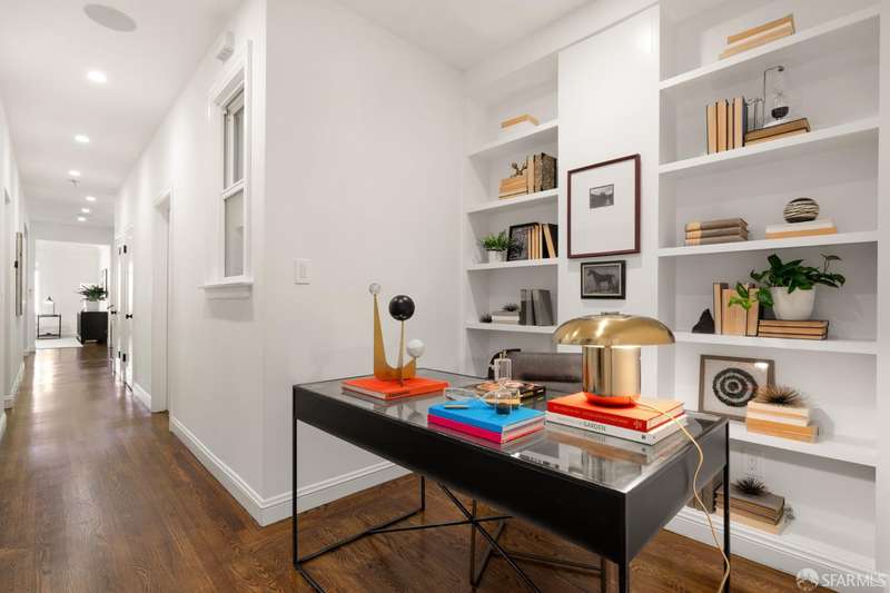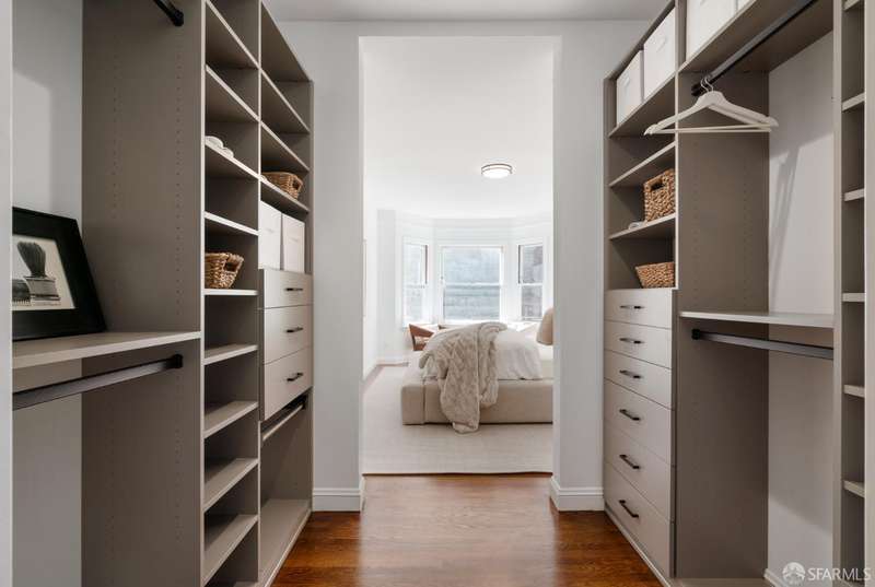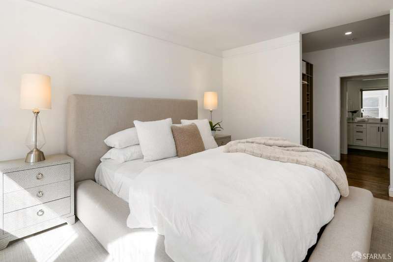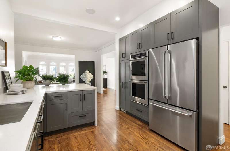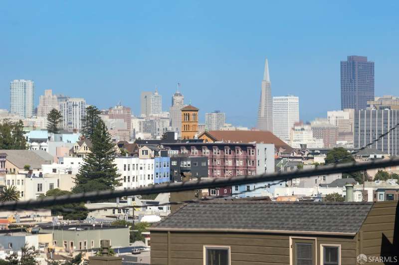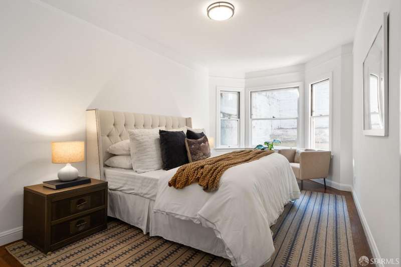 Experience sophisticated San Francisco living at its finest. This beautifully remodeled residence offers approximately 1,580 sq. ft. of refined interiors, including two spacious bedrooms, an office alcove, and two luxurious bathrooms. Period details such as parquet floors and elegant ceiling and wall moldings have been thoughtfully preserved, blending timeless charm with modern comfort. The living room captures sweeping views of Downtown San Francisco and features a decorative fireplace with custom built-ins. The chef's kitchen delights with two-tone cabinetry, quartz countertops, double ovens, an induction cooktop, and a bar-top peninsula that flows seamlessly into the expansive dining room. The primary suite exudes a resort-like ambiance with a custom closet, dual vanities, and a glass-enclosed walk-in shower. An informal two-unit HOA shares expenses equally, and the home includes one-car parking and an exclusive-use garden for private outdoor enjoyment.