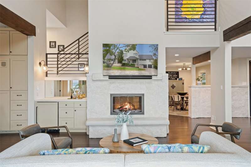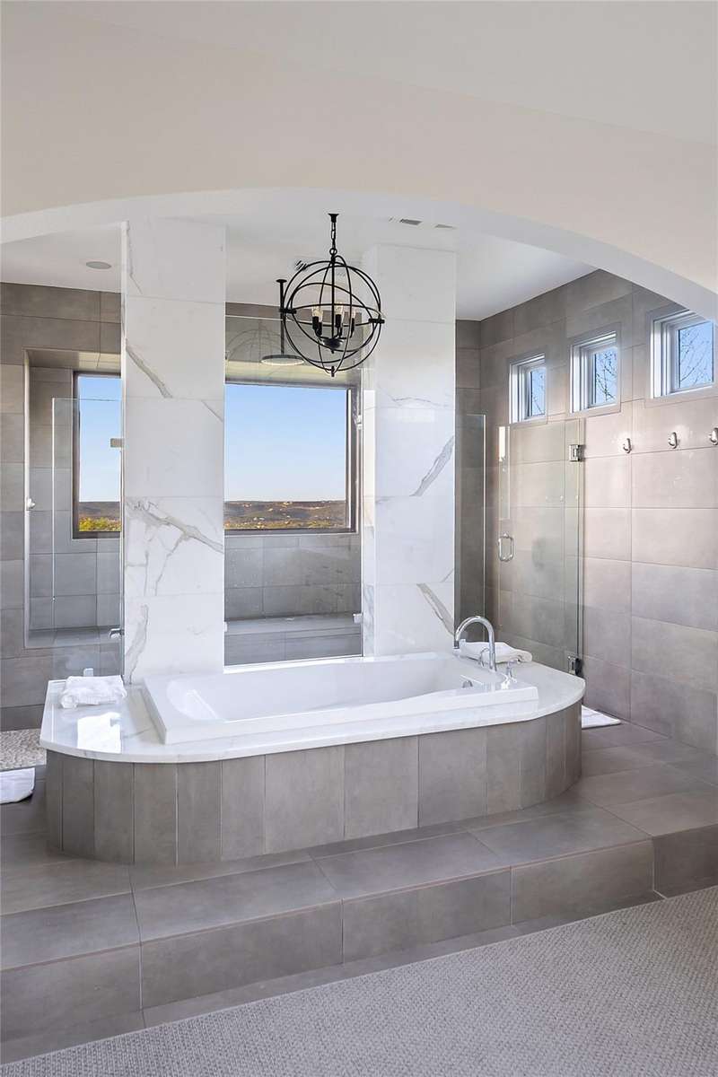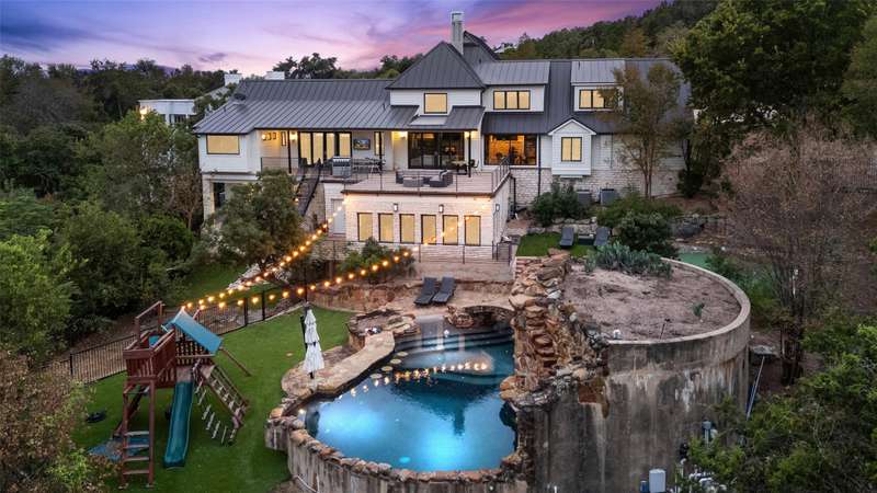 Designed for the ultimate entertainer, the home features a spacious game room, a dedicated wine room, and media room. The backyard boasts one of Austin's most talked-about swimming pools, with an extraordinary grotto housing a hot tub and a massive 12' diving well. Ample yard space provides the perfect setting for outdoor play and relaxation.