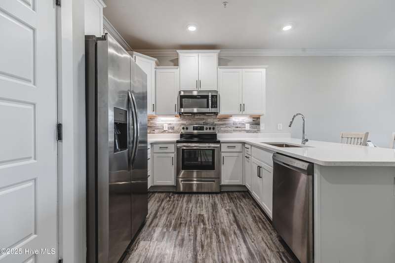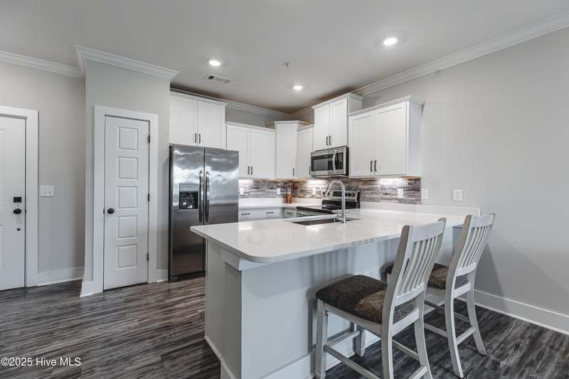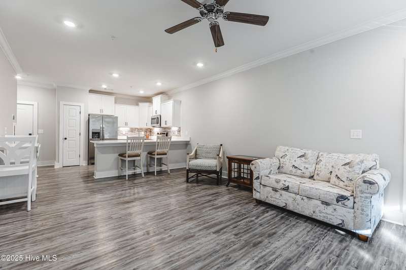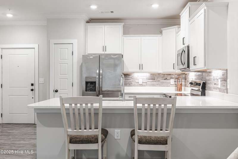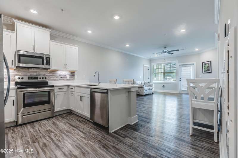 First floor, 2-bedroom, 2-bath condo in the desirable Crow Creek community. This like-new unit features luxury vinyl plank flooring in the main living areas, quartz countertops in both the kitchen and bathrooms, and a stylish shiplap accent wall in the living room. The open-concept layout flows seamlessly to a screened-in porch, perfect for relaxing and entertaining. Additional highlights include a whole-home dehumidifier and a location just across from the pool. Crow Creek offers exceptional amenities, including two outdoor pools, an indoor pool, fitness center, clubhouse, pickleball courts, and more. Ideal for a primary residence, second home, or investment property. Schedule your showing today!