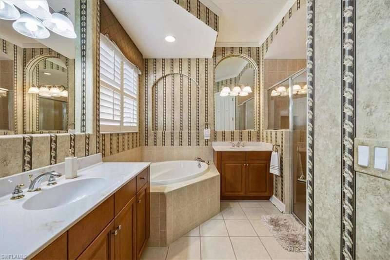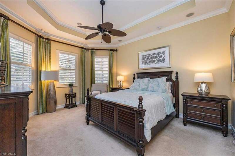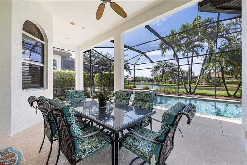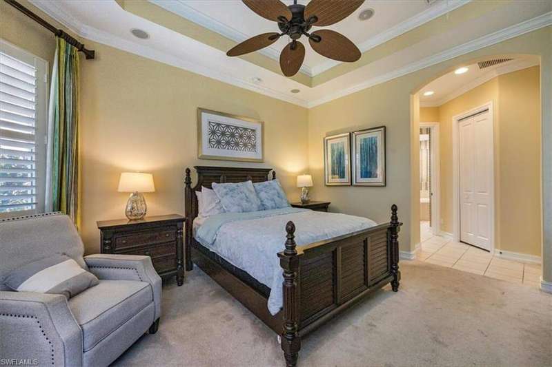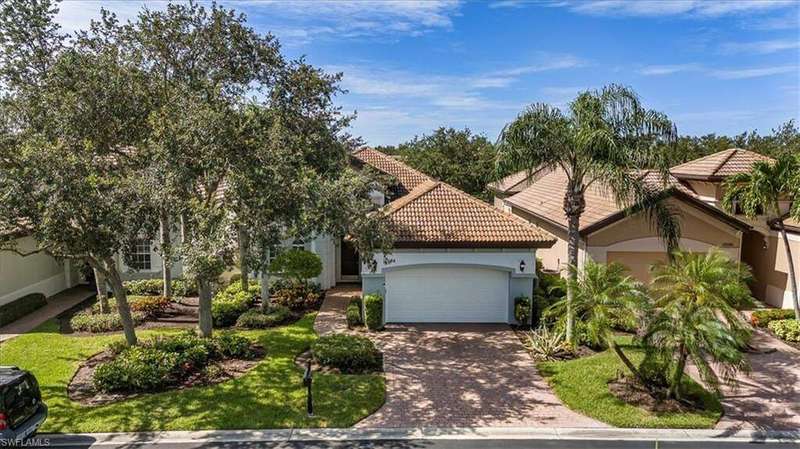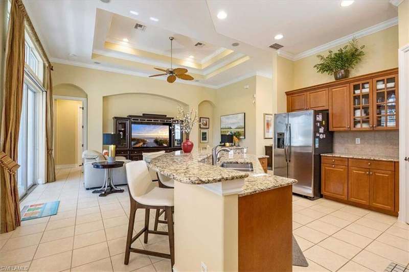 Stunning Lakefront Tivoli Model in Savona - Grandezza's Finest! Discover luxury living in this exquisite 4-bedroom, 2-bath Tivoli model home nestled in the prestigious Savona neighborhood of Grandezza Golf & Country Club. Boasting breathtaking lake views and coveted southern exposure, this home is a masterpiece of elegance and comfort, perfect for entertaining or serene relaxation. Golf membership is optional, allowing you to enjoy the vibrant Grandezza lifestyle your way. Prime Location: Just minutes from I-75, RSW Airport, Miromar Outlets, Gulf Coast Town Center, and an array of top-tier restaurants and shopping, this home offers unmatched convenience and accessibility. Key Features: Spacious & Modern Layout: 4 bedrooms, 2 baths with tile flooring throughout living areas, complemented by carpet and hardwood in bedrooms. The open-concept design seamlessly connects the kitchen, great room, and breakfast nook, all flowing to the lanai with heated pool and spa. Gourmet Kitchen: Features granite countertops, accent tiled backsplash, cabinets with crown molding, a curved breakfast bar, and a large pantry. The breakfast nook, surrounded by bay windows, overlooks the lanai and lake. Great Room & Entertainment: A wall of sliding doors in living area, showcasing lush landscaping and tranquil lake views. Enjoy built-in surround sound speakers and a large niche perfect for an entertainment center. Luxurious Master Suite: Opens to the lanai with a wall of windows, offering stunning morning views. Includes two walk-in closets, dual vanities, a corner tub, and a spacious walk-in shower. Elegant Details: Tray ceilings, crown molding, plantation shutters, decorative window treatments, and a unique formal dining room transformed into an open sitting room or study via a vast archway. Outdoor Oasis: Relax by the heated pool and spa on the lanai, with serene lake views framed by lush landscaping. Grandezza Amenities: Indulge in a resort-style pool and spa, tennis courts, bocce ball, walking paths, a fully equipped fitness center, and a 53,000 sq. ft. clubhouse with a pro shop and dining. Optional 18-hole golf course membership available. Designer-decorated in neutral tones, this home exudes sophistication with tiled floors, tiered tray ceilings, and a seamless blend of indoor-outdoor living. Perfect for those seeking a model-perfect home with unparalleled style and functionality. Don't Miss Out! Schedule a showing today to experience the luxury, views, and lifestyle of this Tivoli model in Savona, Grandezza. No Flood Insurance required...located in desirable Zone "X" dream home awaits!