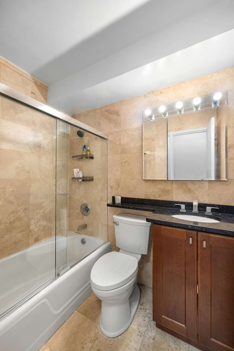 The large north facing living room is currently configured with a wall creating a second bedroom/home office, which can stay or be easily removed depending on one's needs. The quiet and bright king sized bedroom faces south, and the updated bathroom has floor to ceiling beige tiling, a large medicine cabinet and a glass enclosed shower.