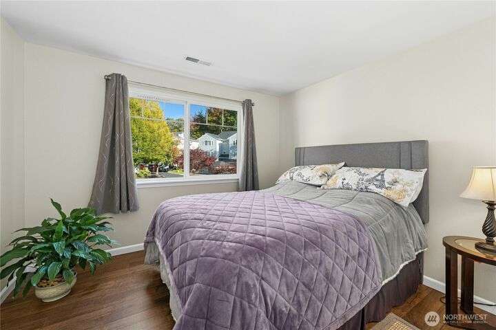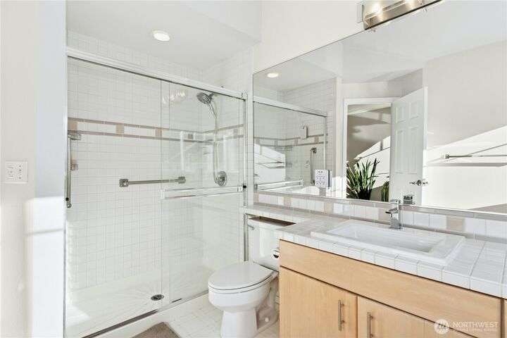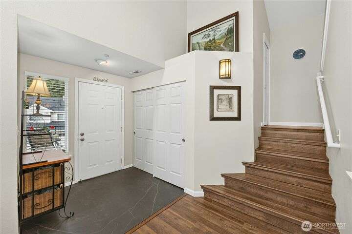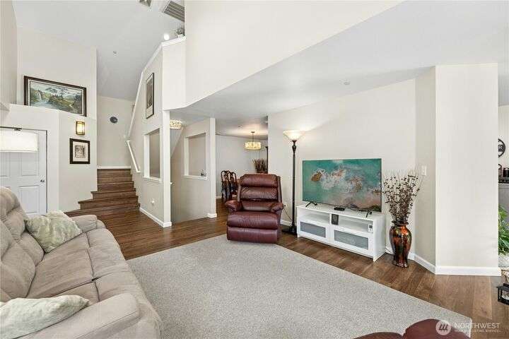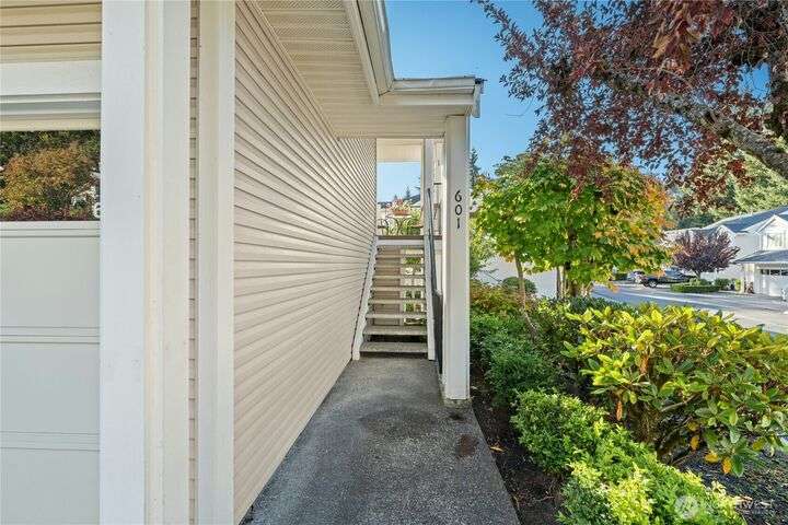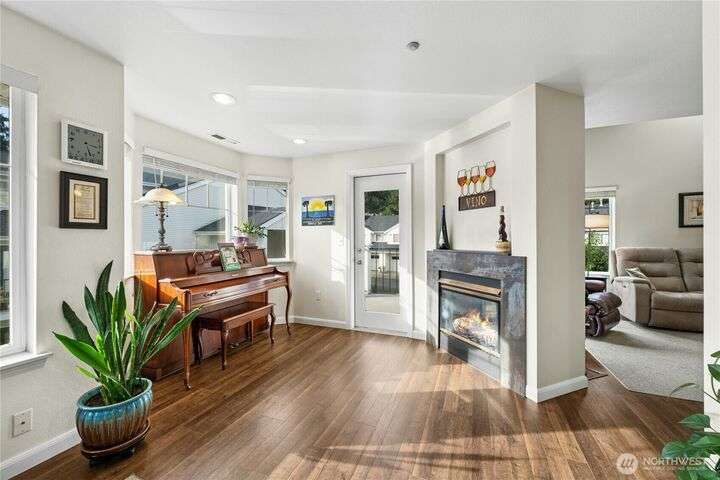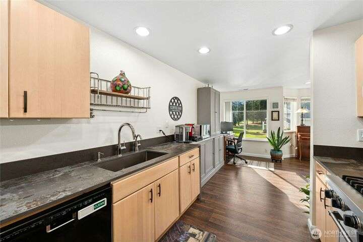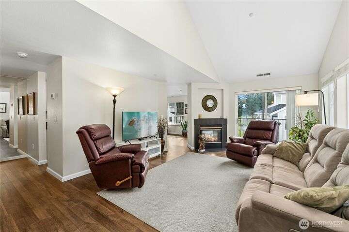 This bright and spacious 3-bed, 1.75-bath condo offers 1,676 sq ft of beautifully maintained living space. Vaulted ceilings with skylights and a cozy, double sided, gas fireplace create a warm, inviting living room. Sliders open to a private deck with peaceful fountain and golf course views. The sleek kitchen provides abundant cabinetry, and the dining area allows for formal dining. A versatile flex space off the kitchen can be used for an office or family room or informal dining . The primary suite features a dual-vanity ensuite and large walk-in closet. This desirable second-floor unit includes a welcoming front deck, 2-car garage with interior stairs, and guest parking. Convenient NE Tacoma location near I-5, parks, and local amenities.