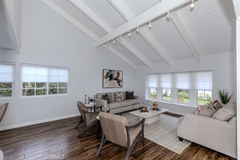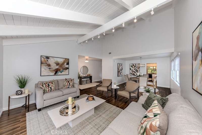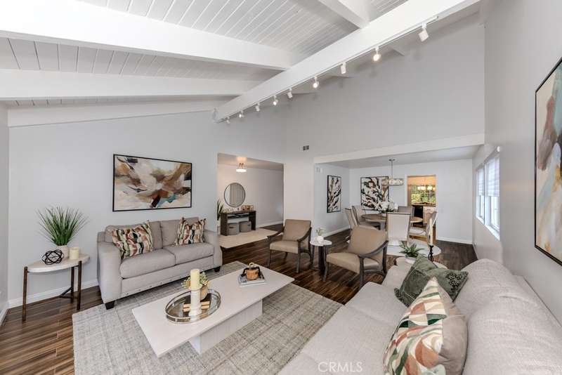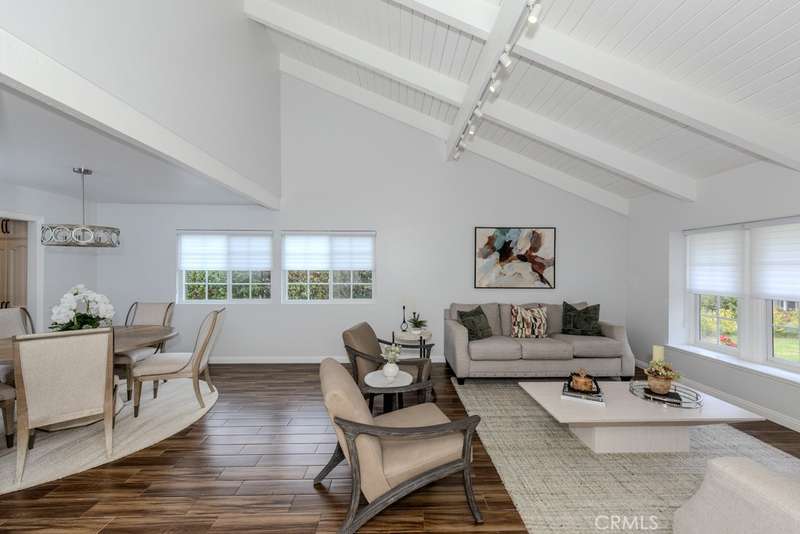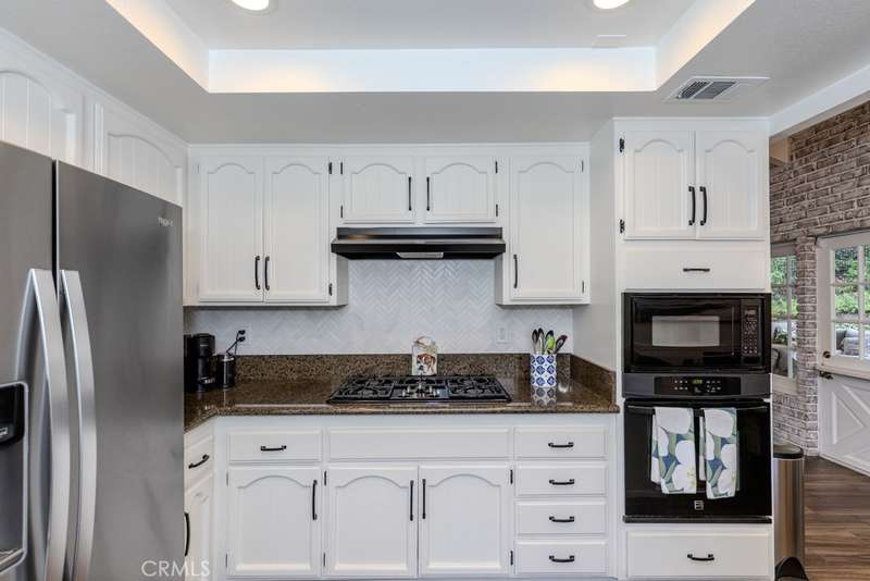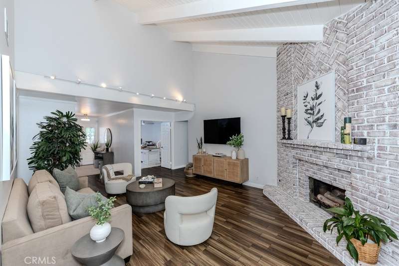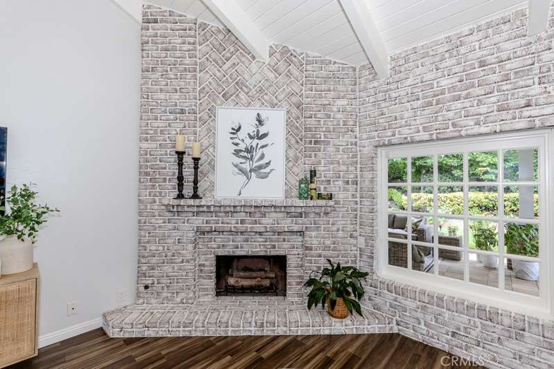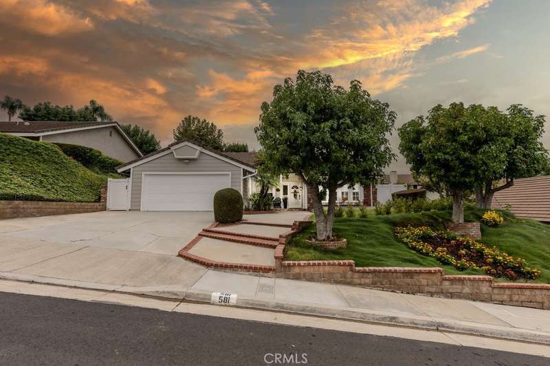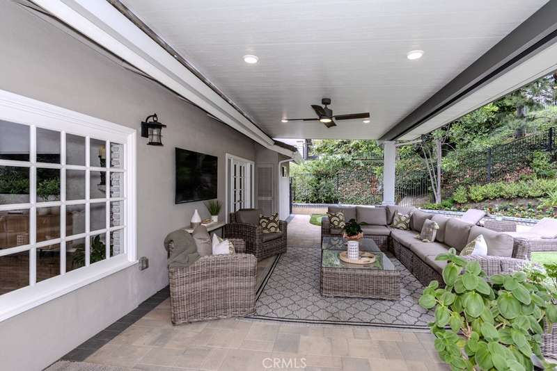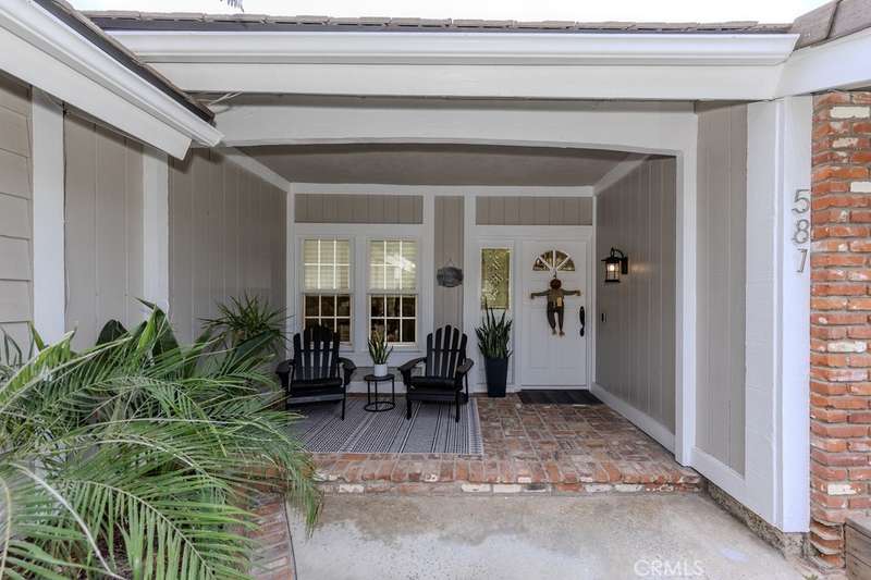 Single-story 3-bedroom 2-bath view home at 581 S Paseo Carmel in Anaheim Hills offers city lights and mountain vistas along with a spacious primary suite and a backyard retreat built for entertaining. The property begins with great curb appeal, wood siding with brick accents, and a landscaped approach. A covered entry functions as a front patio seating area and sets a welcoming tone. Inside, wood-look tile flooring runs throughout with no interior steps. The main living area opens under vaulted wood beam ceilings with abundant natural light, creating a bright and open feel that blends into the dining area. A hallway with a double-door storage closet leads toward the family room, where vaulted ceilings continue above a tall whitewashed brick fireplace wall. The family room flows into a kitchen nook finished with wainscoting and wood accents, positioned beside large windows for natural light. The kitchen is anchored by a peninsula counter and finished with granite countertops, a herringbone marble mosaic backsplash, recessed lighting, and a deep sink. A garden bay window offers extra display space. Appliances include a gas cooktop, oven, dishwasher, and trash compactor. Pull-out drawers add convenience, and the adjacent dining space accommodates a full table. The primary suite features double door entry, vaulted ceilings with a ceiling fan, dual mirrored wardrobes, and French doors with operable side windows. Its en suite bath offers dual granite vanities, a walk-in shower with seating bench, a private water closet, and large travertine tile finishes. The second bedroom, also with double-door entry, is used as an office with ceiling fan and mirrored closet, while the third bedroom includes the same. The guest bath is a full bath with granite vanity and large travertine tile shower surround. The laundry room is inside with overhead cabinetry. The attached two-car garage provides direct access, storage cabinets, and overhead racks. The backyard is designed as an entertainer's retreat, featuring a large Luminwood patio cover with recessed lighting and dual ceiling fans, paver hardscape, built-in barbecue with bar seating, a decorative glass gas fireplace, turf, and a putting green. Mature trees along the rear add privacy while framing the city lights and mountain views. Located minutes from shopping, dining, and parks with nearby access to freeways and award-winning schools, this property offers a single-level lifestyle with outdoor amenities and relaxing views