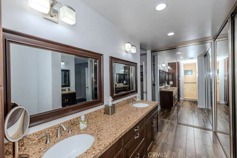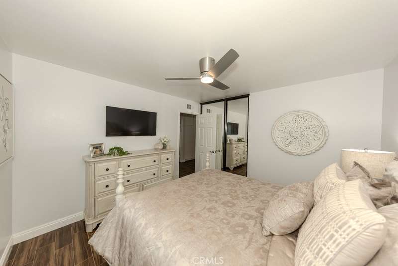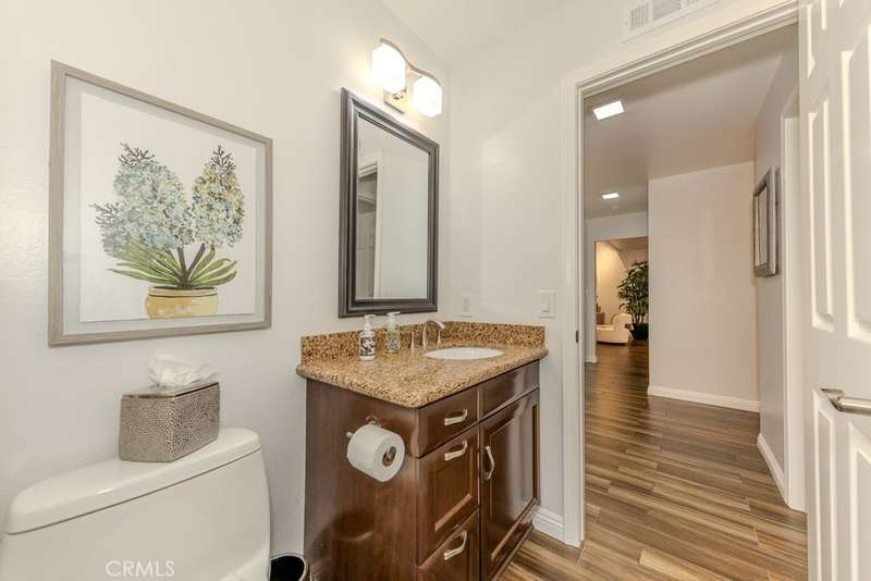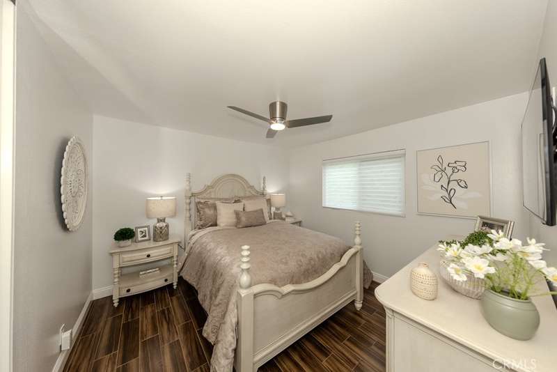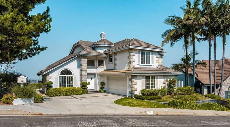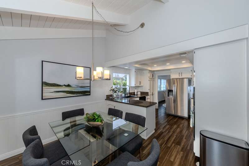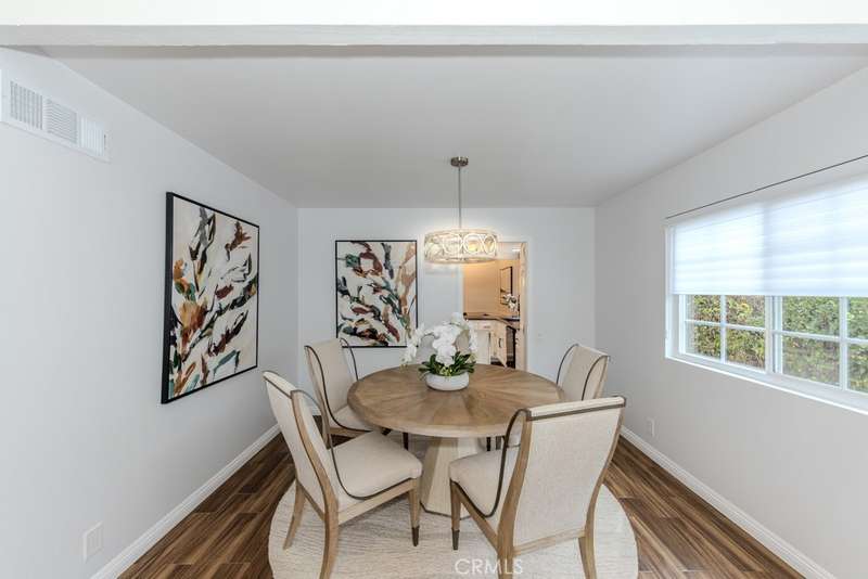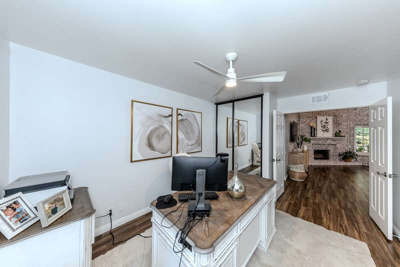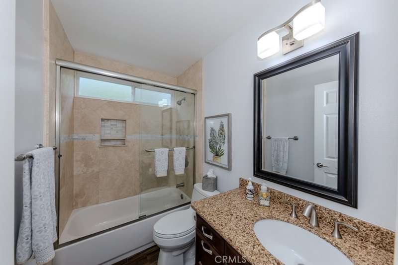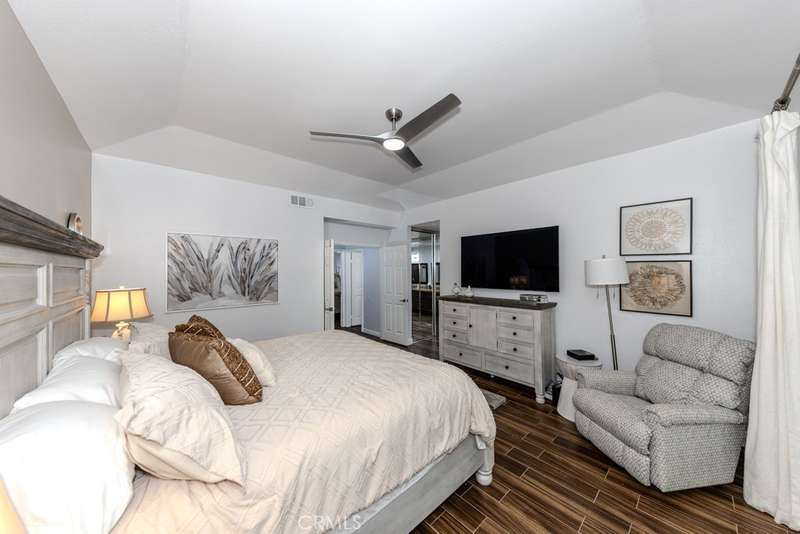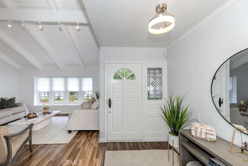 Single-story 3-bedroom 2-bath view home at 581 S Paseo Carmel in Anaheim Hills offers city lights and mountain vistas along with a spacious primary suite and a backyard retreat built for entertaining. The property begins with great curb appeal, wood siding with brick accents, and a landscaped approach. A covered entry functions as a front patio seating area and sets a welcoming tone. Inside, wood-look tile flooring runs throughout with no interior steps. The main living area opens under vaulted wood beam ceilings with abundant natural light, creating a bright and open feel that blends into the dining area. A hallway with a double-door storage closet leads toward the family room, where vaulted ceilings continue above a tall whitewashed brick fireplace wall. The family room flows into a kitchen nook finished with wainscoting and wood accents, positioned beside large windows for natural light. The kitchen is anchored by a peninsula counter and finished with granite countertops, a herringbone marble mosaic backsplash, recessed lighting, and a deep sink. A garden bay window offers extra display space. Appliances include a gas cooktop, oven, dishwasher, and trash compactor. Pull-out drawers add convenience, and the adjacent dining space accommodates a full table. The primary suite features double door entry, vaulted ceilings with a ceiling fan, dual mirrored wardrobes, and French doors with operable side windows. Its en suite bath offers dual granite vanities, a walk-in shower with seating bench, a private water closet, and large travertine tile finishes. The second bedroom, also with double-door entry, is used as an office with ceiling fan and mirrored closet, while the third bedroom includes the same. The guest bath is a full bath with granite vanity and large travertine tile shower surround. The laundry room is inside with overhead cabinetry. The attached two-car garage provides direct access, storage cabinets, and overhead racks. The backyard is designed as an entertainer's retreat, featuring a large Luminwood patio cover with recessed lighting and dual ceiling fans, paver hardscape, built-in barbecue with bar seating, a decorative glass gas fireplace, turf, and a putting green. Mature trees along the rear add privacy while framing the city lights and mountain views. Located minutes from shopping, dining, and parks with nearby access to freeways and award-winning schools, this property offers a single-level lifestyle with outdoor amenities and relaxing views