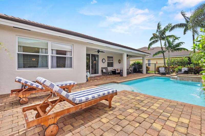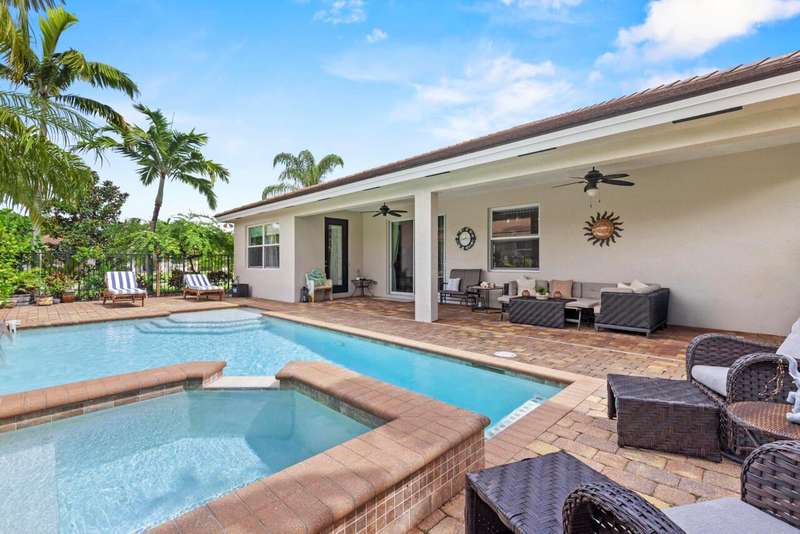 Absolutely stunning former model home built by DR Horton! This solid CBS residence features a classic barrel tile roof, brick paver driveway, showcasing timeless curb appeal. Offering 4 bedroom 2 baths and a spacious open-concept floor plan with split bedrooms this home is both elegant and functional. Enjoy modern fans and stylish light fixtures throughout. Along with a separate laundry room for added convenience. Step outside to your private oasis featuring a beautiful heated pool and spa-perfect for entertaining or relaxing year-round. The oversized 2+ Car Garage provides extra space for storage. Located in The Pines a desirable community offering a park, playground, half basketball court, picnic area, and a fitness trail idea for outdoor fun and staying active. Top Rated A+ School