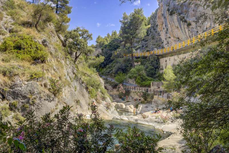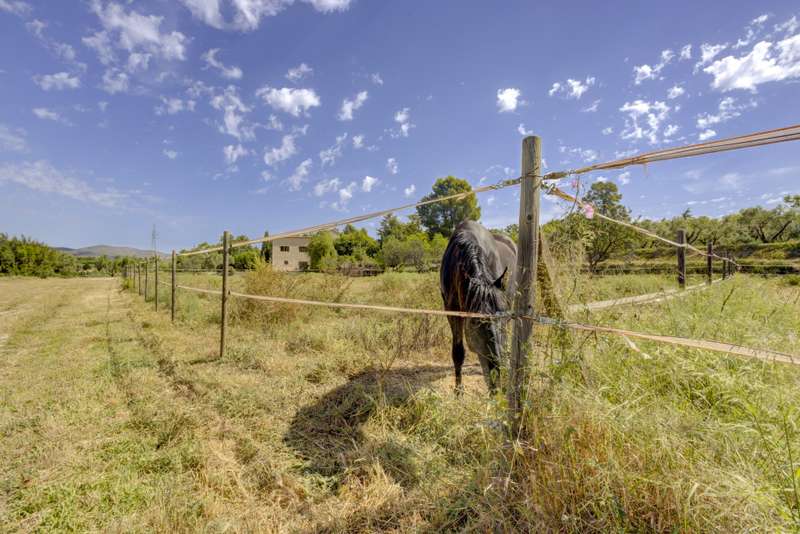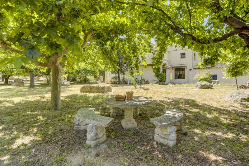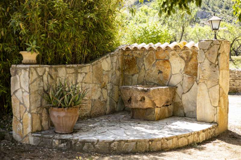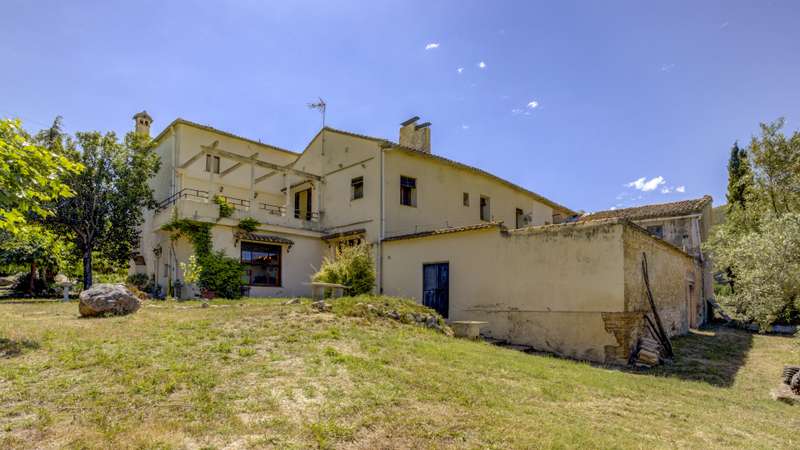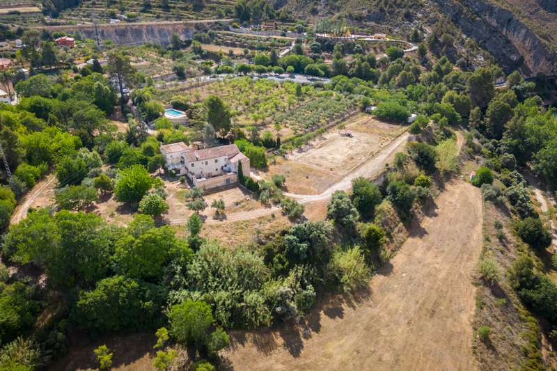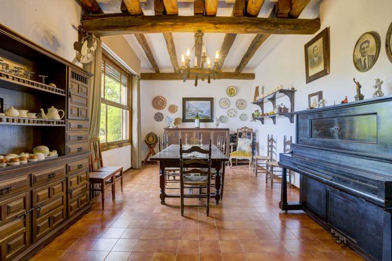 Situated next to a unique natural spot in the Valencian Community, the Pou Clar, in the town of Ontinyent, this rustic property has a constructed area of 1.069m2 and a plot of 58.640m2. It is worth mentioning that the land is cultivated with almond and olive trees, the latter being used for the extraction of olive oil for its own use. The estate has terraced fields which slope down to the Clariano riverbank. A large irrigation ditch that serves the vegetable garden runs through the plot. The property has several areas: the first and main one corresponds to the location of the house and its immediate surroundings. This area consists of the house communicated with the cultivated fields, the swimming pool area which is filled directly by the waters of the Pou Clar and a wooded area destined for private recreational activities. The second area, the highest and most central one, corresponds to the dry farming area. It has centenary olive trees distributed on five levels, as well as an area dedicated to horse breeding with stables. The third area, the lowest, houses a space for growing vegetable crops. Finally, the fourth and smaller area is a wild space with vegetation typical of the area and a semi-permanent watercourse. The estate forms part of the Catalogue of protected buildings in the rural environment of the town of Ontinyent. As for the building itself, it dates back to the 19th century, although it was later renovated in the 1970s. It is an old dry farming house that has been converted into a single-family home. It has a rectangular main body, two bays and three levels. The living room and the fireplace area are located in the first bay of the ground floor, while the second one houses the kitchen, the services and the stairs. The upper levels accommodate the bedrooms. There are several annexes consisting of living rooms, bedrooms and toilets, as well as storerooms and old corrals, the latter located at the back of the building. There is also a well for collecting rainwater and an old olive-oil mill. Some of the elements used on the main façade and porch are metal and wood, tiles, wooden beams and multi-pitched Arabic tiles.
