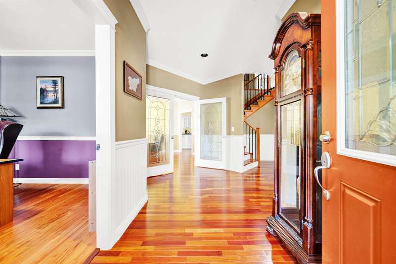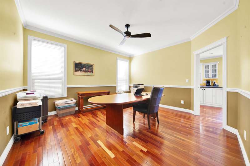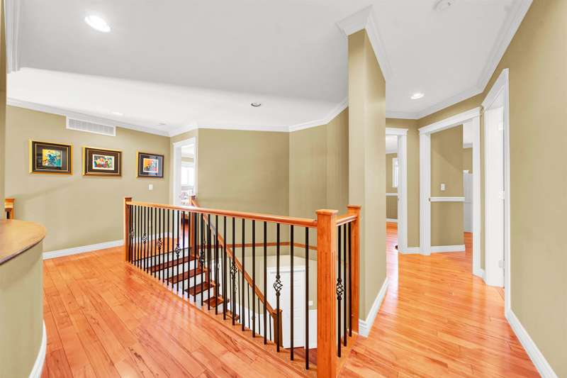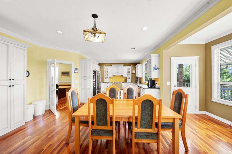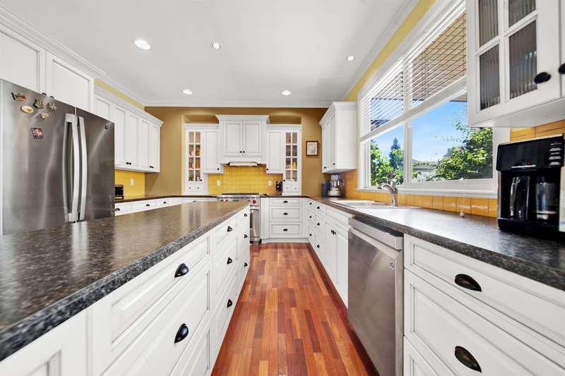 Gorgeous custom built 2 Storey with Legal Basement Suite. Huge kitchen features a large island and tons of Heritage cabinets. Spacious living, dining & eating area all with beautiful Hardwood floors. Den near front door with easy front door and Front Porch access. Deck off kitchen, patio covered for the suite & a large top floor balcony with view. Huge primary bedroom with large ensuite & a second bedroom with 4 pce ensuite. Instant HW. Sunny western exposed private backyard, fully fenced. 1.5 Blks from the Elementary school. Great neighborhood with walking trails too