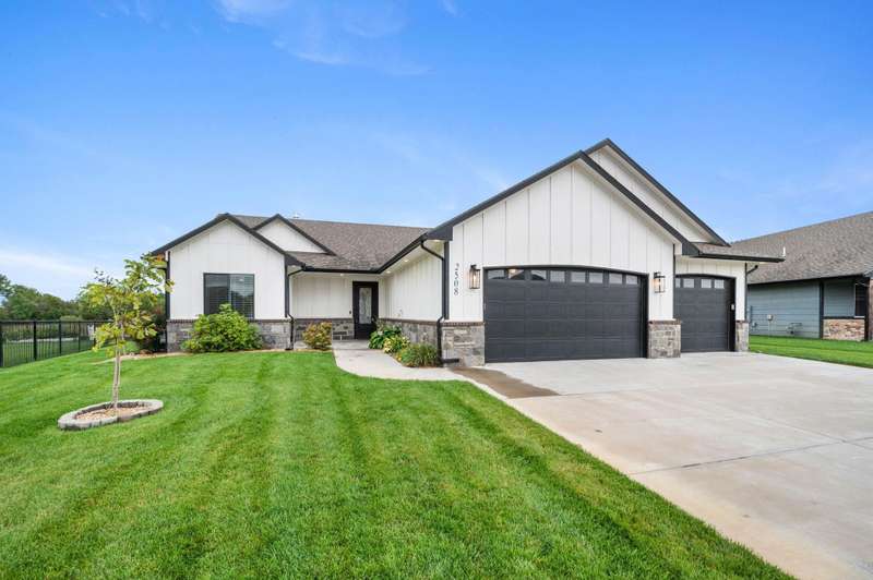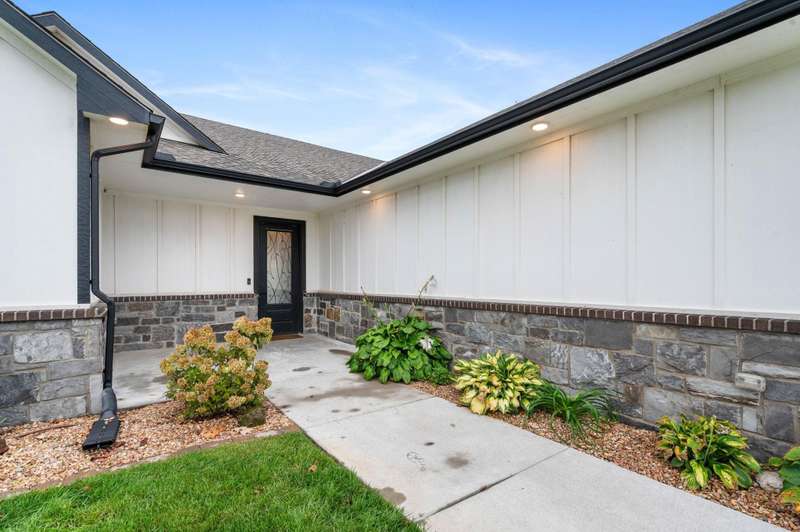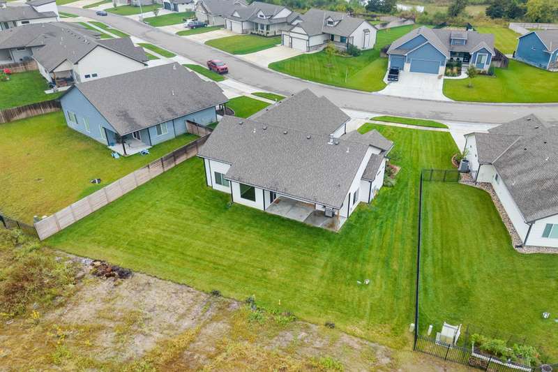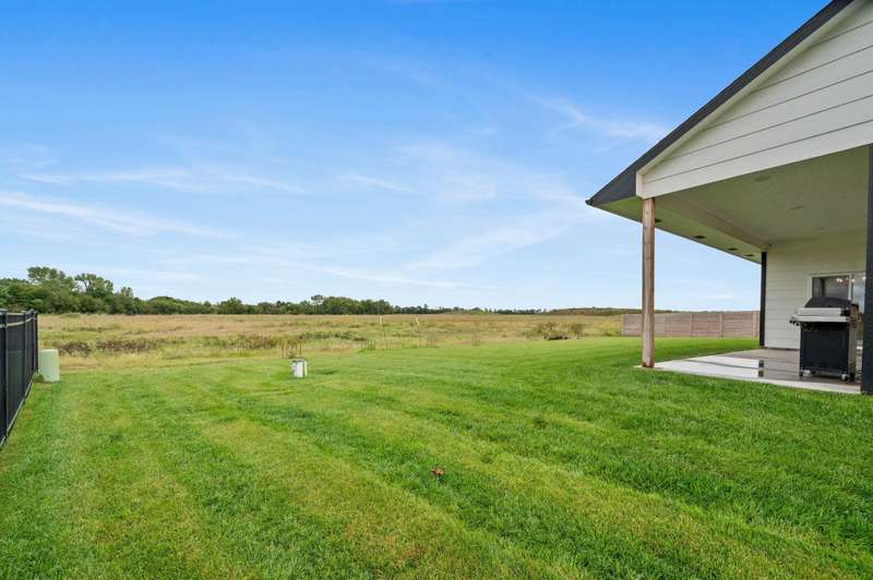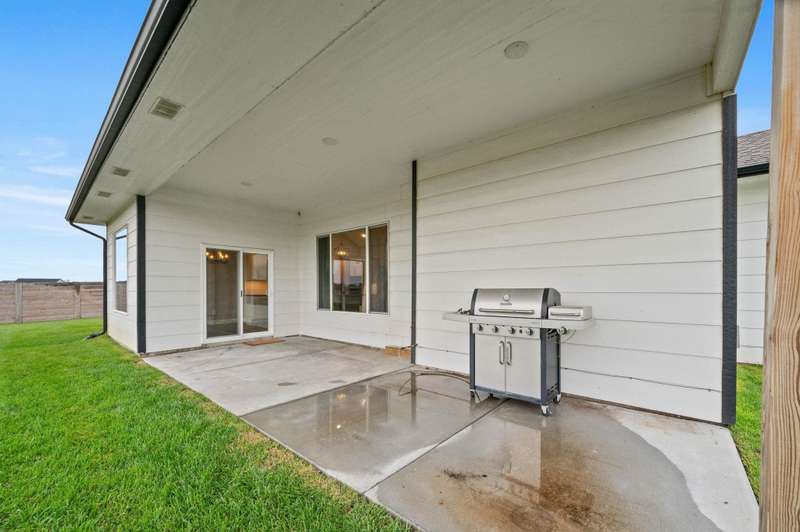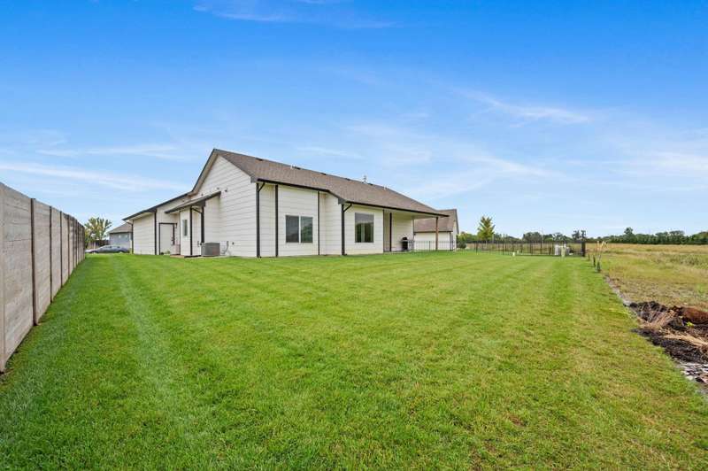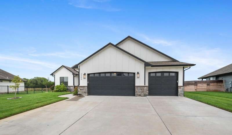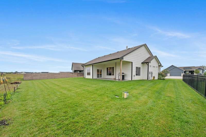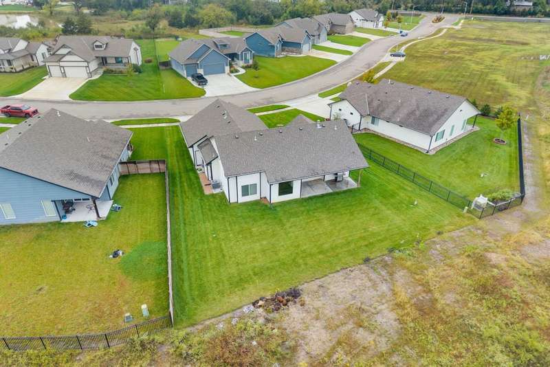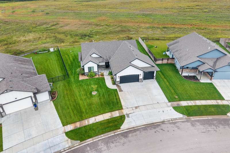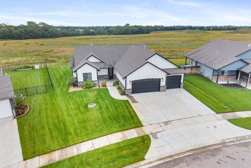 This stunning zero-entry slab home offers fantastic curb appeal and better than new features throughout. With 3 bedrooms, 2.5 bathrooms, and an oversized 3-car garage, it backs to serene farmland, providing both privacy and picturesque views. Inside, you'll find vaulted ceilings, abundant natural light, and a cozy gas fireplace that set the tone for comfortable living. The kitchen is a chef's delight, complete with all appliances, a pot filler, a spacious island, and a pantry with space for a beverage refrigerator. The adjoining dining area is perfect for both everyday meals and entertaining. The saferoom doubles as a tornado shelter, offering peace of mind. Retreat to the inviting master suite, featuring a spa-like bathroom with a standalone soaking tub, large walk-in shower, and makeup vanity. Step outside to the expansive covered patio equipped with a gas grill, where you can relax, watch wildlife, and enjoy tranquil country views. Community amenities include a swimming pool and pickleball court. This home offers the best of both worlds: quiet surroundings with easy access to all that Wichita has to offer.
