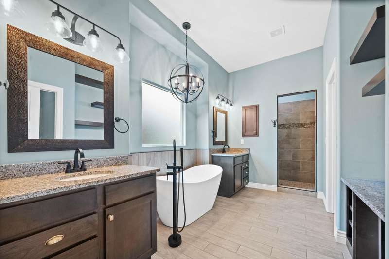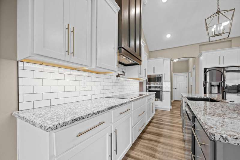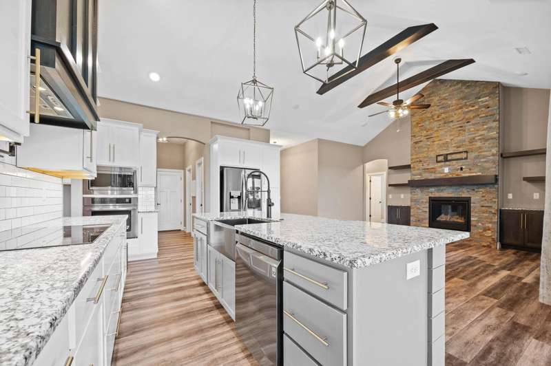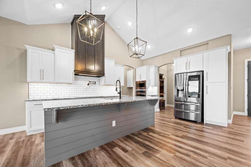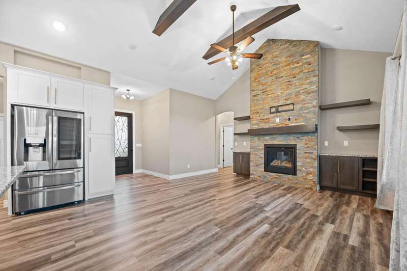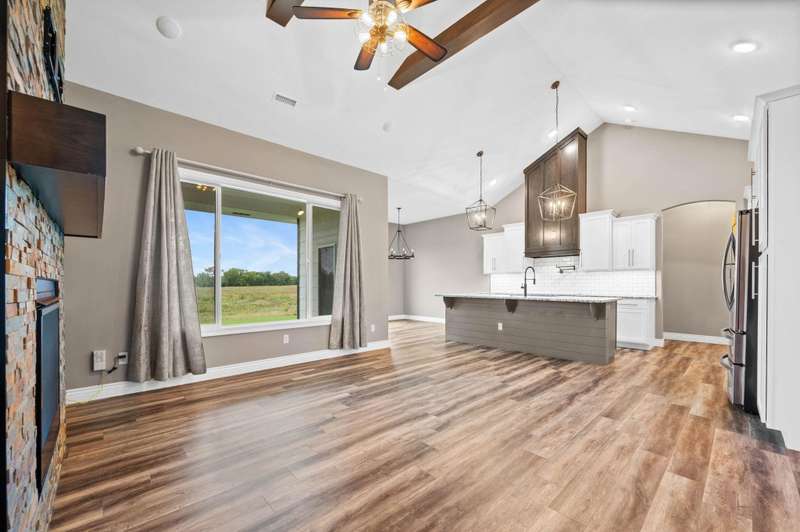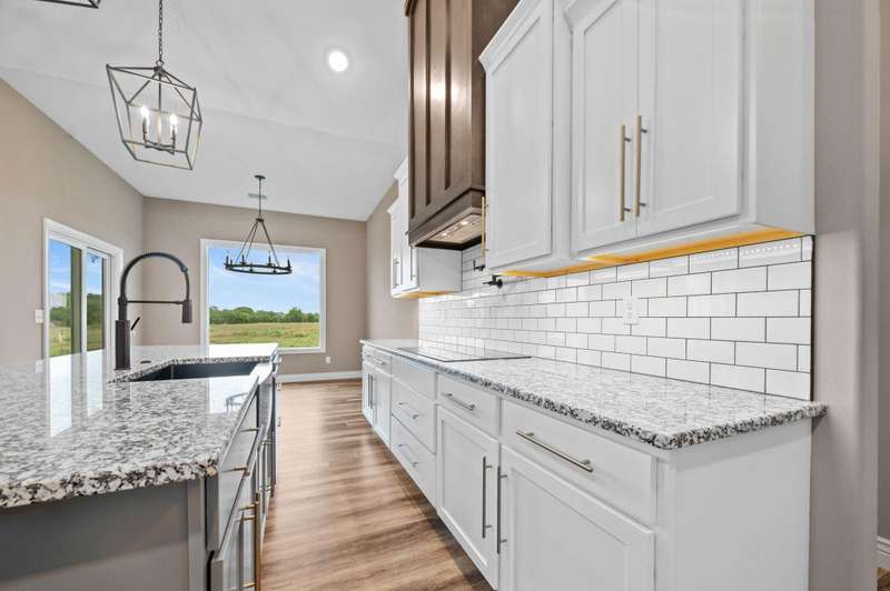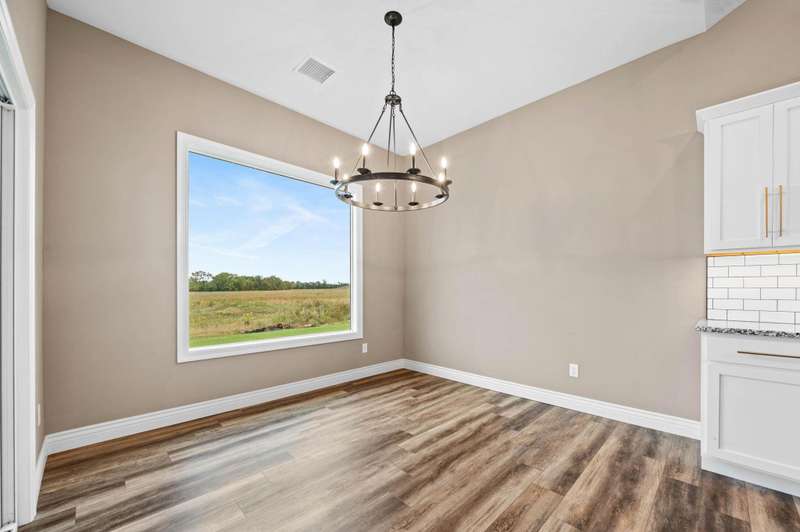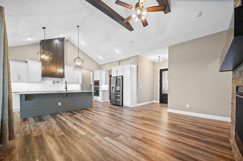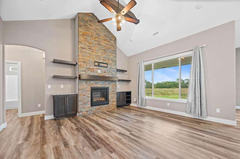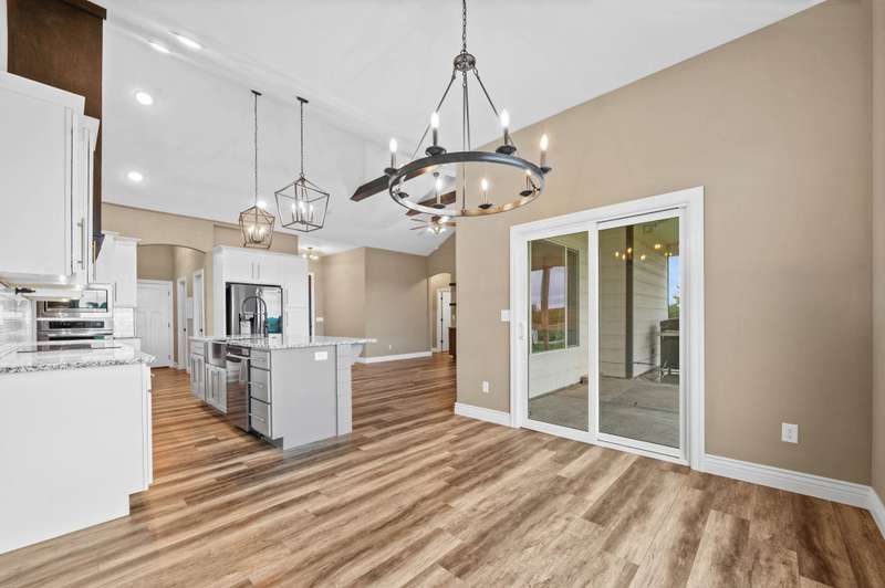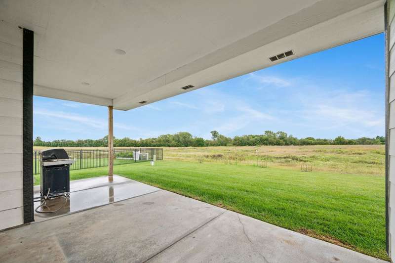 This stunning zero-entry slab home offers fantastic curb appeal and better than new features throughout. With 3 bedrooms, 2.5 bathrooms, and an oversized 3-car garage, it backs to serene farmland, providing both privacy and picturesque views. Inside, you'll find vaulted ceilings, abundant natural light, and a cozy gas fireplace that set the tone for comfortable living. The kitchen is a chef's delight, complete with all appliances, a pot filler, a spacious island, and a pantry with space for a beverage refrigerator. The adjoining dining area is perfect for both everyday meals and entertaining. The saferoom doubles as a tornado shelter, offering peace of mind. Retreat to the inviting master suite, featuring a spa-like bathroom with a standalone soaking tub, large walk-in shower, and makeup vanity. Step outside to the expansive covered patio equipped with a gas grill, where you can relax, watch wildlife, and enjoy tranquil country views. Community amenities include a swimming pool and pickleball court. This home offers the best of both worlds: quiet surroundings with easy access to all that Wichita has to offer.