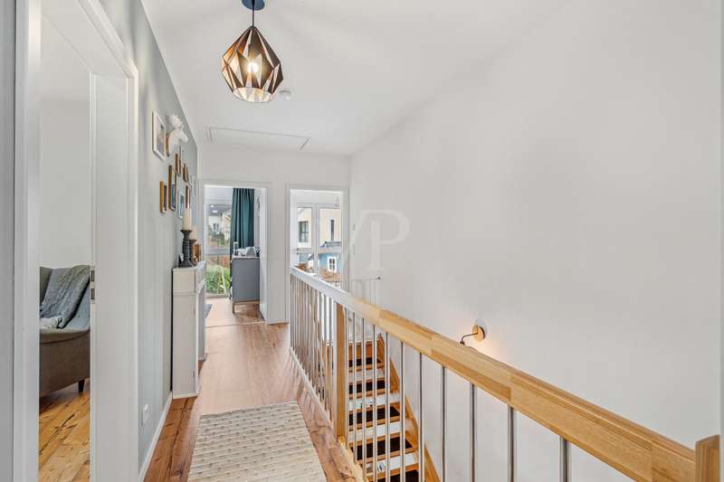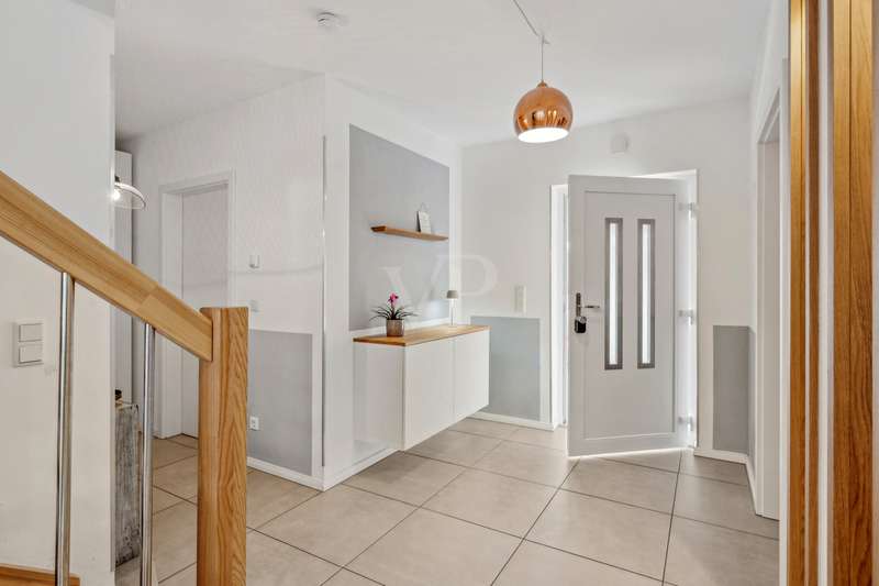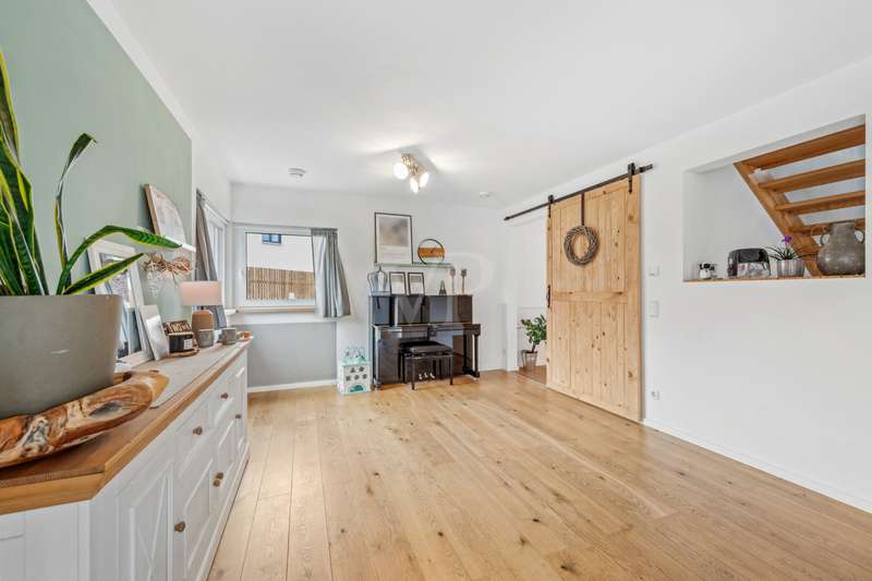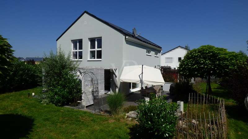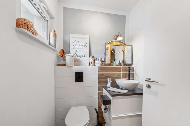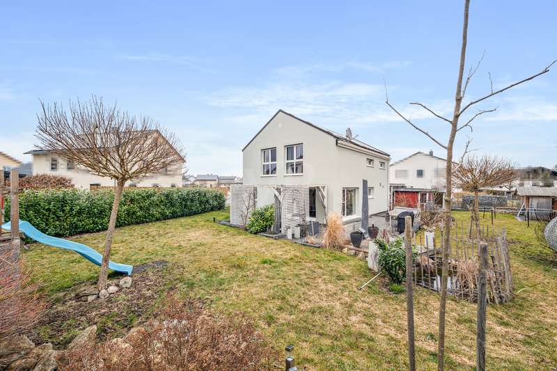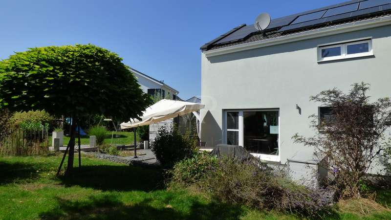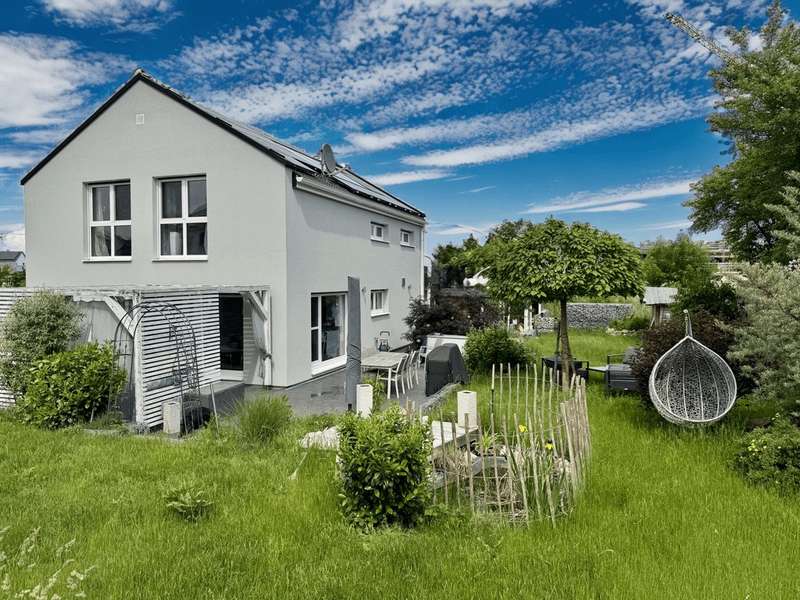 Are you looking for an existing property - finally without a renovation or even modernization backlog? Under the motto "View - Fall in love - Purchase - Move in", we are particularly targeting families and couples who would like to use the modern rooms immediately without having to invest in maintenance work first. Built in 2017 with energy efficiency in mind, the house offers 160 m² of living space on 2 floors, 7 bedrooms, 2 bathrooms and a large, well-kept garden. With an energy balance of just 29 kWh/a/m², you will have your heating costs under control in the long term. The compact exterior impression of the building gives way to a surprisingly spacious interior. The living area on the first floor is very open-plan with a kitchen, dining and living area and is completely covered with high-quality real wood parquet. The small but cozy TV room or master bedroom, where you can relax after a hectic day at work, is particularly charming. The high-quality open kitchen offers enough space for culinary activities and intense family moments. There is also a practical, modern shower room on the first floor and the utility room, which houses the modern building services. A highlight is the large terrace in front of the living room, which opens onto the spacious garden. There is a playground and a small pond in the garden, while a garden shed offers additional storage space. The upper floor of the house houses the master bedroom with an additional dressing room, two beautiful children's bedrooms, a room that can be used as an office and a modern and comfortable daylight bathroom. The house is technically state-of-the-art: it has a central ventilation system with heat recovery, which ensures optimum air quality, as well as a solar thermal system for heating water. In addition, a photovoltaic system with an output of 5.61 kWp including a 10 kWh storage unit was installed. In addition to covering their own consumption, the owners currently achieve an additional annual energy yield of around 6,000 kWh with a remuneration of 8.16 cents per kWh. Also worth mentioning is the integrated, maintenance-free water softening system, which ensures high drinking water quality. The offer is rounded off by a garage with an integrated wallbox, a carport and a parking space. Arrange a viewing appointment and see this exceptional opportunity for yourself.