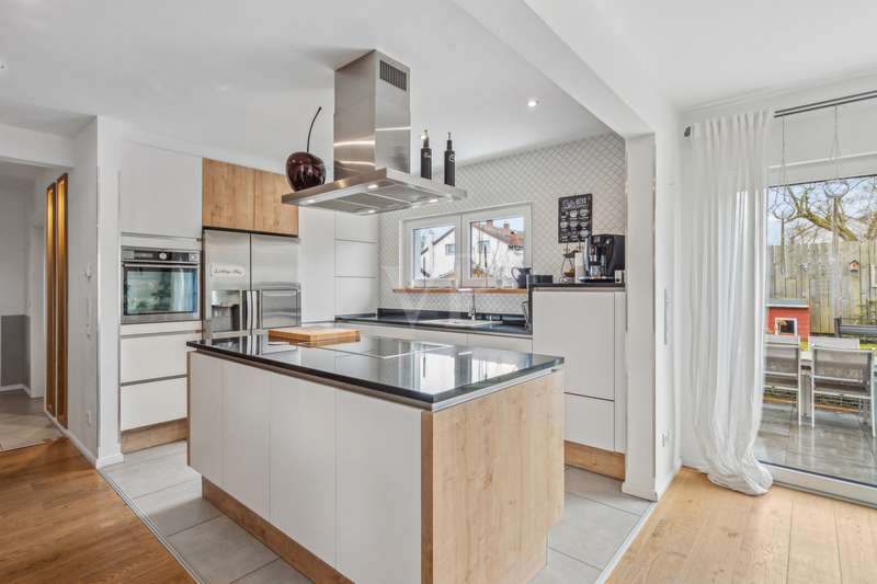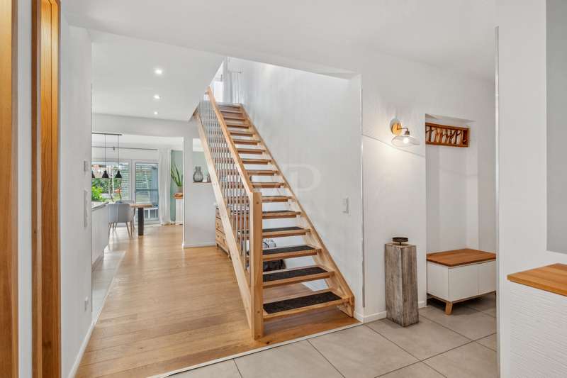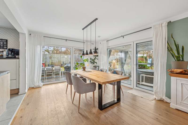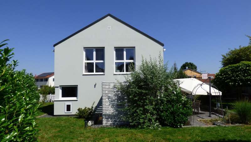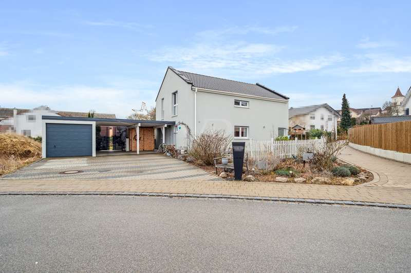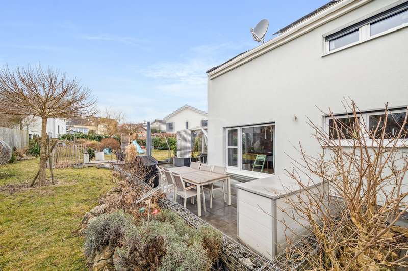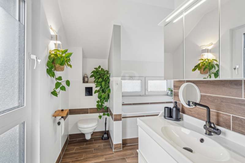 Are you looking for an existing property - finally without a renovation or even modernization backlog? Under the motto "View - Fall in love - Purchase - Move in", we are particularly targeting families and couples who would like to use the modern rooms immediately without having to invest in maintenance work first. Built in 2017 with energy efficiency in mind, the house offers 160 m² of living space on 2 floors, 7 bedrooms, 2 bathrooms and a large, well-kept garden. With an energy balance of just 29 kWh/a/m², you will have your heating costs under control in the long term. The compact exterior impression of the building gives way to a surprisingly spacious interior. The living area on the first floor is very open-plan with a kitchen, dining and living area and is completely covered with high-quality real wood parquet. The small but cozy TV room or master bedroom, where you can relax after a hectic day at work, is particularly charming. The high-quality open kitchen offers enough space for culinary activities and intense family moments. There is also a practical, modern shower room on the first floor and the utility room, which houses the modern building services. A highlight is the large terrace in front of the living room, which opens onto the spacious garden. There is a playground and a small pond in the garden, while a garden shed offers additional storage space. The upper floor of the house houses the master bedroom with an additional dressing room, two beautiful children's bedrooms, a room that can be used as an office and a modern and comfortable daylight bathroom. The house is technically state-of-the-art: it has a central ventilation system with heat recovery, which ensures optimum air quality, as well as a solar thermal system for heating water. In addition, a photovoltaic system with an output of 5.61 kWp including a 10 kWh storage unit was installed. In addition to covering their own consumption, the owners currently achieve an additional annual energy yield of around 6,000 kWh with a remuneration of 8.16 cents per kWh. Also worth mentioning is the integrated, maintenance-free water softening system, which ensures high drinking water quality. The offer is rounded off by a garage with an integrated wallbox, a carport and a parking space. Arrange a viewing appointment and see this exceptional opportunity for yourself.