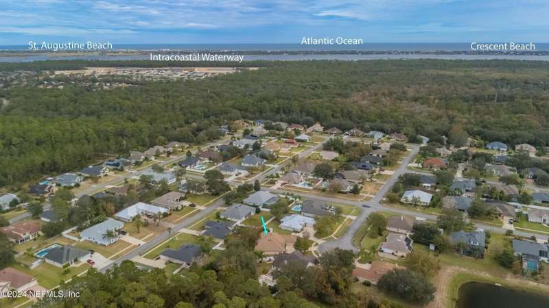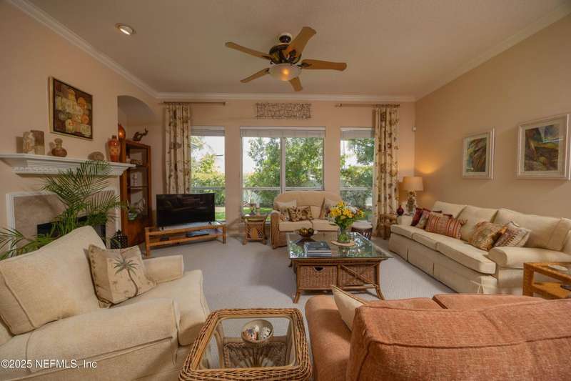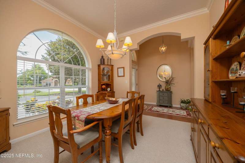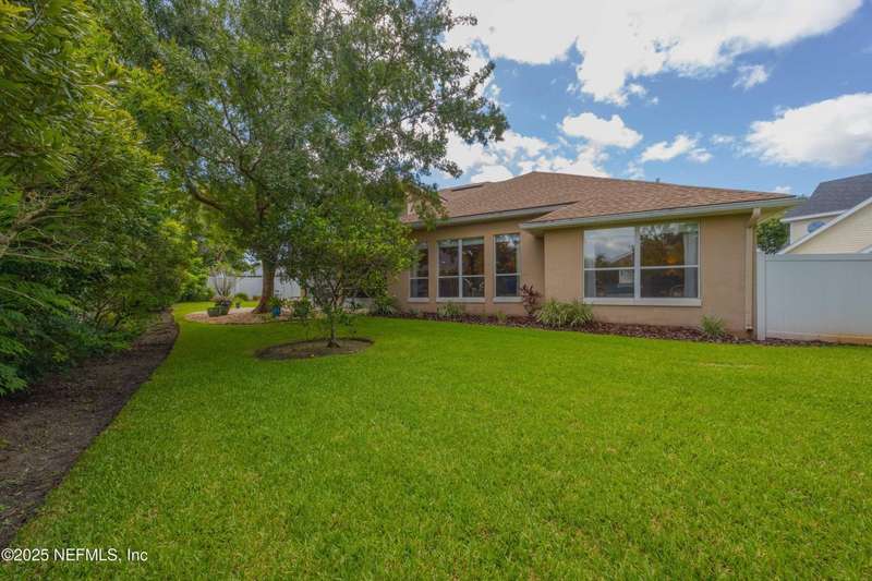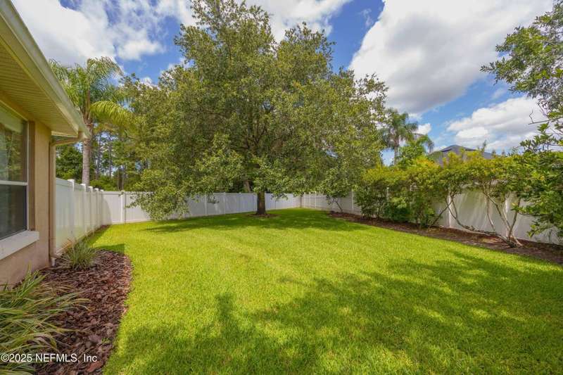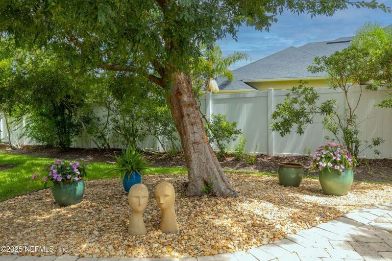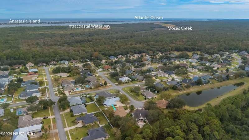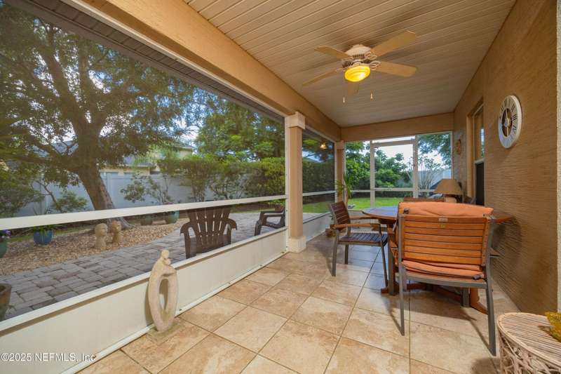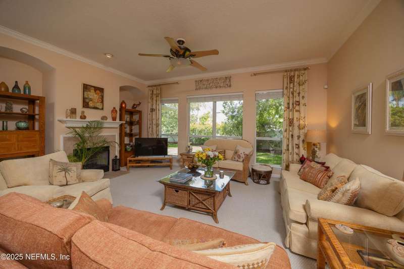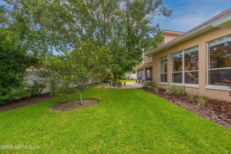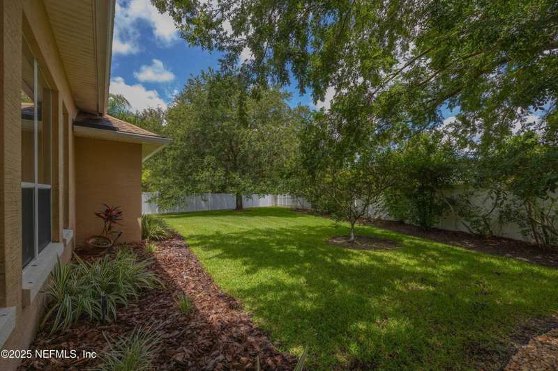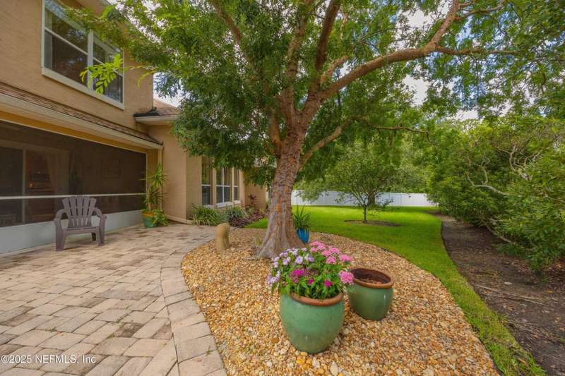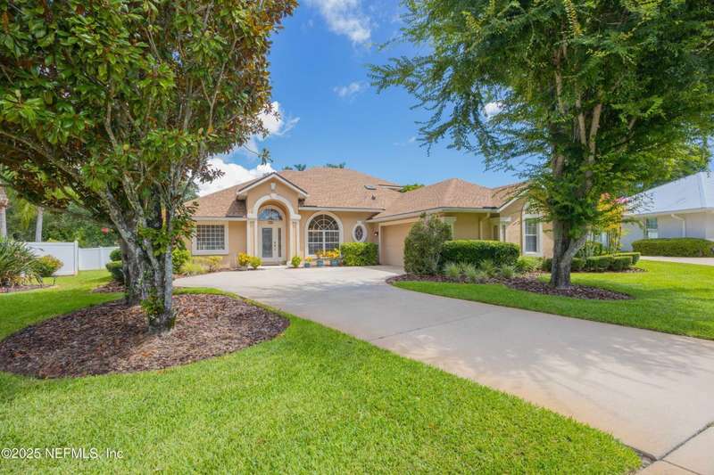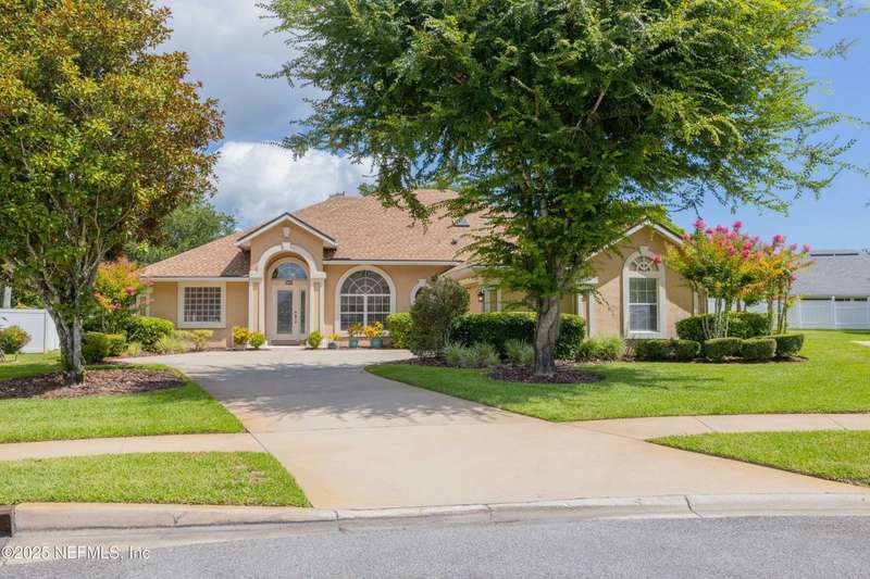 ELEGANT 4BR/3BA CONCRETE BLOCK HOME ON BEAUTIFULLY TREED CUL-DE-SAC. Possible in law or generational suite! New roof 2 years ago! Light, bright & beautifully maintained with rich wood floors, high ceilings with crown molding, formal dining room, huge kitchen with loads of cabinets, lots of counter space, an island & 8x10 eating space that leads to 20 ft long screened lanai overlooking huge, fully fenced back yard with double gate. Kitchen overlooks large living room with fireplace & lots of windows. Split bedroom plan, 24 ft long owner suite with 2 walk in closets, double tray ceiling with crown molding, plus owner bath with 2 vanities, walk in shower, garden tub & water closet. Split BR plan has other 2 bedrooms on other side of home, plus a huge ensuite BR/BA bonus room with 4x5 air conditioned closet. 7x9 Utility room leads to 2 car side entry garage. AWESOME LOCATION! 7 miles to the beach, 1.3 miles to shopping & 7/10 mi to school!