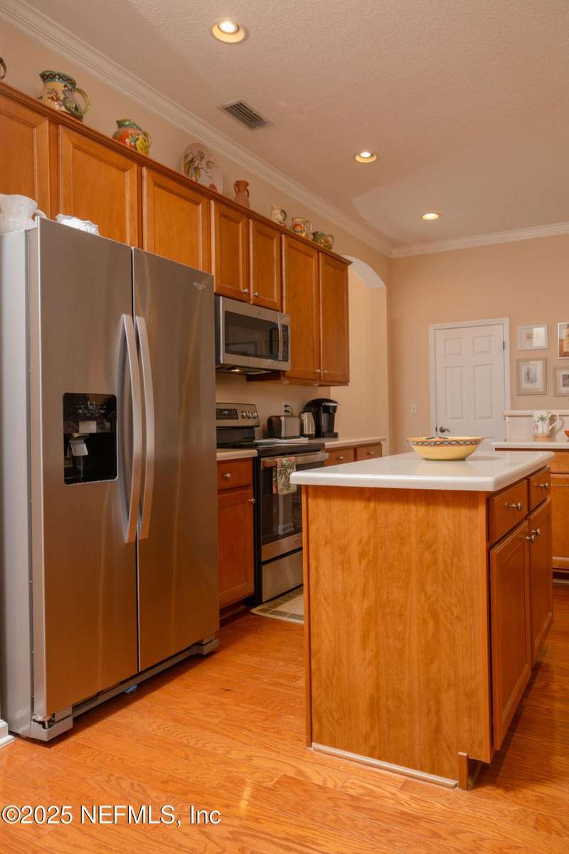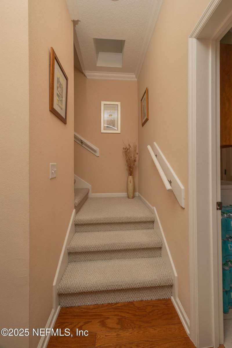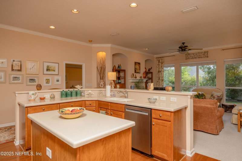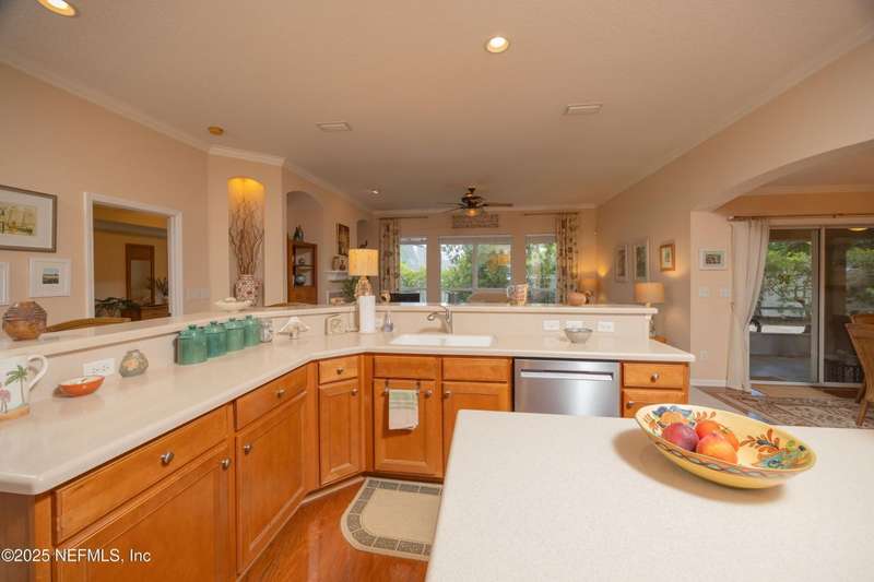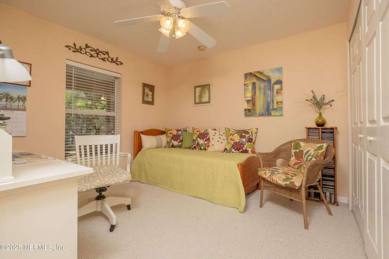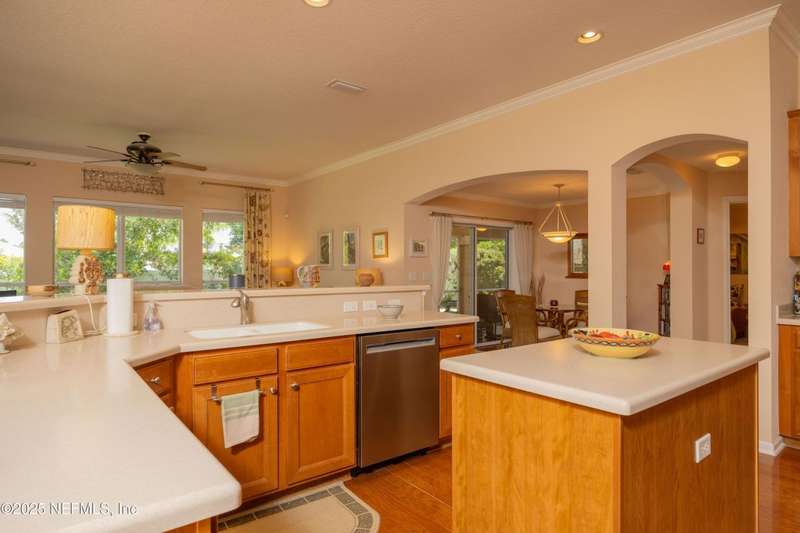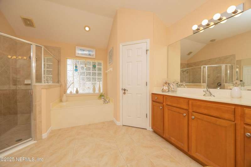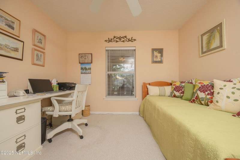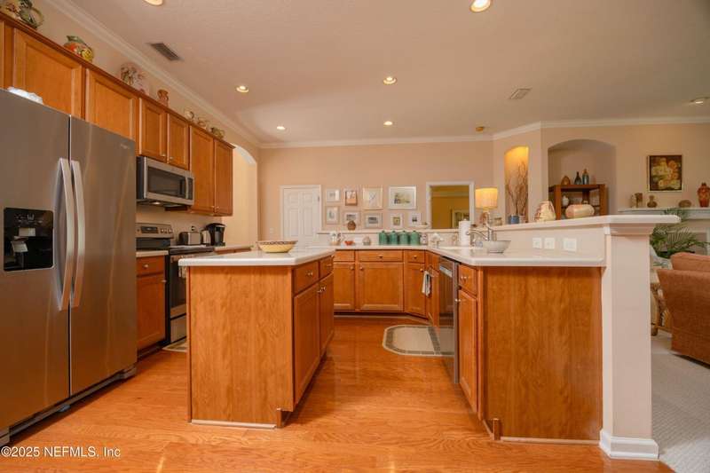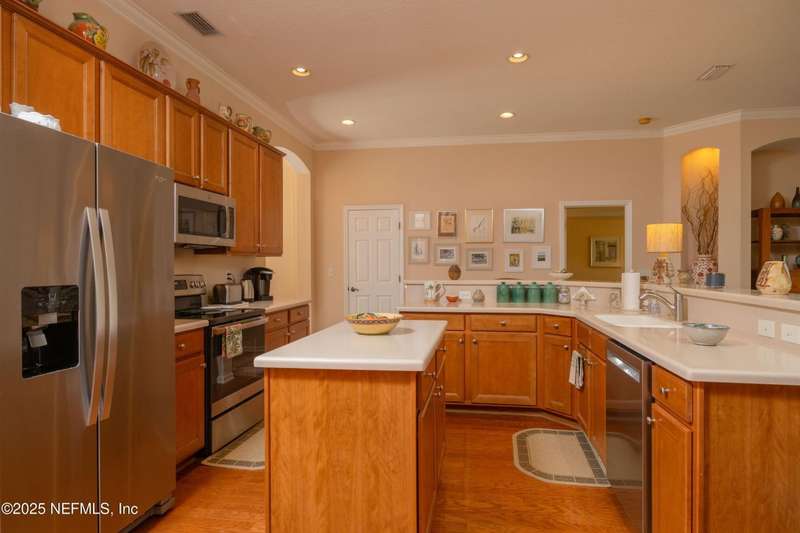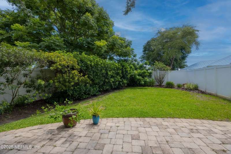 ELEGANT 4BR/3BA CONCRETE BLOCK HOME ON BEAUTIFULLY TREED CUL-DE-SAC. Possible in law or generational suite! New roof 2 years ago! Light, bright & beautifully maintained with rich wood floors, high ceilings with crown molding, formal dining room, huge kitchen with loads of cabinets, lots of counter space, an island & 8x10 eating space that leads to 20 ft long screened lanai overlooking huge, fully fenced back yard with double gate. Kitchen overlooks large living room with fireplace & lots of windows. Split bedroom plan, 24 ft long owner suite with 2 walk in closets, double tray ceiling with crown molding, plus owner bath with 2 vanities, walk in shower, garden tub & water closet. Split BR plan has other 2 bedrooms on other side of home, plus a huge ensuite BR/BA bonus room with 4x5 air conditioned closet. 7x9 Utility room leads to 2 car side entry garage. AWESOME LOCATION! 7 miles to the beach, 1.3 miles to shopping & 7/10 mi to school!