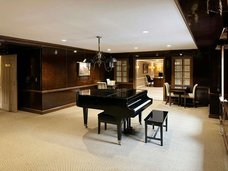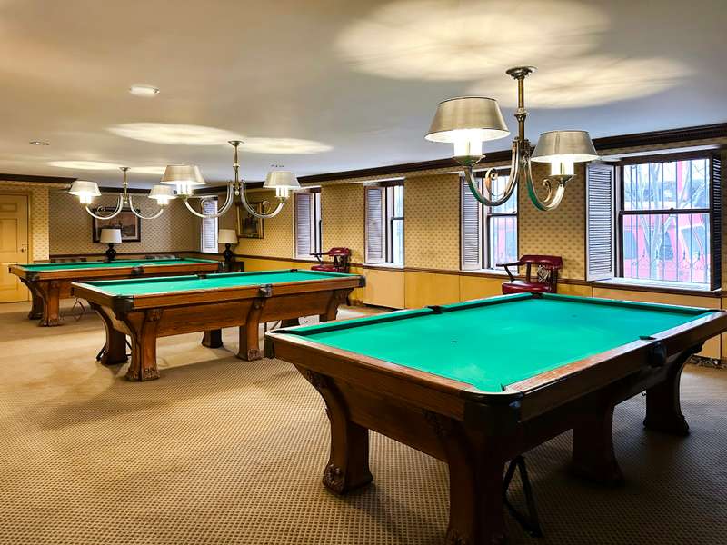 - Amenities include a Billiards Room, Music Room, Library, Card/Game Room, rentable banquet room, dining room, and kitchen for events