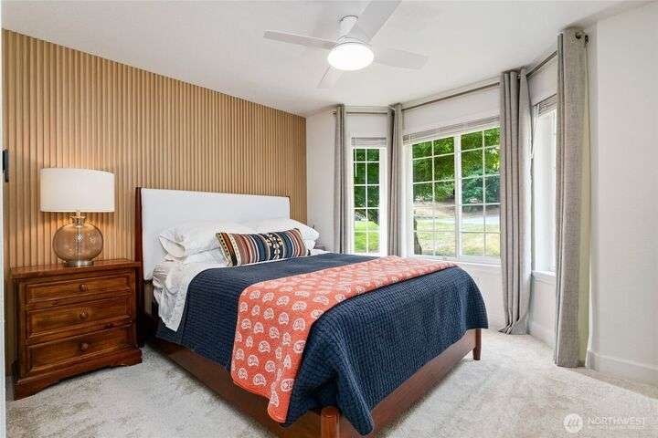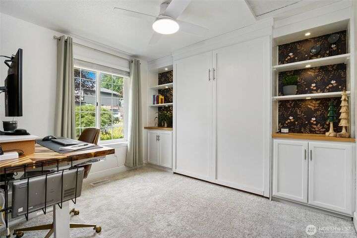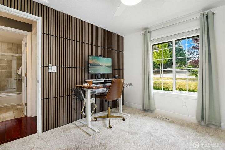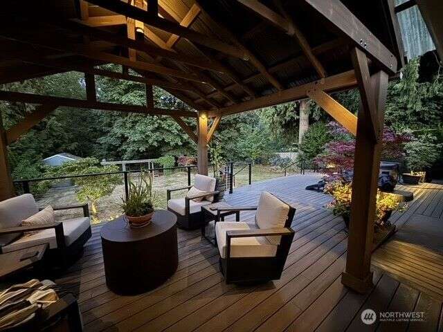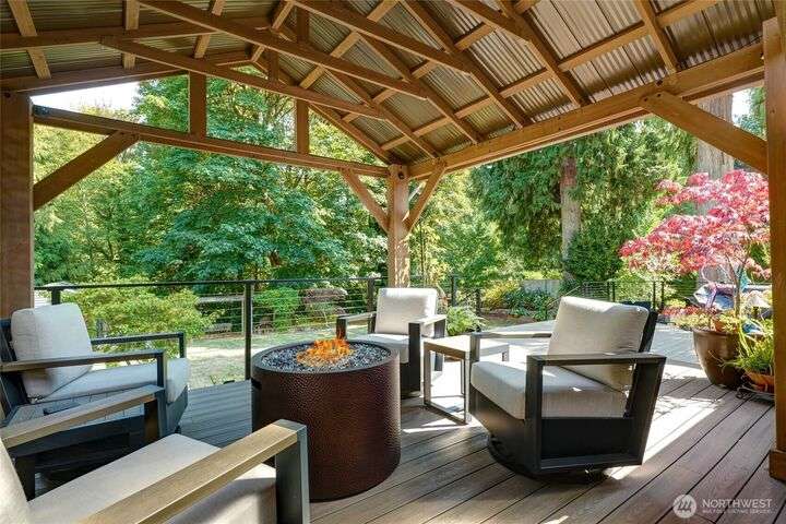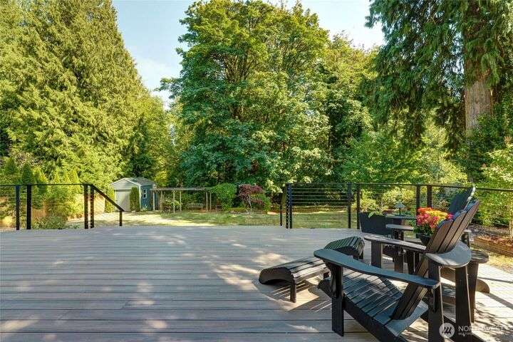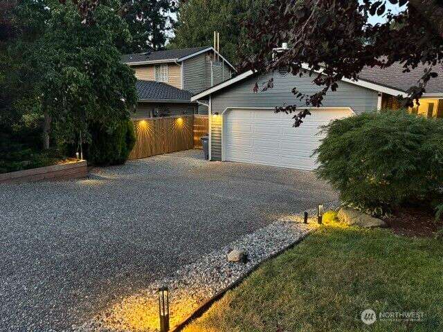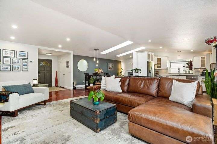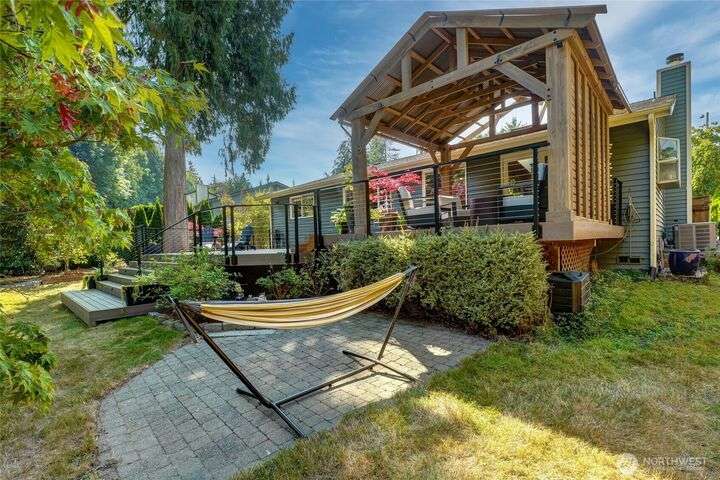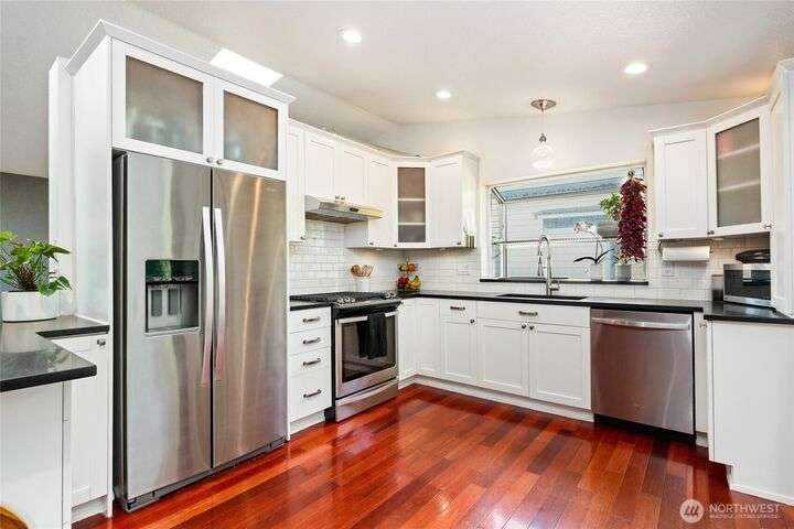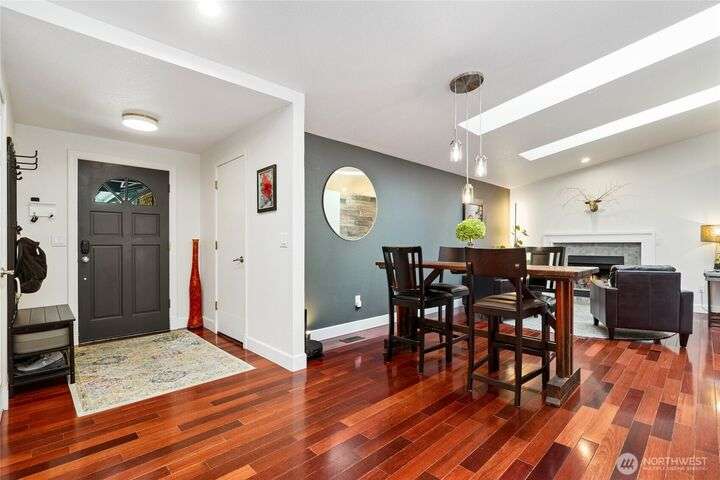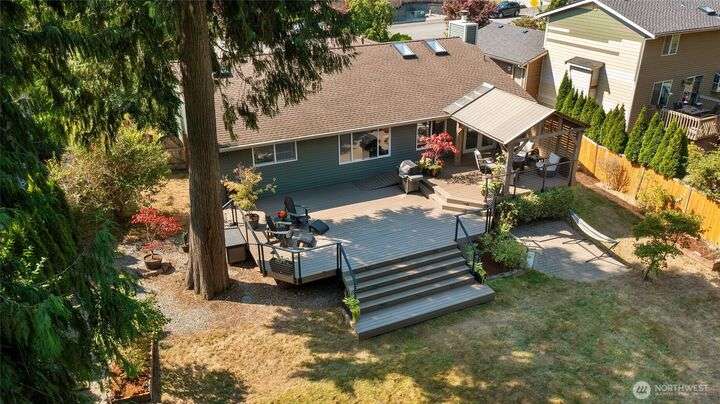Exceptionally updated rambler combining functionality, tasteful upgrades, and classic comfort! Located on a fully fenced/flat lot, backed against a private + untouchable greenbelt. Fresh interior + exterior paint. Open-concept living featuring vaulted ceilings, skylights + 2 fireplaces. The kitchen shines w/ quartz counters, painted cabinetry, new backsplash, lighting + ss appliances. Primary suite boasts dual closets + a reimagined bath w/ walk-in tile shower + dual-sink vanity. 2 additional bedrooms feature upgraded closet systems, one w/ a Murphy bed + built-ins. Entertain on the expansive TimberTech deck w/ lighting, gazebo + lush landscaping. Newer heat pump, furnace + water heater. Near parks, schools, highways, shopping + dining!