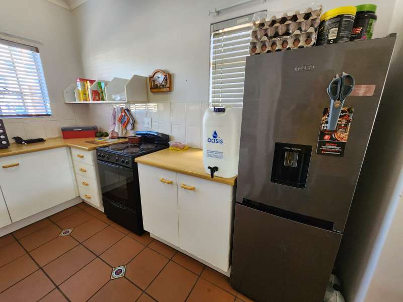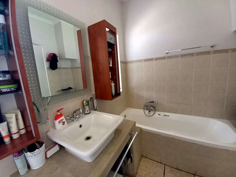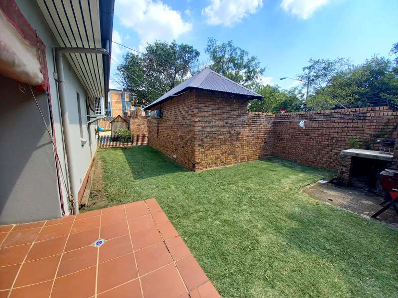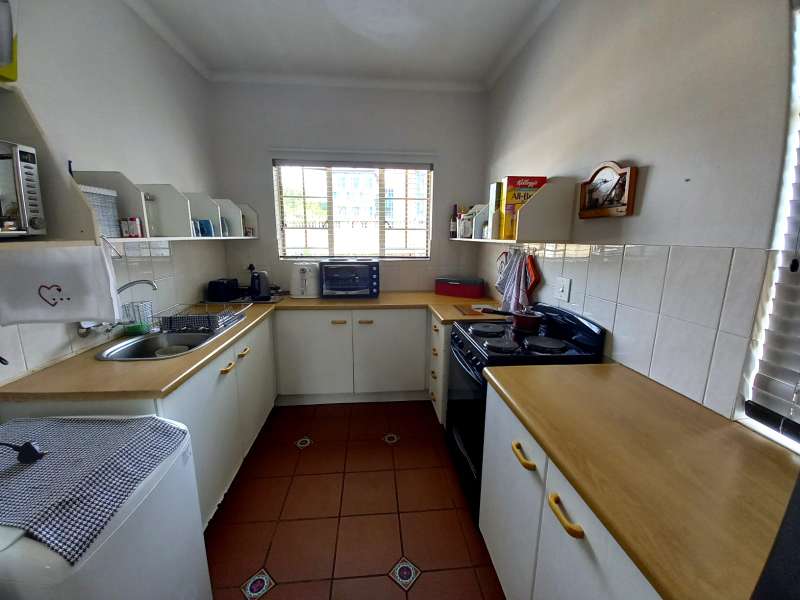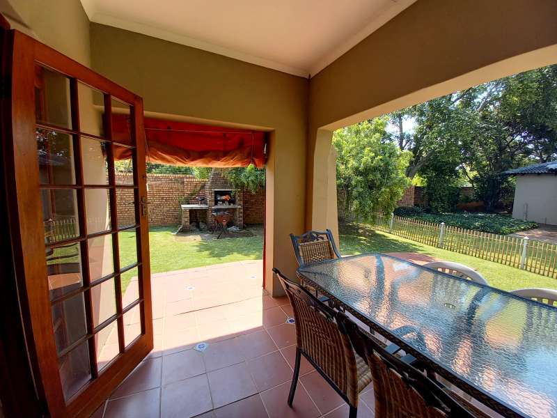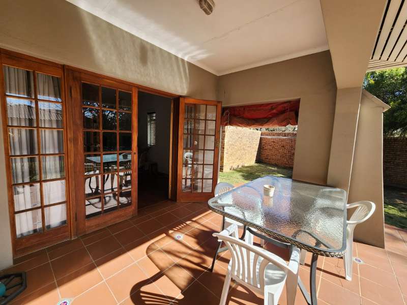 Introducing a stunning and spacious north-facing two-bedroom unit! This property features an inviting open-plan living area complemented by a tidy kitchen that flows seamlessly onto a covered patio overlooking a beautifully maintained garden, complete with an outdoor brick braai area. The kitchen boasts stylish tiled flooring, while the living area and hallway showcase elegant, well-preserved wooden, parquet floors. Both bedrooms are generously sized, featuring sleek, screed cement flooring, and all doors are solid and well-maintained. Convenience is key with a guest toilet conveniently located near the front entrance. Additionally, there is a separate shower room adjacent to the main bathroom, which includes a bath, basin, and toilet. Nestled in a quiet cul-de-sac, the complex offers a tranquil atmosphere, with security guards patrolling the area to ensure peace of mind for all residents.