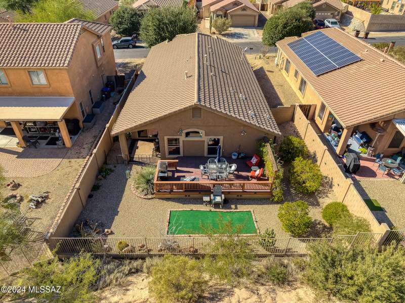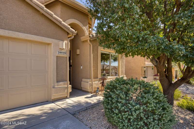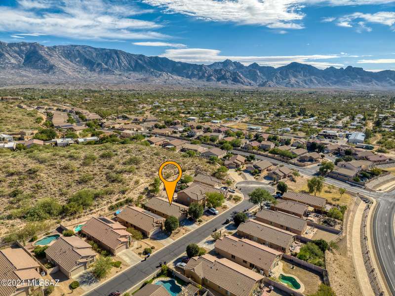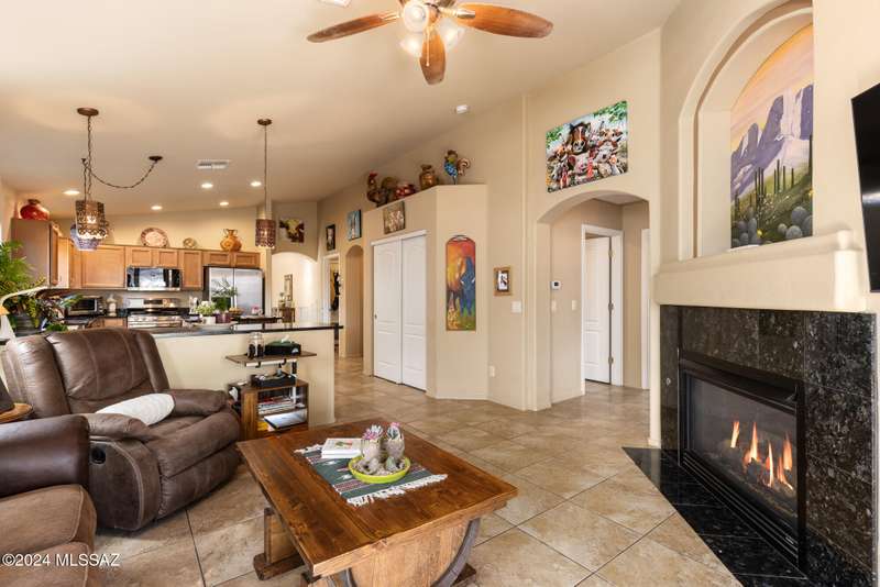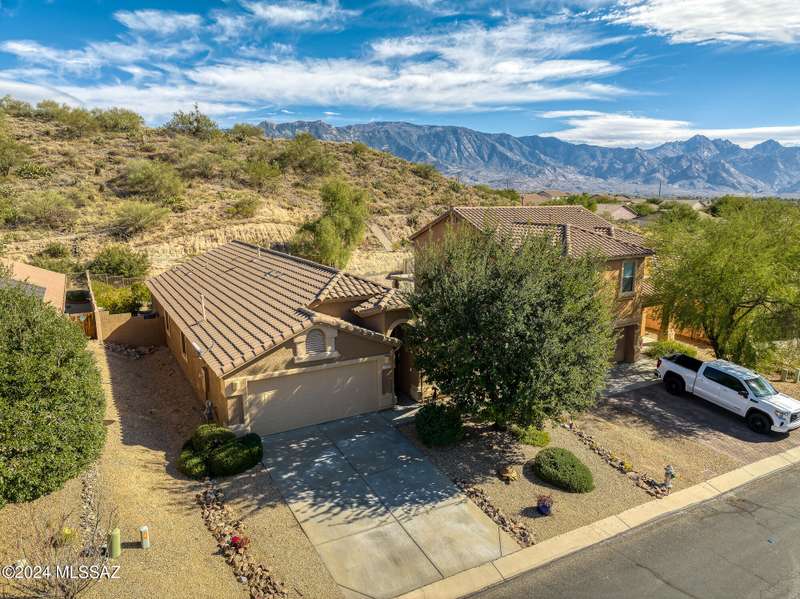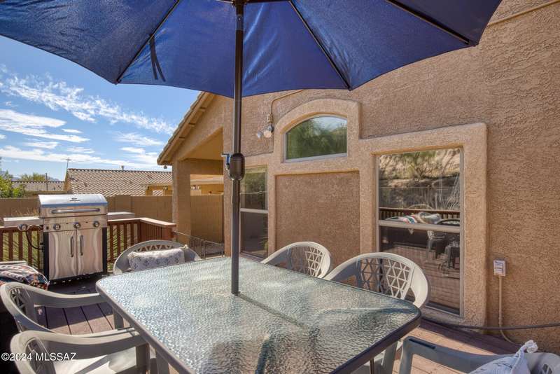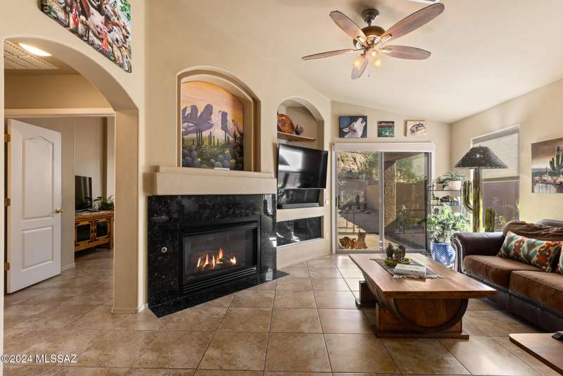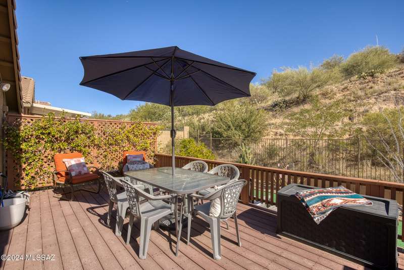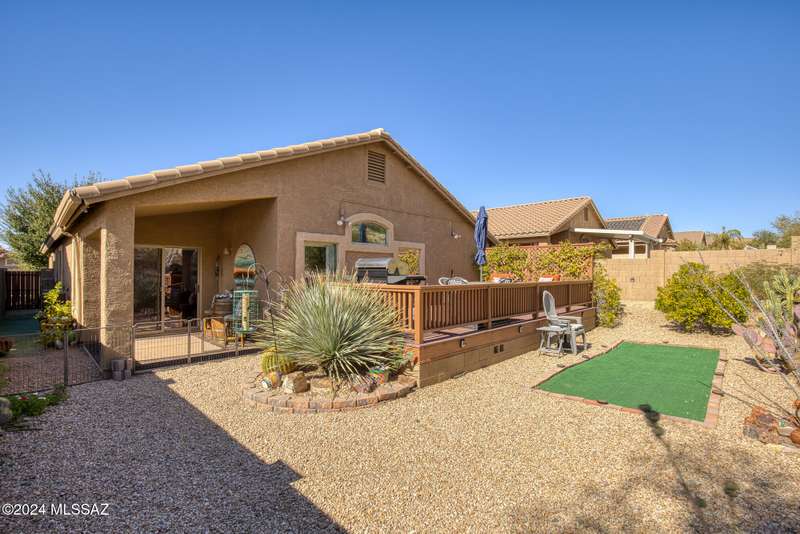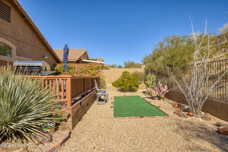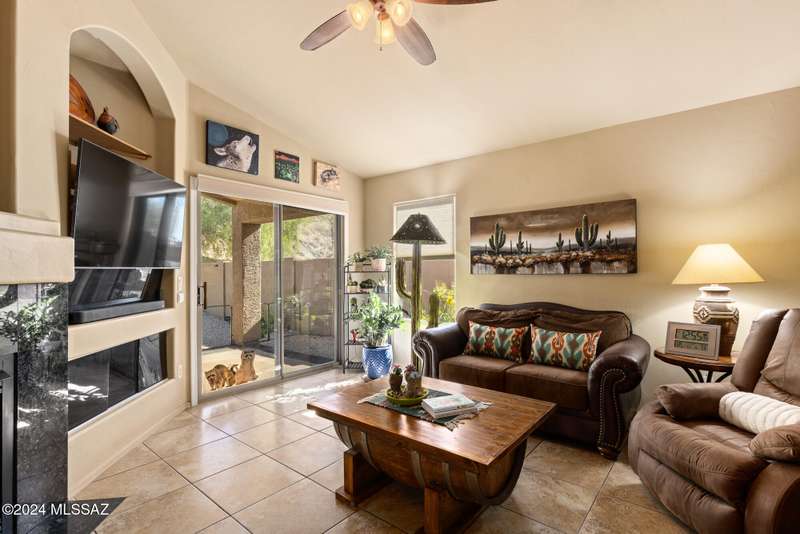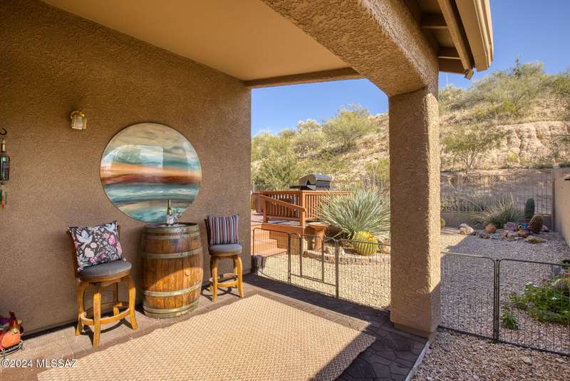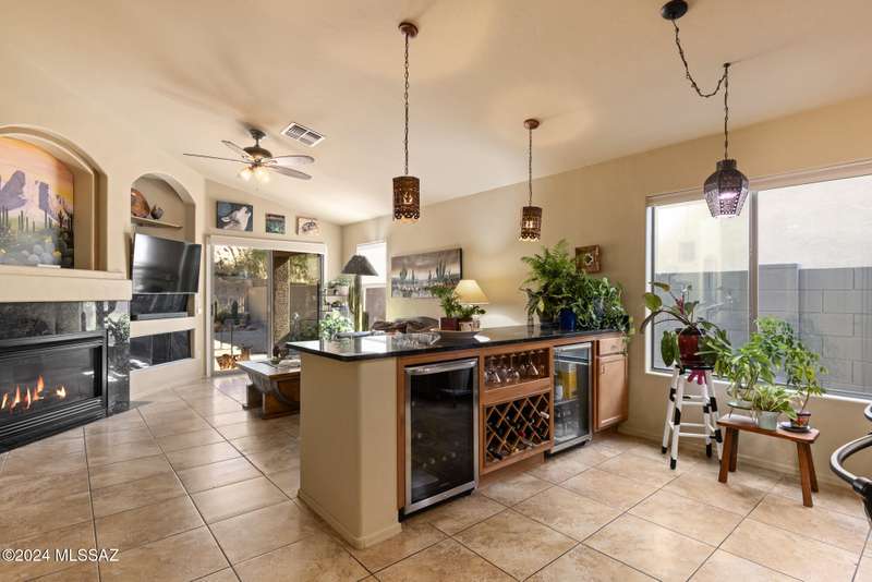 Totally charming upgraded Eagle Crest Ranch residence with 1,765 SF 3 BR/2 BA on cul-de-sac with private yard enjoying desert and Catalina Mountain views! Seamless open layout with high ceilings, all tile flooring, custom lighting, and cozy fireplace in greatroom. Elegant updated kitchen with granite counters, sitting bar, newer SS appls, and large dry bar with both wine and drinks refrigerators! Front room with den and dining areas, primary with both tub and shower, plus 2 spacious bedrooms sharing large hall bath. Laundry room with washer/dryer. Generous fenced yard backing to open desert includes covered patio, elevated sun deck, fruit trees and space for herb garden, turf area, play gear, small pool, or even bocce ball court! Most furnishings available. Gorgeous AND Move-in Ready!
