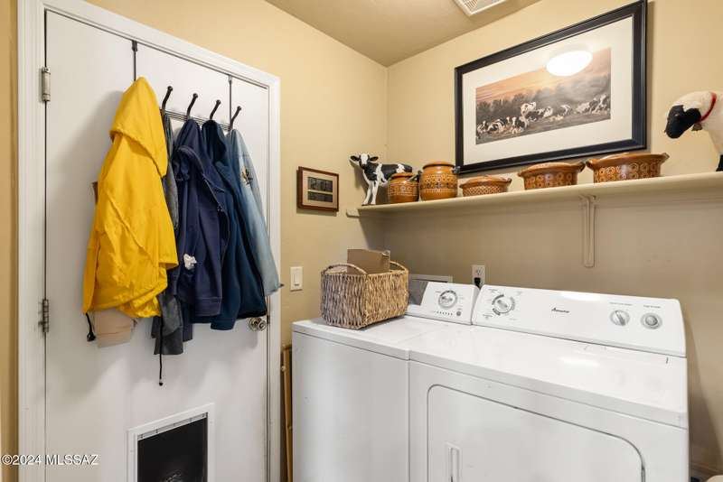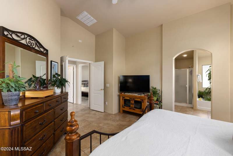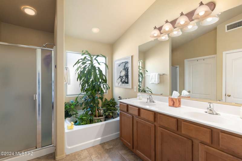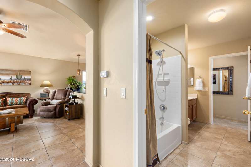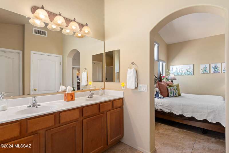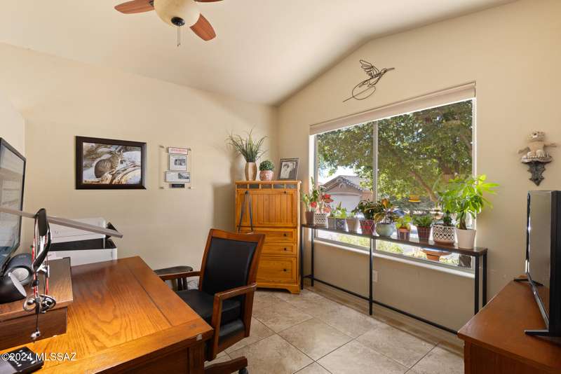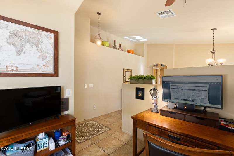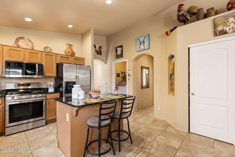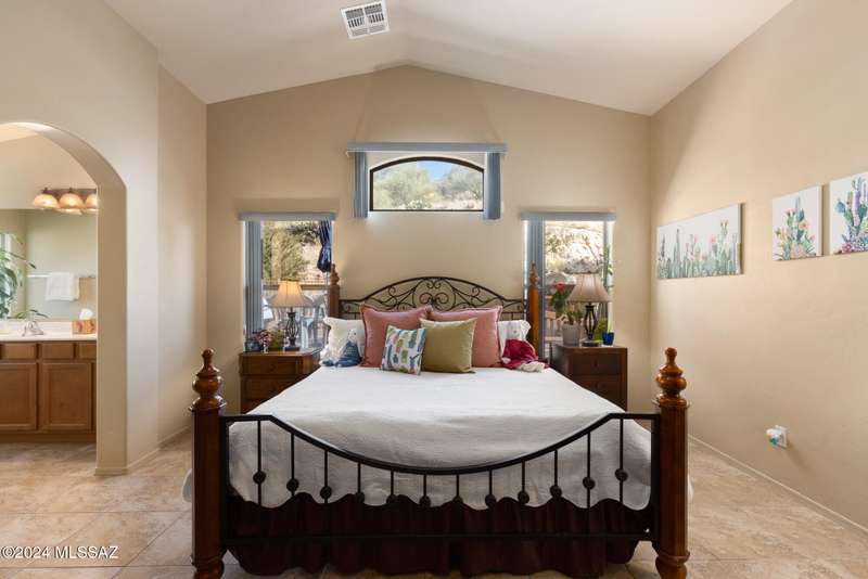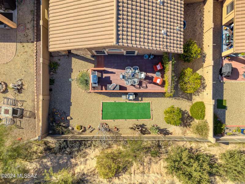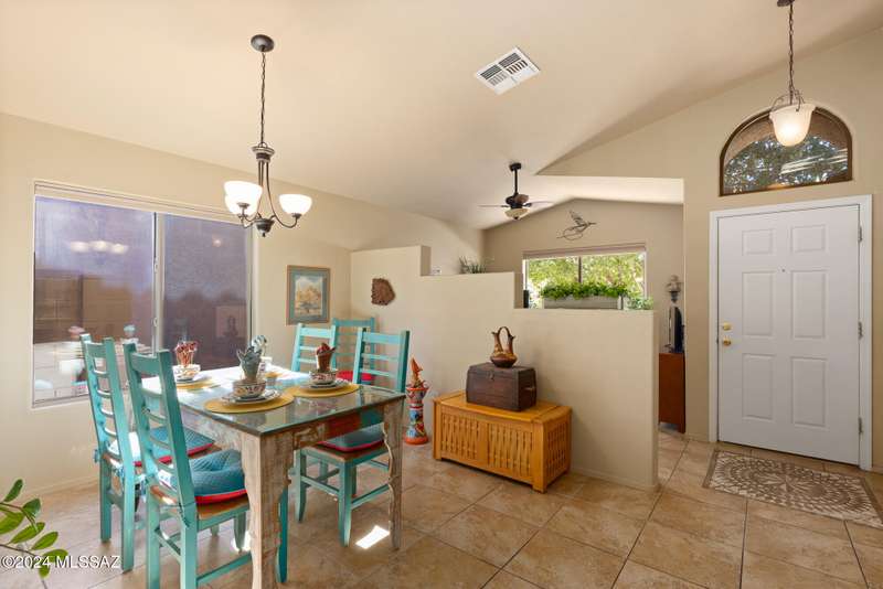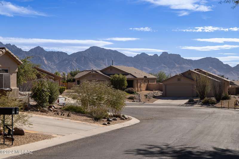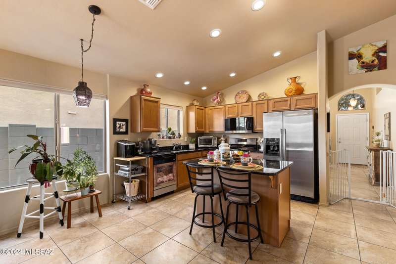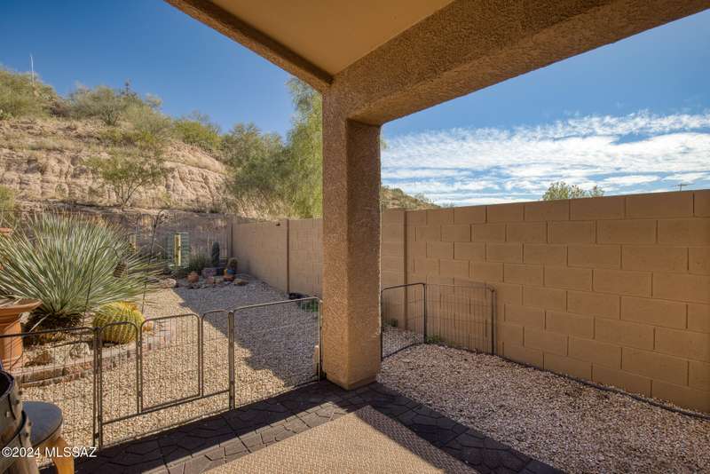 Totally charming upgraded Eagle Crest Ranch residence with 1,765 SF 3 BR/2 BA on cul-de-sac with private yard enjoying desert and Catalina Mountain views! Seamless open layout with high ceilings, all tile flooring, custom lighting, and cozy fireplace in greatroom. Elegant updated kitchen with granite counters, sitting bar, newer SS appls, and large dry bar with both wine and drinks refrigerators! Front room with den and dining areas, primary with both tub and shower, plus 2 spacious bedrooms sharing large hall bath. Laundry room with washer/dryer. Generous fenced yard backing to open desert includes covered patio, elevated sun deck, fruit trees and space for herb garden, turf area, play gear, small pool, or even bocce ball court! Most furnishings available. Gorgeous AND Move-in Ready!