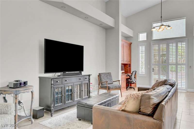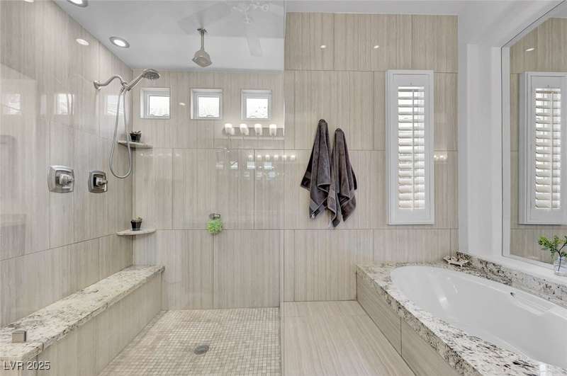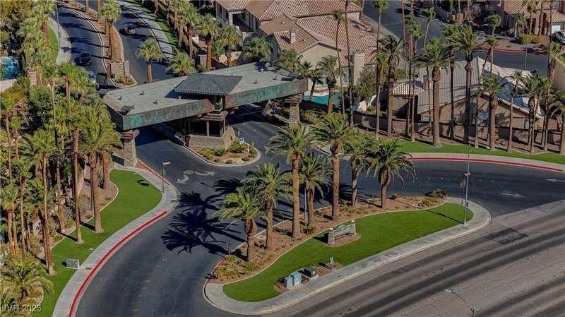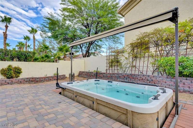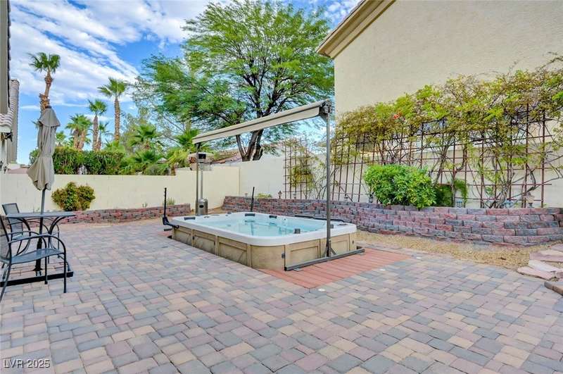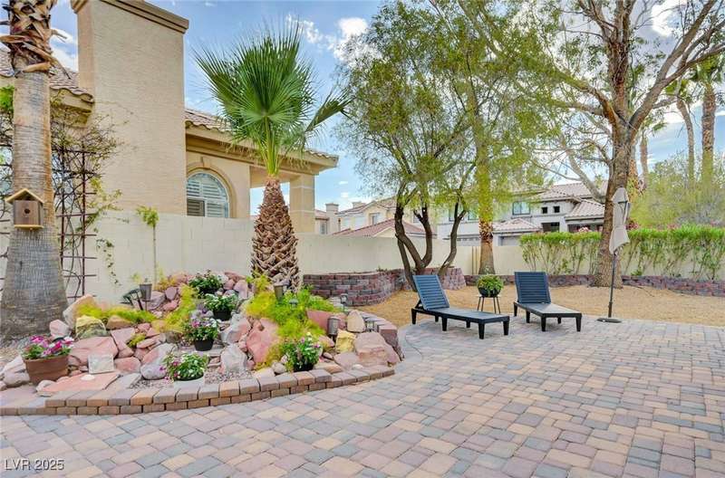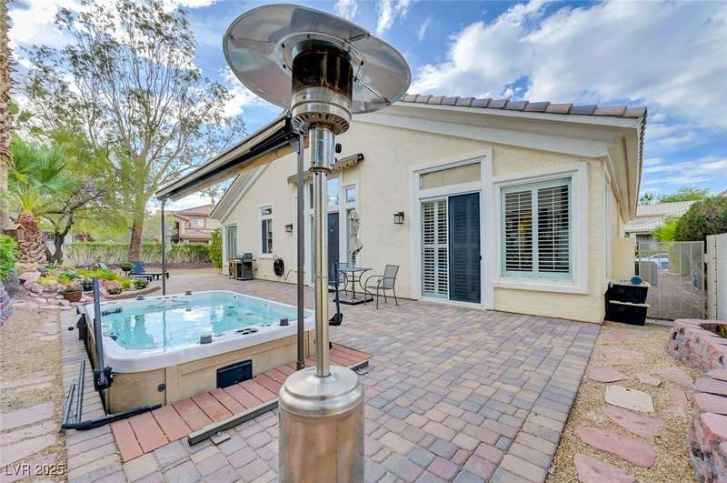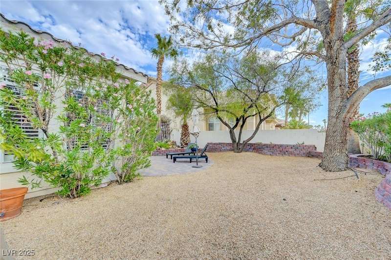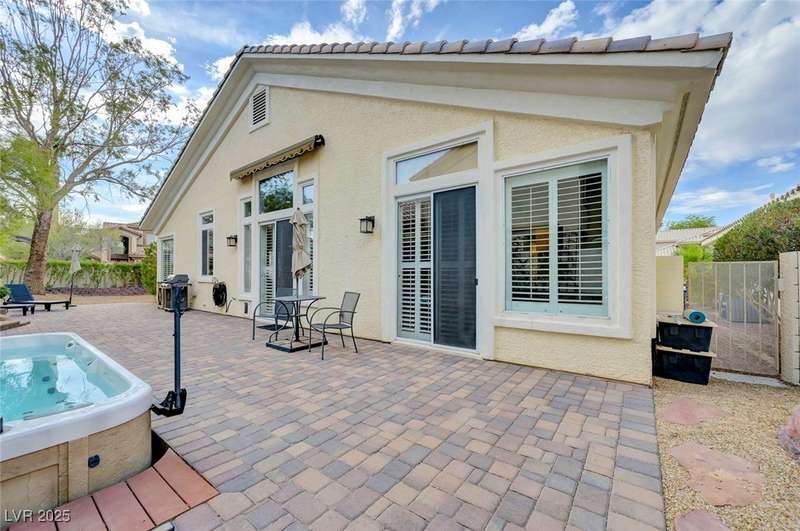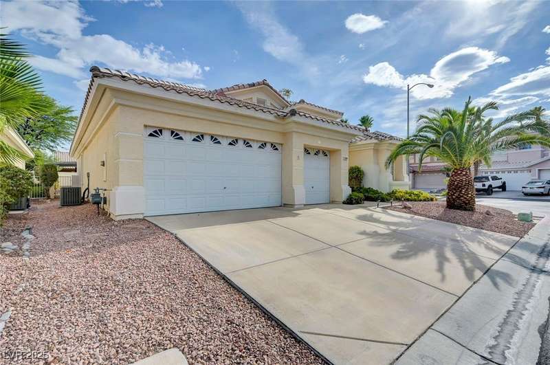 Welcome to the prestigious Guard-gated Granada Hills in the heart of Las Vegas! This single story 3 bedroom, 2 bathroom -12,000 Square foot CORNER LOT home offers a spacious living & family room with soaring ceilings, a cozy gas fireplace, and a formal dining room. Enjoy a remodeled primary suite with a stunning tub & shower, large walk-in closet, and backyard access. Kitchen boasts granite countertops, large island, stainless steel appliances & tile flooring throughout. Fresh interior paint, shutters, 8 foot doors, and a separate laundry with sink & cabinets. Oversized finished 3 car garage with epoxy floors, cabinets, overhead storage & full water treatment system. Major updates include new water heater (2021) & dual HVAC units (2022). Relax in the spacious backyard, paver stones & below-ground swim spa. Move-in ready and ideally located between Summerlin & Durango Station, just minutes from shopping, dining, outdoor activities & 15 minutes from the Las Vegas Strip! Must see today!
