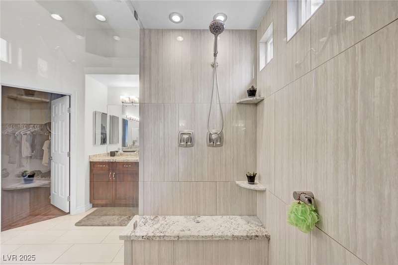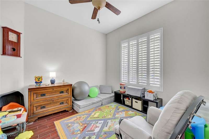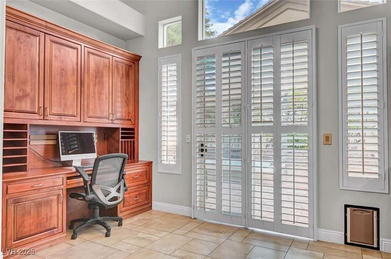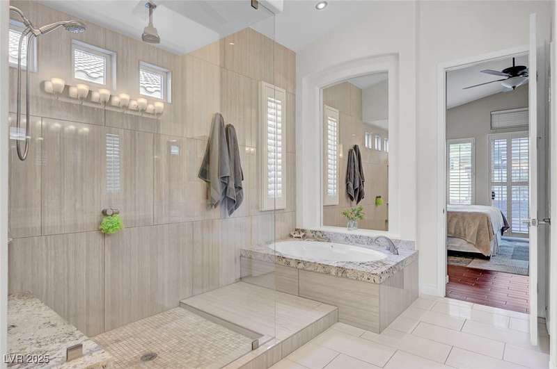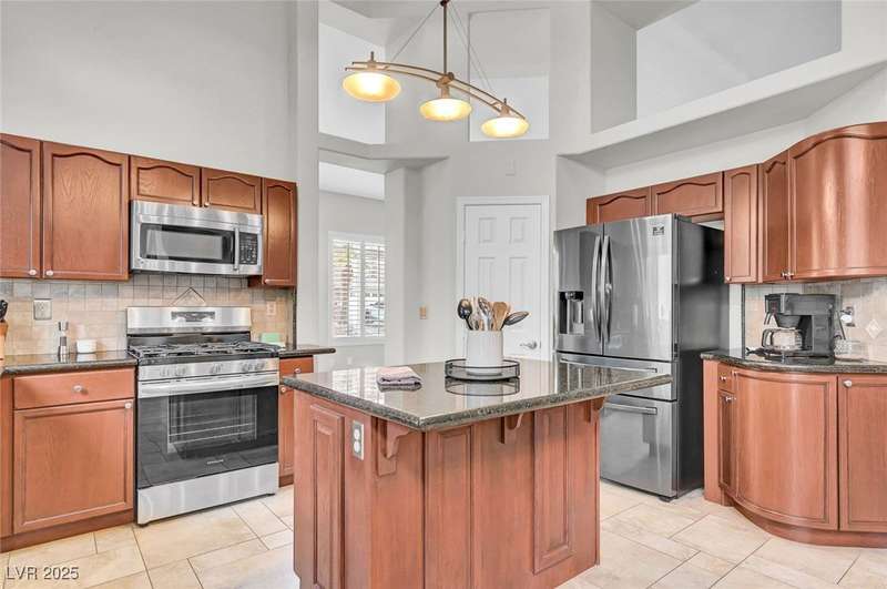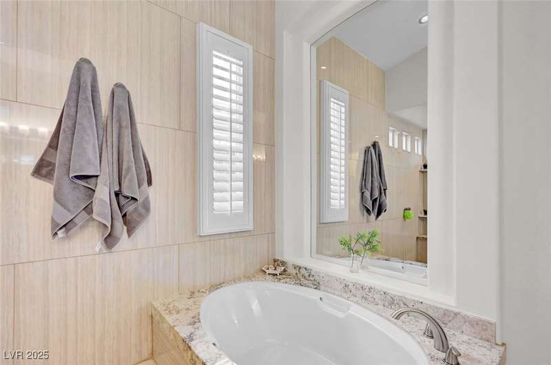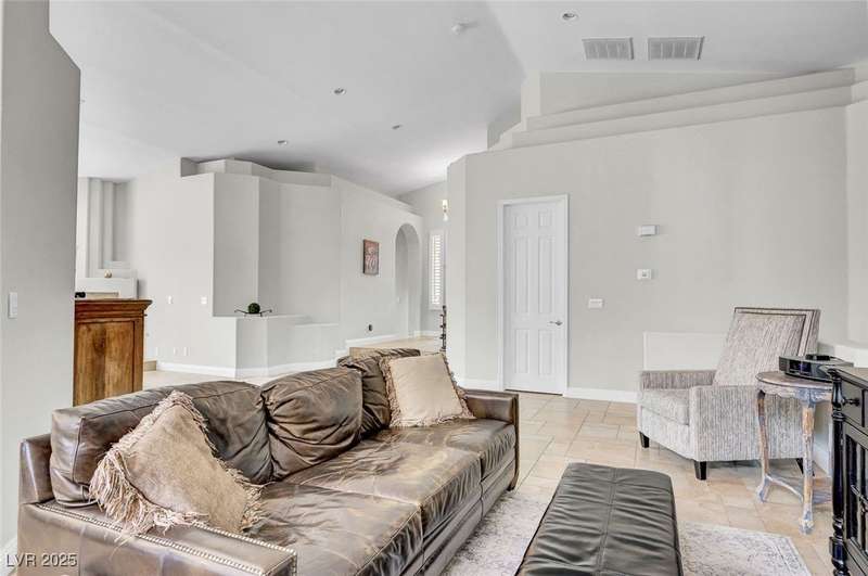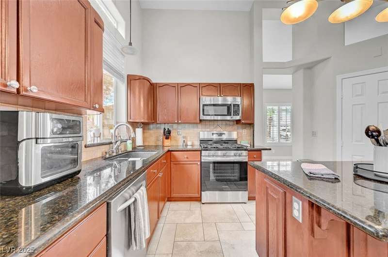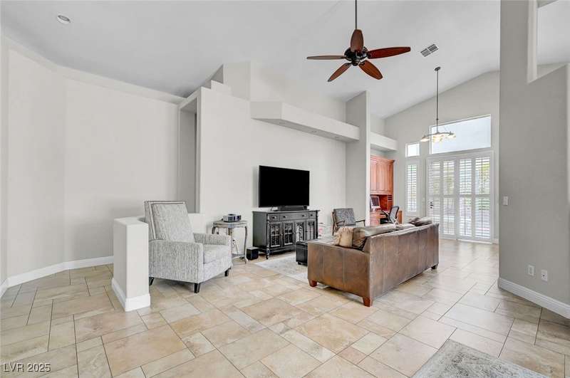 Welcome to the prestigious Guard-gated Granada Hills in the heart of Las Vegas! This single story 3 bedroom, 2 bathroom -12,000 Square foot CORNER LOT home offers a spacious living & family room with soaring ceilings, a cozy gas fireplace, and a formal dining room. Enjoy a remodeled primary suite with a stunning tub & shower, large walk-in closet, and backyard access. Kitchen boasts granite countertops, large island, stainless steel appliances & tile flooring throughout. Fresh interior paint, shutters, 8 foot doors, and a separate laundry with sink & cabinets. Oversized finished 3 car garage with epoxy floors, cabinets, overhead storage & full water treatment system. Major updates include new water heater (2021) & dual HVAC units (2022). Relax in the spacious backyard, paver stones & below-ground swim spa. Move-in ready and ideally located between Summerlin & Durango Station, just minutes from shopping, dining, outdoor activities & 15 minutes from the Las Vegas Strip! Must see today!