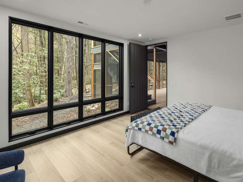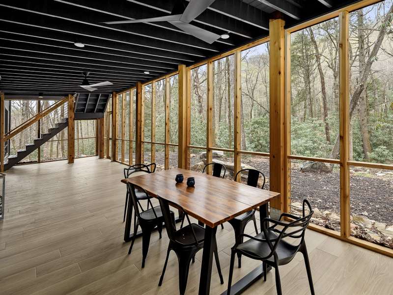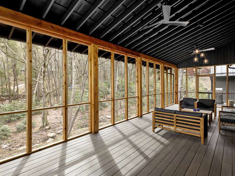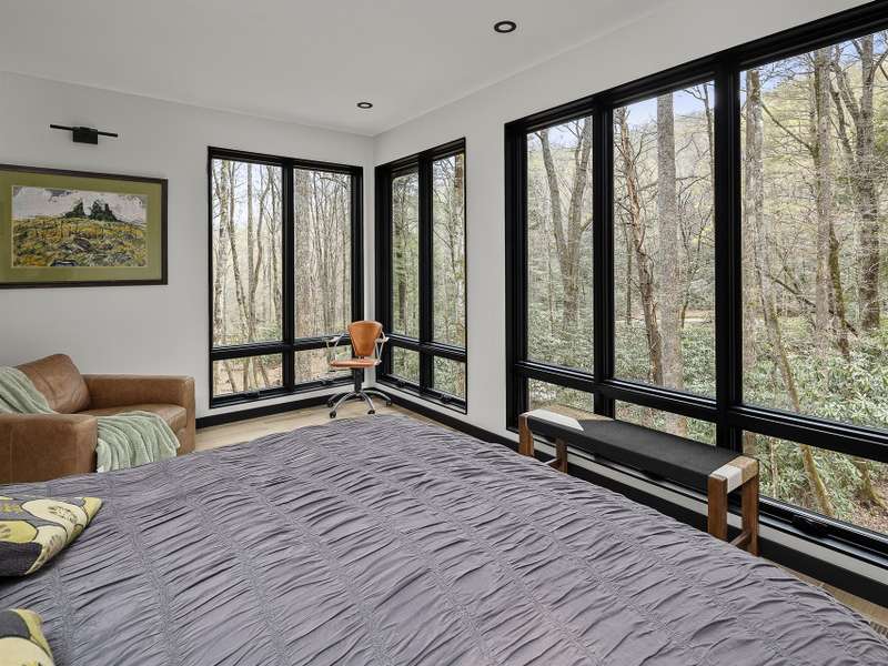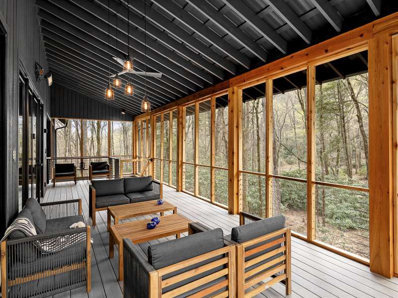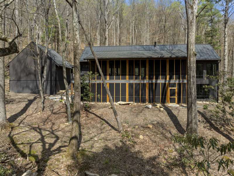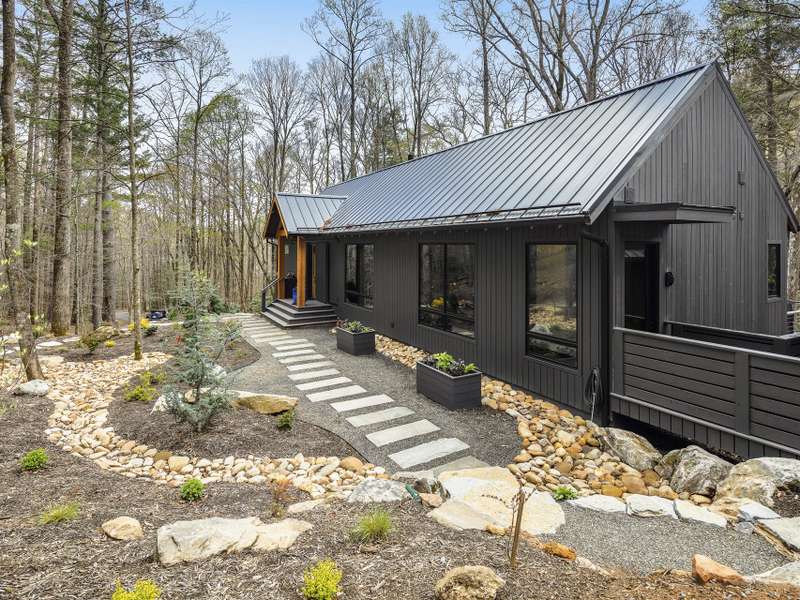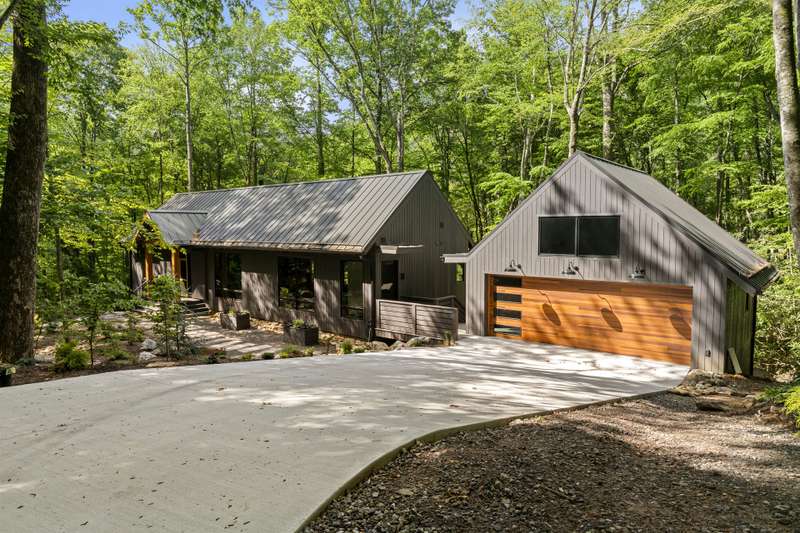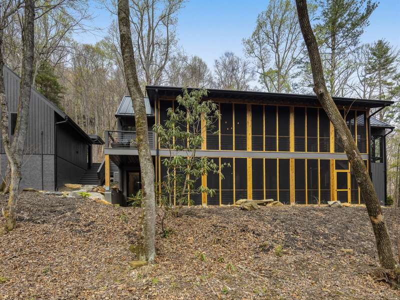 **Seller Financing Available** Nestled within the gated Laurel Ridge community, this sleek contemporary custom home offers a unique blend of luxury and privacy, just 12 minutes from downtown Black Mountain. Professionally landscaped grounds blend seamlessly with the natural surroundings. Inside, the great room welcomes you with a soaring vaulted ceiling adorned with solid wood beams, floor-to-ceiling ceramic tile accents, and expansive windows. The chef's kitchen features Dekton countertops, custom cabinetry and sleek black appliances. Outside, two fully screened patios beckon for alfresco dining or leisurely afternoons, accompanied by the gentle sounds of a nearby creek. The main-level primary suite boasts a spa-like bath and spacious walk-in closet. Descending to the terrace level, discover a separate guest suite and full apartment with a guest room and office space. Additional features include a two-car garage wired for an EV charger. Experience the pinnacle of luxury mountain living at this remarkable property.