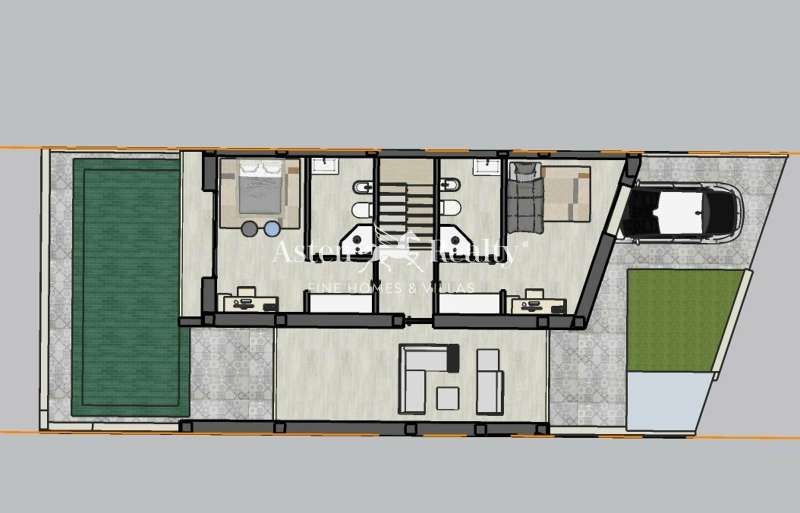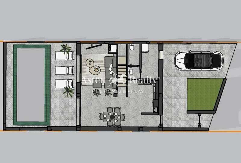 On the ground floor, we find the property’s parking space, the garden, and a 7×3 meter emerald-hued pool. The ground-floor interiors feature warm wood colors in the open-plan living room and kitchen, as well as a guest toilet and laundry room.
