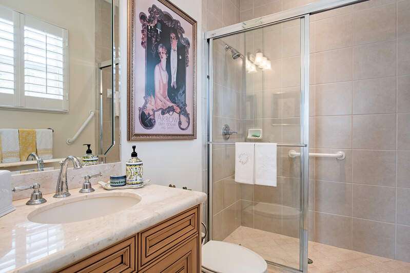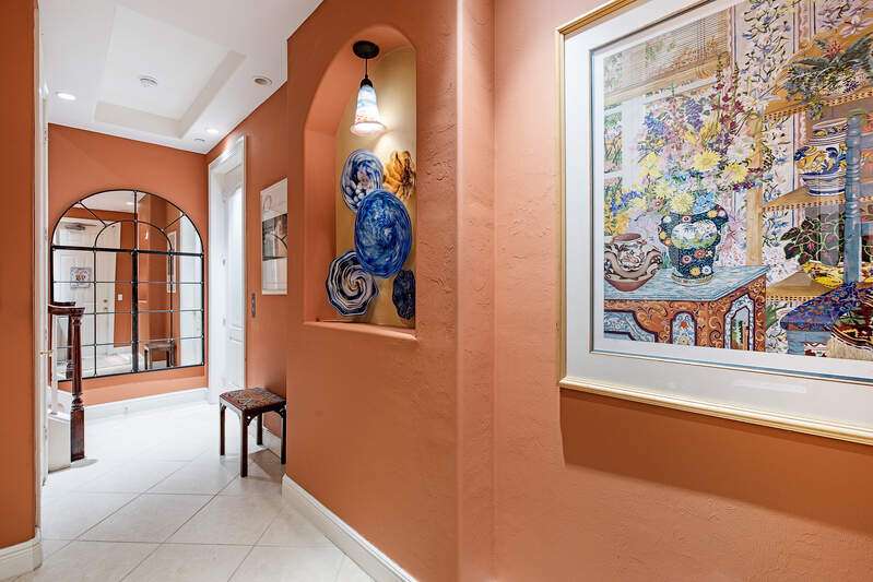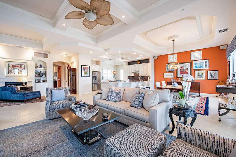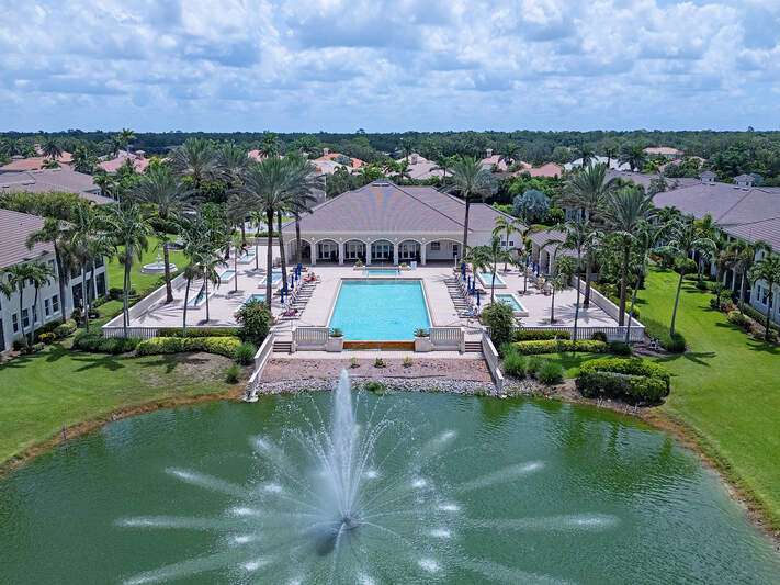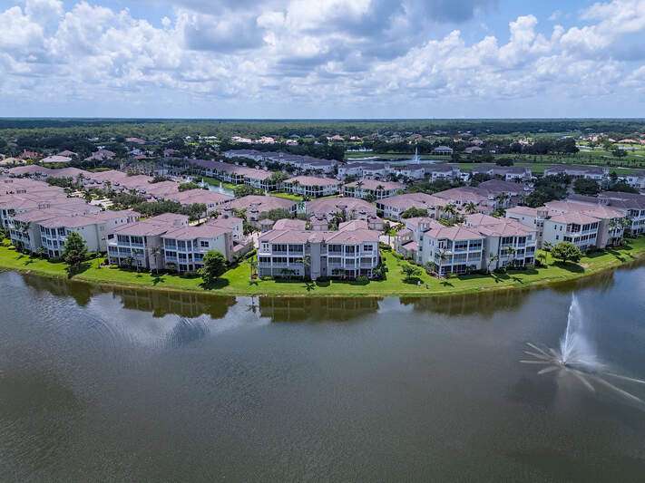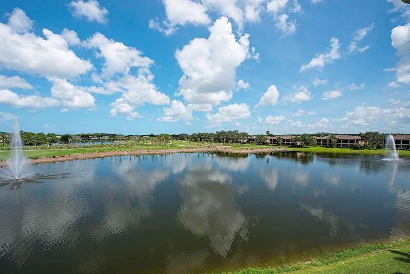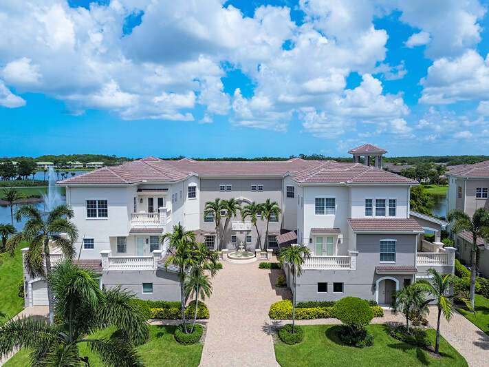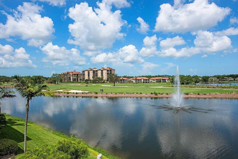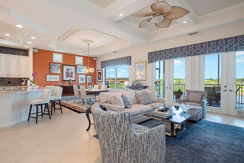 Only available golf view in Avellino NOW AT IMPROVED PRICE! Enjoy some of Avellino's BEST views from this rarely available 3+den 3.5 BA penthouse with private elevator and higher coffered ceilings, affording panoramic golf, lake and sunset views! This contemporary showplace offers a stylish open kitchen renovated by the current owners, boasting new countertops (countertops all one level!), two-tone cabinetry with pull-outs, induction cooktop, added built-in pantry with pull-outs, new wine cooler (9-25), Instahot kitchen water, and BREATHTAKING views! Remote control storm shutters surround the lanai for your convenience, and all windows are impact glass for peace of mind and convenience, plus you'll enjoy remote control shades and plantation shutters inside. Views from the oversized tiled lanai are mesmerizing, drawing the eye to the golf course and lakes! You'll love the cozy see-through electric fireplace between the great room and den/office with wood floor. Each bedroom has an en suite bath, and the primary bedroom with French doors to the lanai is nicely separated, featuring a welcoming spa-like bath with separate jetted tub and walk-in shower, and a HUGE walk-in closet with elegant custom built-ins. One AC system was installed in 2017 and the other in 2022; water heater was installed in 2022. Crown molding draws the eye to the high ceilings with decorative detail, only afforded in the penthouse and adding to the spacious feel! Condo has never been rented and exudes pride of ownership! Note the extra air-conditioned storage closet off the ground floor foyer. Avellino Isles sports new roofs, new gutters/downspouts, and new exterior painting and lighting, all completed in 2024. This showplace is a very short walk to the recently-renovated Avellino Isles clubhouse with Jr. Olympic pool/spa, large fitness center, BBQ grills and tiki hut, and numerous activities designed to help you meet neighbors! See Conf. Info. for buyer occupancy info.