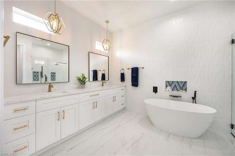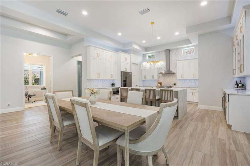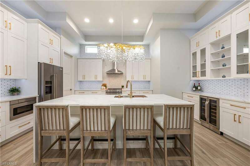 Live the Florida lifestyle to the fullest in this beautifully designed lakefront home in Royal Palm Golf Estates! This 3,142 sqft residence offers 3 spacious bedrooms + office, 3 full bathrooms, 1 half bathroom, and a light-filled open floor plan perfect for both relaxing and entertaining. Enjoy soaring tray ceilings, upgraded tile flooring, and expansive water views from nearly every room. The gourmet kitchen features an oversized island, cabinet lighting, walk-in pantry, and dual-zone wine fridge-ideal for hosting family and friends. Each bedroom includes a private en-suite bath and custom walk-in closet, while the luxurious primary suite offers his & hers closets and a spa-inspired bathroom retreat. Step outside to your oversized screened lanai with a built-in outdoor kitchen, grill, and multiple seating areas overlooking the tranquil lake. Additional highlights include electric blinds, French doors, custom cabinetry, and a spacious laundry room with extra storage. Located in a gated golf course community with low HOA fees, underground utilities, and access to Eagle Lakes Golf Club. Just minutes from Marco Island and downtown Naples, this home offers the perfect blend of comfort, elegance, and convenience
