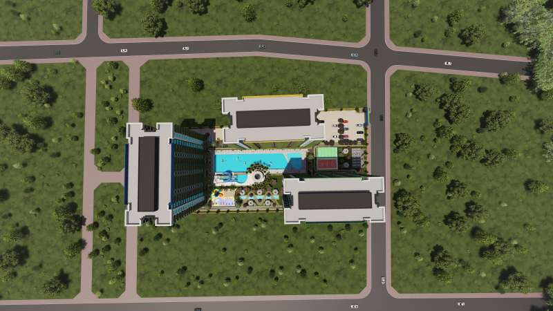 The flats are situated within a 3-block residential complex. The complex is enriched with a swimming pool, an aquapark, a basketball court, a football ground, a fitness center, a sauna, a playground, gazebos, BBQs, outdoor parking, lifts, generators, 24/7 security service, and security cameras.