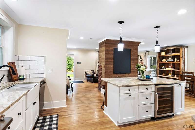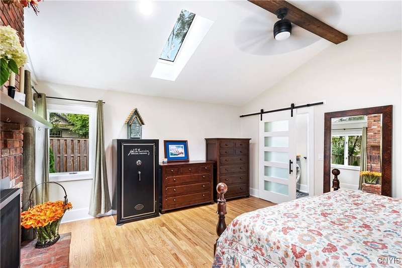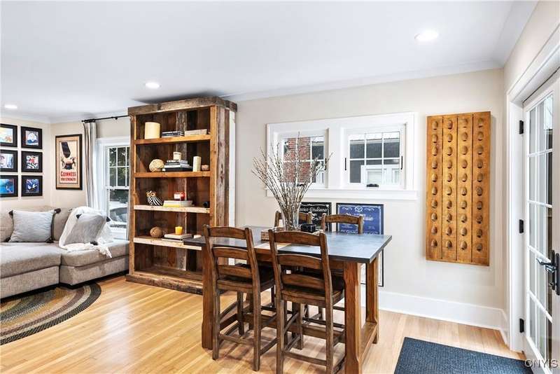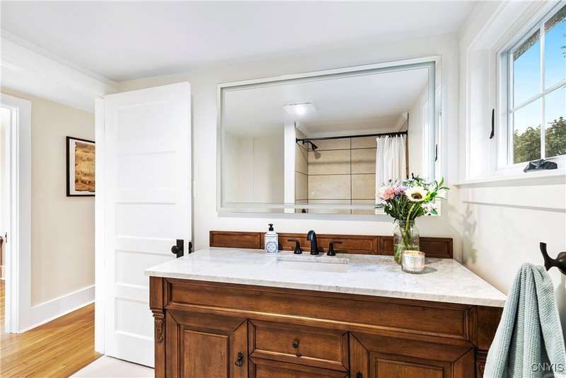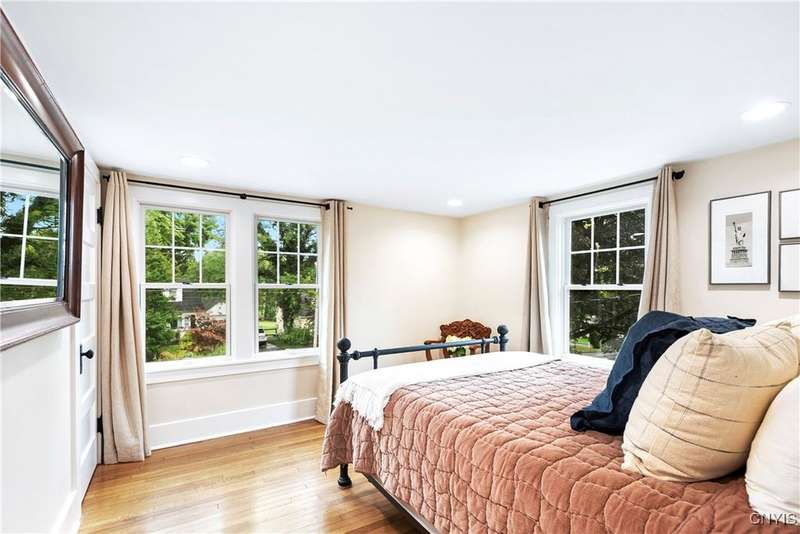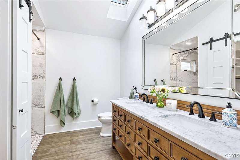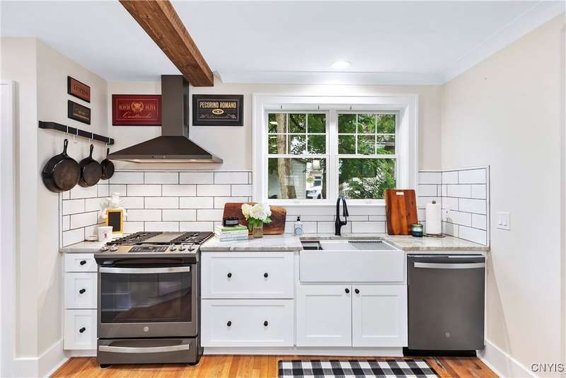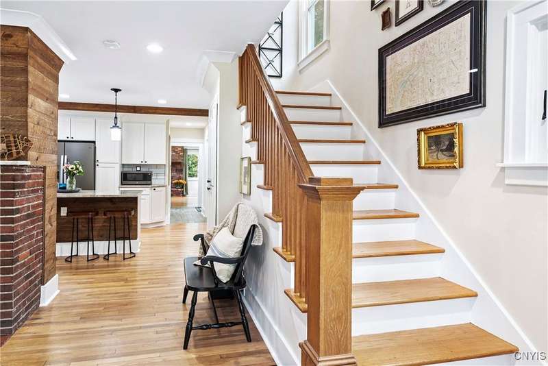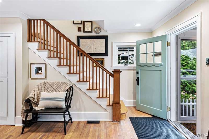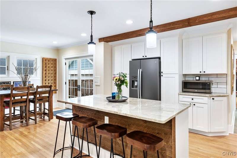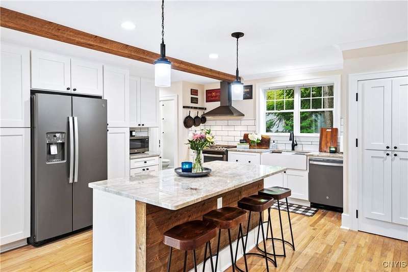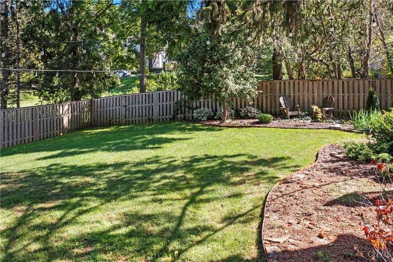 A beautifully renovated colonial home located in the heart of the village awaits you. This charming abode boasts hardwood floors throughout, adding to its character and allure. The first floor features a primary suite with a walk-in closet, a new bath with heated floors, a double vanity, and an oversized tiled shower. The kitchen is equipped with a large island, stainless steel appliances, and custom soft-close cabinets. The open floor plan includes a family room with a gas fireplace and an eat-in area with French doors leading to a brick patio. Upstairs, there are three bedrooms and an updated bath, while the third level offers a full attic perfect for storage. The fenced-in backyard is beautifully landscaped with mature trees and plants. Within walking distance to the village and schools, this home is the epitome of convenience and style.