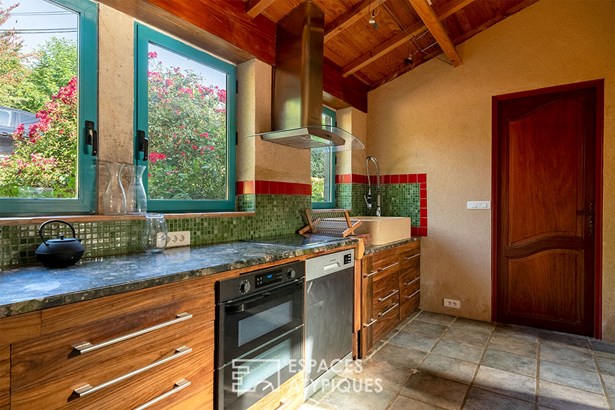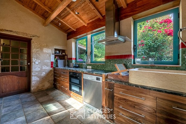 The open kitchen encourages conviviality, while the space dedicated to meals adorned with its wood-burning fireplace, invites you to relax and prepare all your favorite dishes.