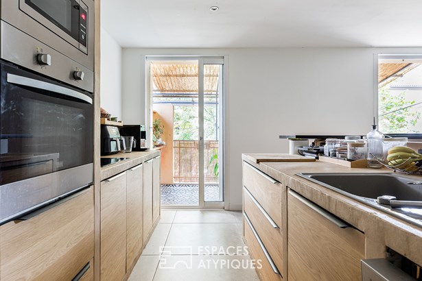 The second level houses the main living area, bathed in light thanks to large openings. An open kitchen with an industrial feel, combining wood and metal, is arranged around a welcoming island. The whole apartment impresses with its meticulous finishes, quality materials, and a fluid layout that promotes the circulation of light. Outside, an 8m2 terrace extends the living space, ideal for enjoying the beautiful days.