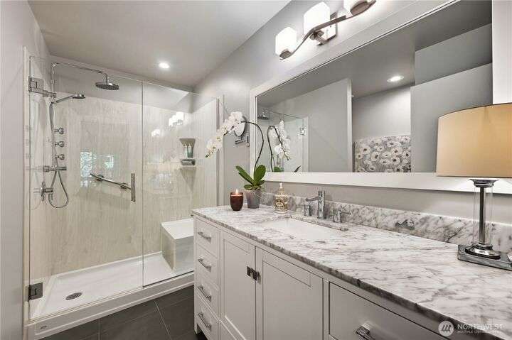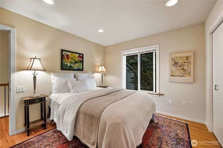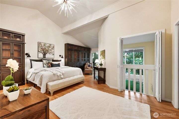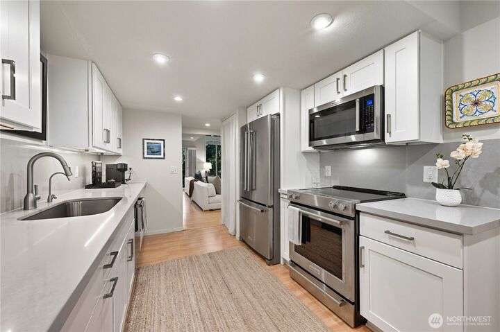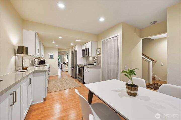 Come home to quiet luxury in this stunningly-remodeled end unit in Chambery Park! Not a single detail has been missed in this elegant home. Sleek kitchen with Kitchen-Aid appliances, ample storage, filtered water on tap, quartz countertops. Great room w/ dining area, wood-burning fireplace, vaulted ceilings & huge newer dbl paned windows & slider. Upstairs find a lg stylish primary suite w/stunning ensuite bath w/heated floors. Second bed down the hall, remodeled full bath in between, & a perfect office space just outside for WFH. Lt Rail 1/2 mi! Manicured grounds w/ mature landscaping, walking paths, outdoor pool, clubhouse, Pball/tennis/Bball court, fitness room w/hot tub, gated entry & 2 parking spots all make this your perfect new home.