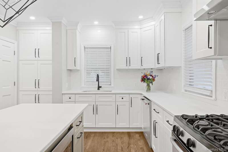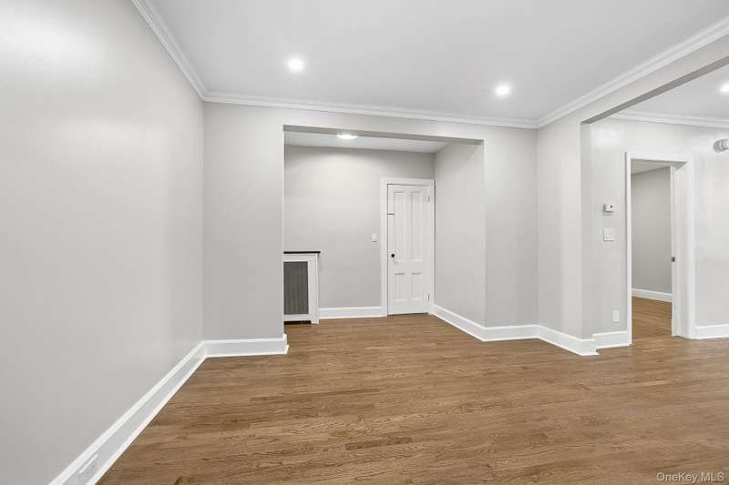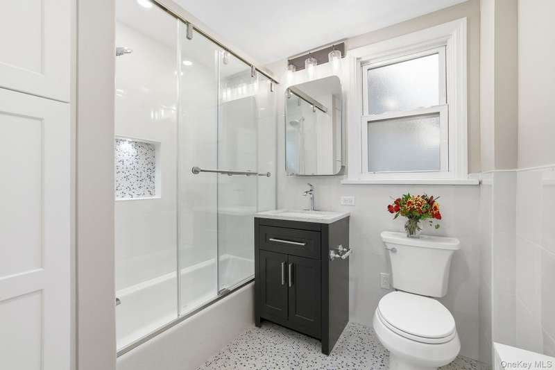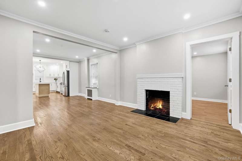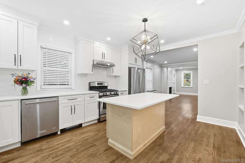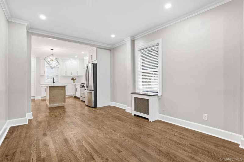 This first floor apartment is newly renovated (2025). Rent includes shared use of the backyard, and parking of one-car in the shared garage plus driveway parking. Enter the front door to this multi-family house into a common entry hall, and then open the front door to this terrific apartment with its entry foyer and oversized coat closet. The large living room features a decorative fireplace, recessed lighting and beautiful wood flooring. There is a spacious dining room with new recessed lighting that can accommodate a table for 6 or more. The eat-in kitchen, with the center island inviting casual seating, has stainless steel appliances, new cabinetry, a wall of open storage shelves, quartz countertops, a recessed light over the sink and an impressive chandelier. There is a wall of cedar-lined closets in the primary bedroom, and the second bedroom and primary both have new recessed lighting. The fully renovated bathroom includes new tile, lighting and fixtures and includes a linen closet. In the kitchen is the door to the lower level and to the backyard. The lower level has new ceramic tile floors throughout the finished storage area. The laundry room has new full-size washer and dryer and stainless steel sink. There is a new bathroom with a shower stall and sliding glass doors, in addition to an extra storage room. Landlord pays for gas (heat and cooking) and water. Two cats/small dogs permitted with prior interview. Minimum credit score of 700 necessary. Convenient to parkways, bus transportation, shops, restaurants, train.