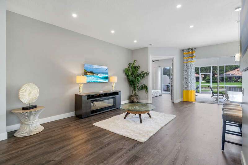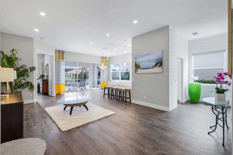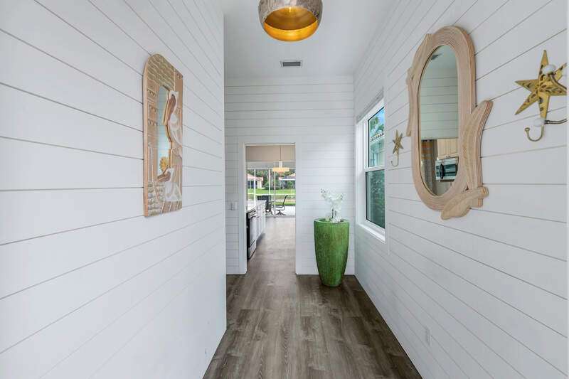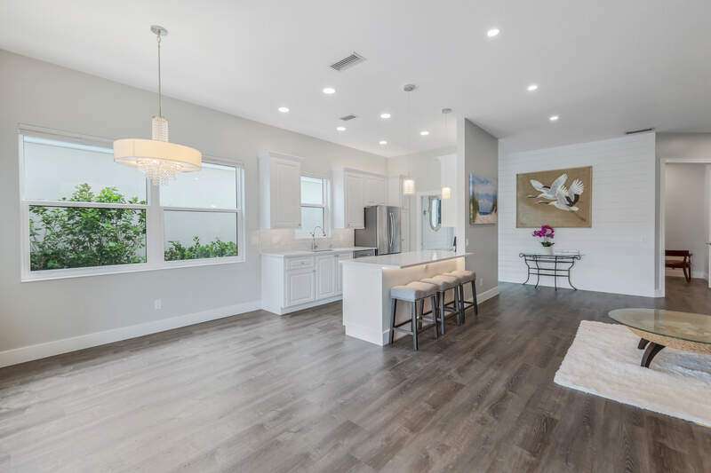 Magnificent totally remodeled Glenwood SINGLE FAMILY home. NOT attached villa. This Glenwood model is one of just 34 in the community and remodeled like no other. All windows and front door were replaced with Impact Windows. With a stroke of genius, the standard Divosta glass bricks in both bathrooms and the laundry have been replace with supper modern impact "no see-through fogged glass" which lets in natural light. Modern fans, plumbing fixtures, and new window treatments. This home features Smart Home technology with security system, door locks & Lutron light switches. As you enter the home you are greeted with white shiplap paneling that sets the stage for an amazing remodel. Kitchen remodeled with gorgeous Quartz counter tops and stainless-steel Samsung appliances. All main areas including kitchen, bedrooms, bathrooms, closets and laundry feature beautiful Luxury Vinyl flooring. The entire home was retrofitted with gorgeous high-top LED in every room, including the garage, with Lutron light switches. High-tech security system on the inside and exterior including motion detectors, smart door locks and door alarms. New roof in 2018. Newer HVAC system and washer/dryer. Two new ELECTRIC KEVKAR HURRICANE SCREENS added on lanai to protect your home from debris and high winds while Maintaining Visibility and Natural Light. No need to bring the lanai furniture inside the home during a storm. Amenities in Village Walk are perfect for those who love an active lifestyle. Enjoy bocce, 3 swimming pools, one of which is a lap pool, walking paths and numerous bridges, 6 tennis courts and 3 pickleball courts. The Spot Restaurant is a very popular and a great place to eat delicious food, meet new friends, play trivia on Thursdays and all enhanced by a friendly staff. Very Dog-friendly community with up to 3 large dogs. Partially furnished. Superb location. About 4 miles to popular Mercado dinning and another mile to Vanderbilt beach.