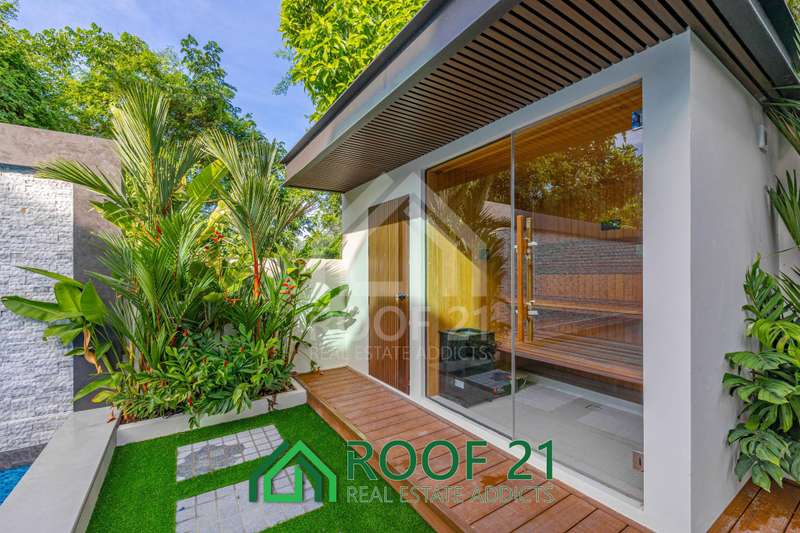 * Large private swimming pool with outdoor lounge area and sauna room.